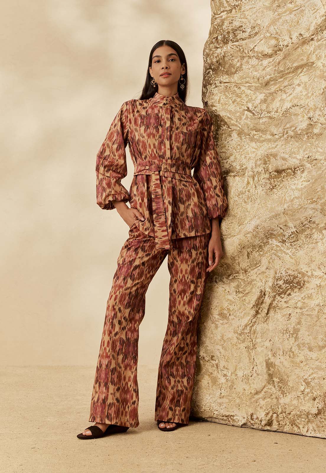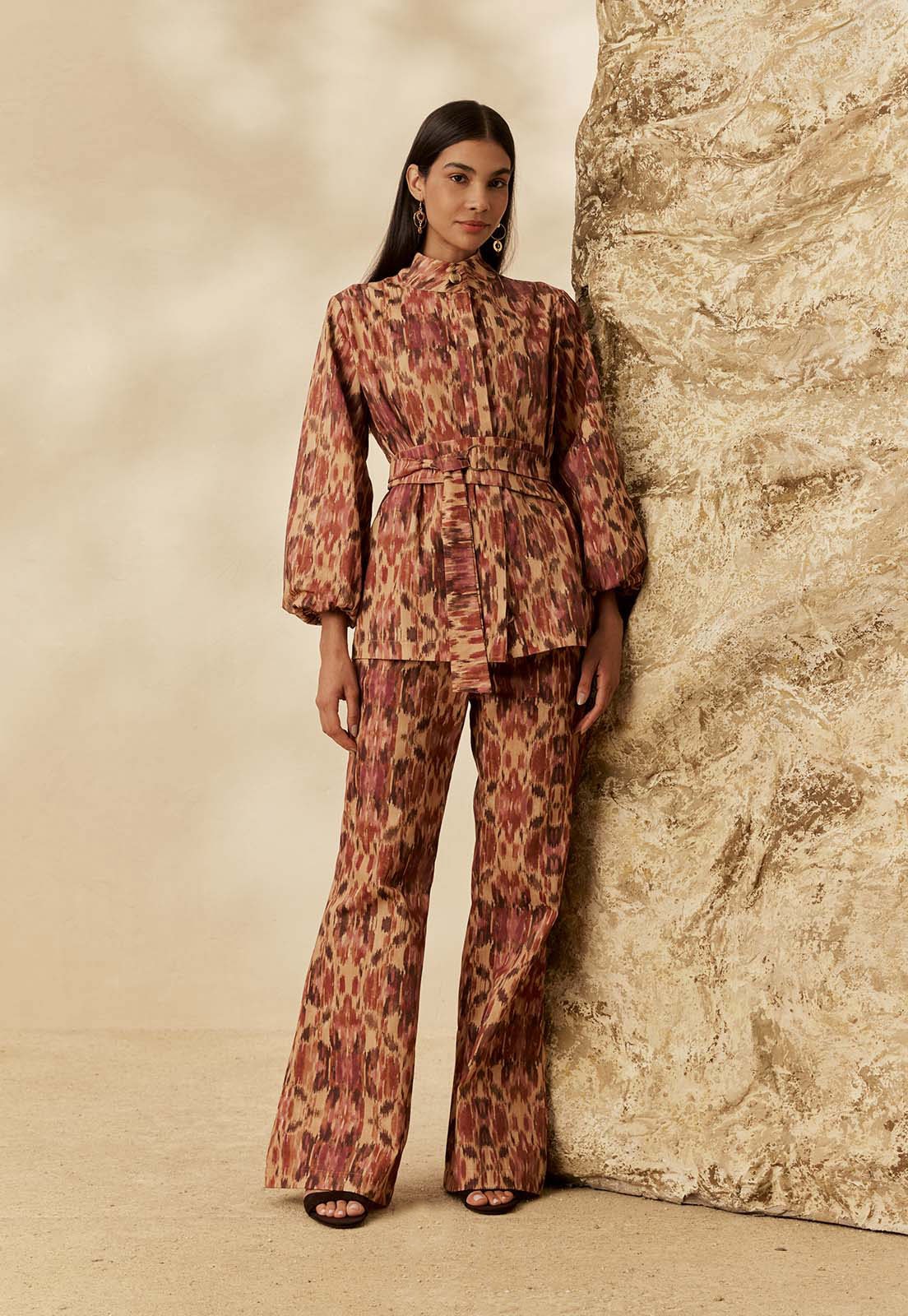 A Calça Flare Estampada Niebla da CaCay apresenta modelagem elegante com caimento que valoriza o corpo em leve amplitude no quadril e segue com comprimento alongado, criando uma silhueta fluida. A forma é grande, então se estiver em dúvida entre dois tamanhos, recomendamos optar pelo menor e consultar a tabela de medidas para precisão. Na foto, a modelo tem 1,75m, veste manequim 36 e usa o tamanho P.