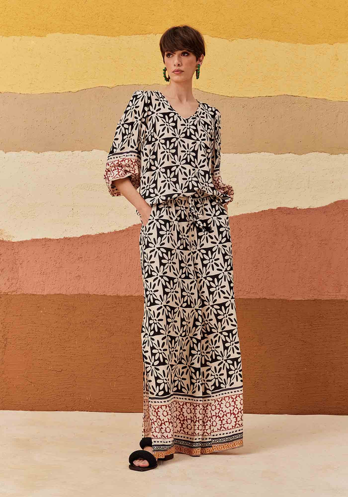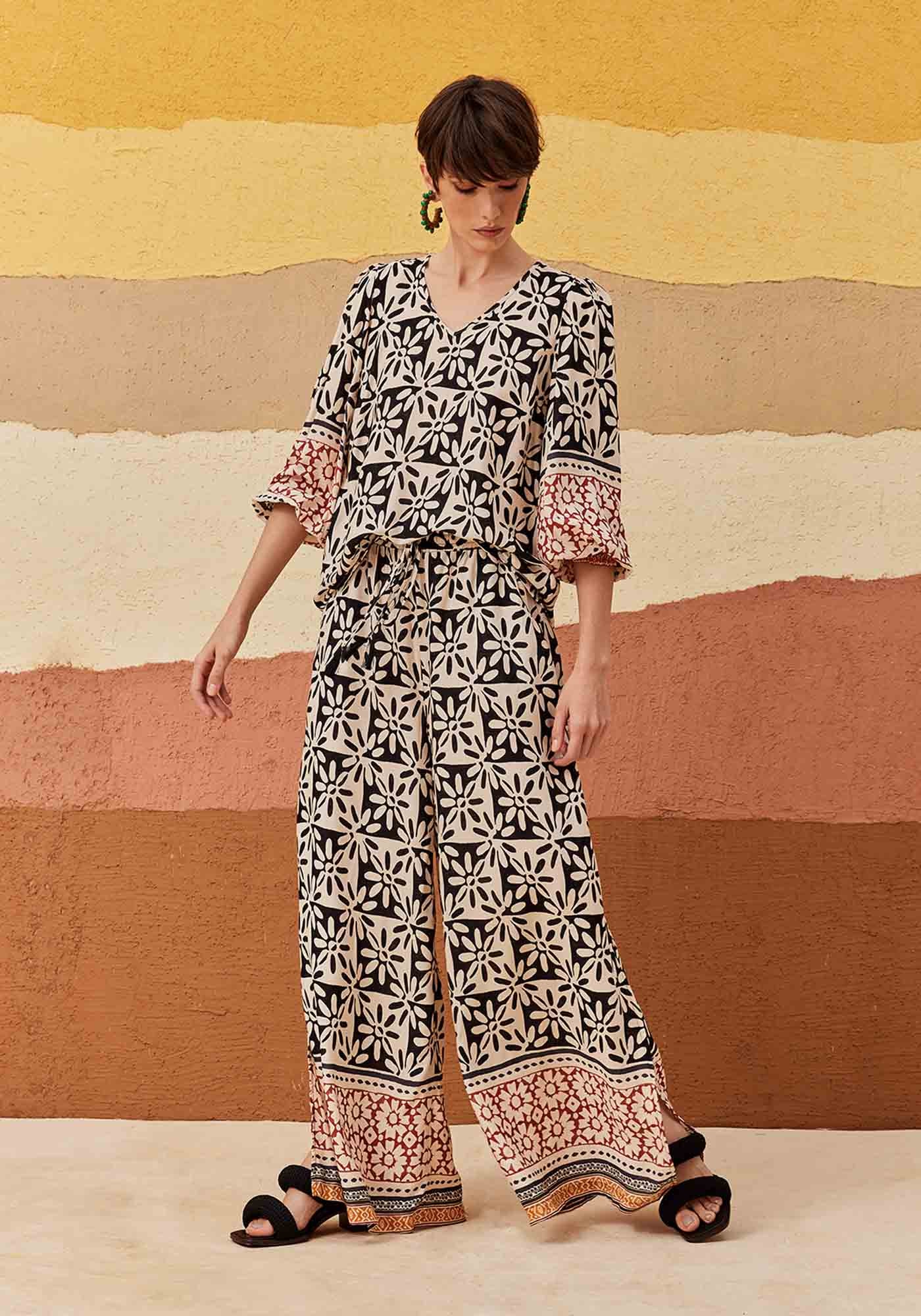 Confeccionada em tecido 100% viscose, a calça estampada Salta é um modelo que possui elástico na cintura e amarração em túnel na parte da frente. Os bolsos são práticos e a fenda lateralproporcionam fluidez e movimento.