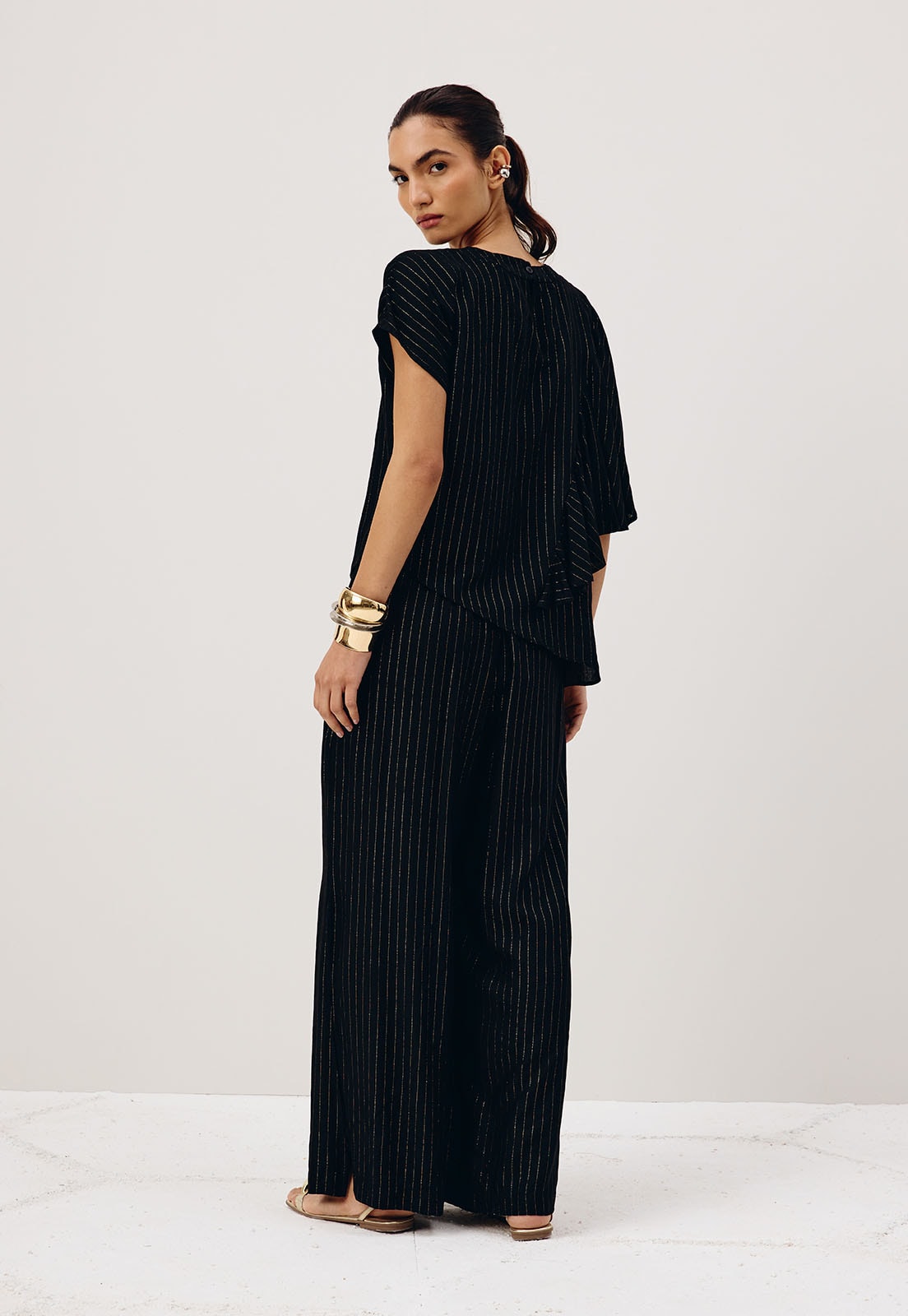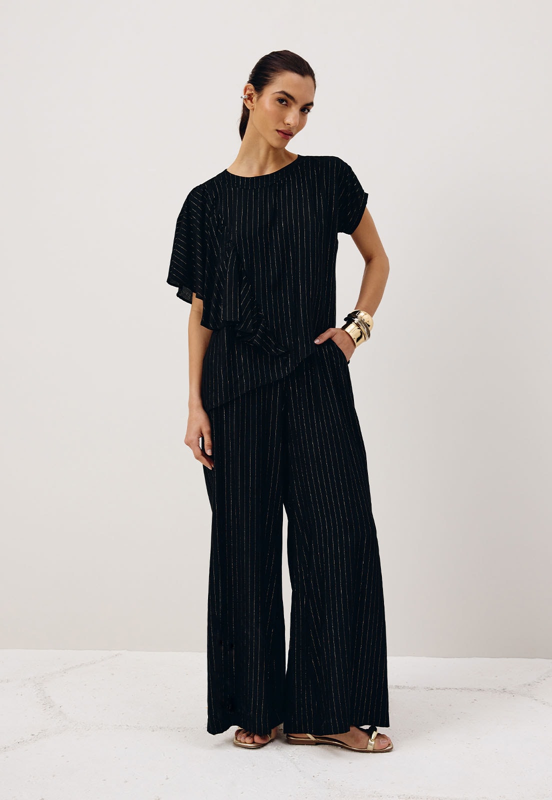 A calça listrada é um modelo elegante e sofisticado. Confeccionada em tecido 99% viscose e 1% poliéster, possui cintura alta com pala e elástico nas costas, favorecendo a vestibilidade e usabilidade da peça. Além disso, o modelo possui fendas laterais.