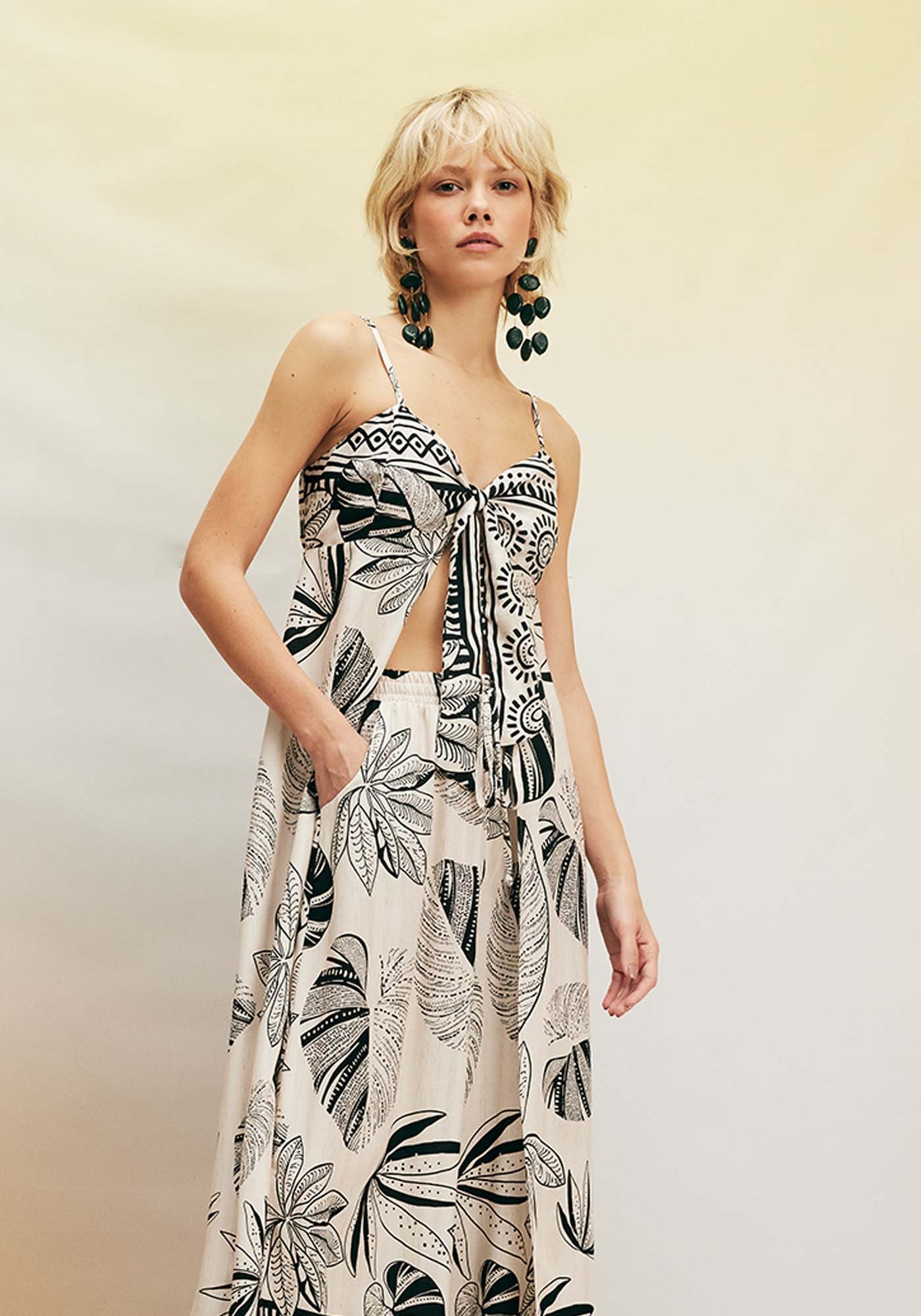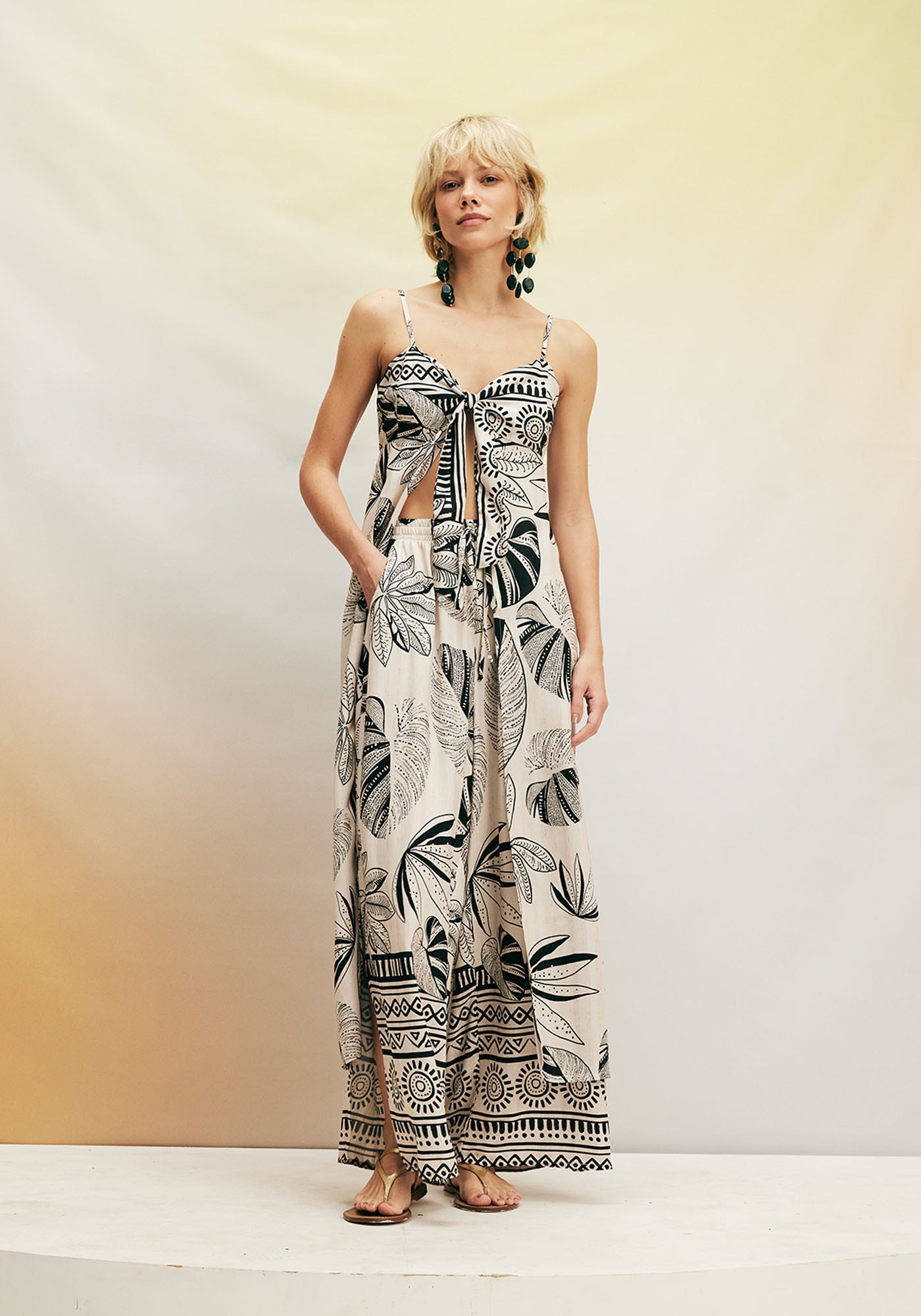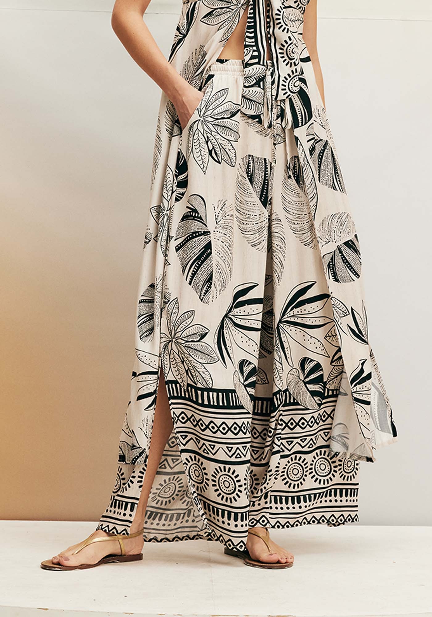 Confeccionada com uma refinada mistura deviscose (97%) e linho (3%), esta elegante calça pantalona adiciona estilo e fluidezaos seus dias. A modelagem, com cós elástico e fendas laterais, proporciona nãoapenas conforto, mas também uma dose de elegância versátil para diversasocasiões em seu cotidiano. Uma escolha sofisticada para um visual impecável emtodas as situações.
