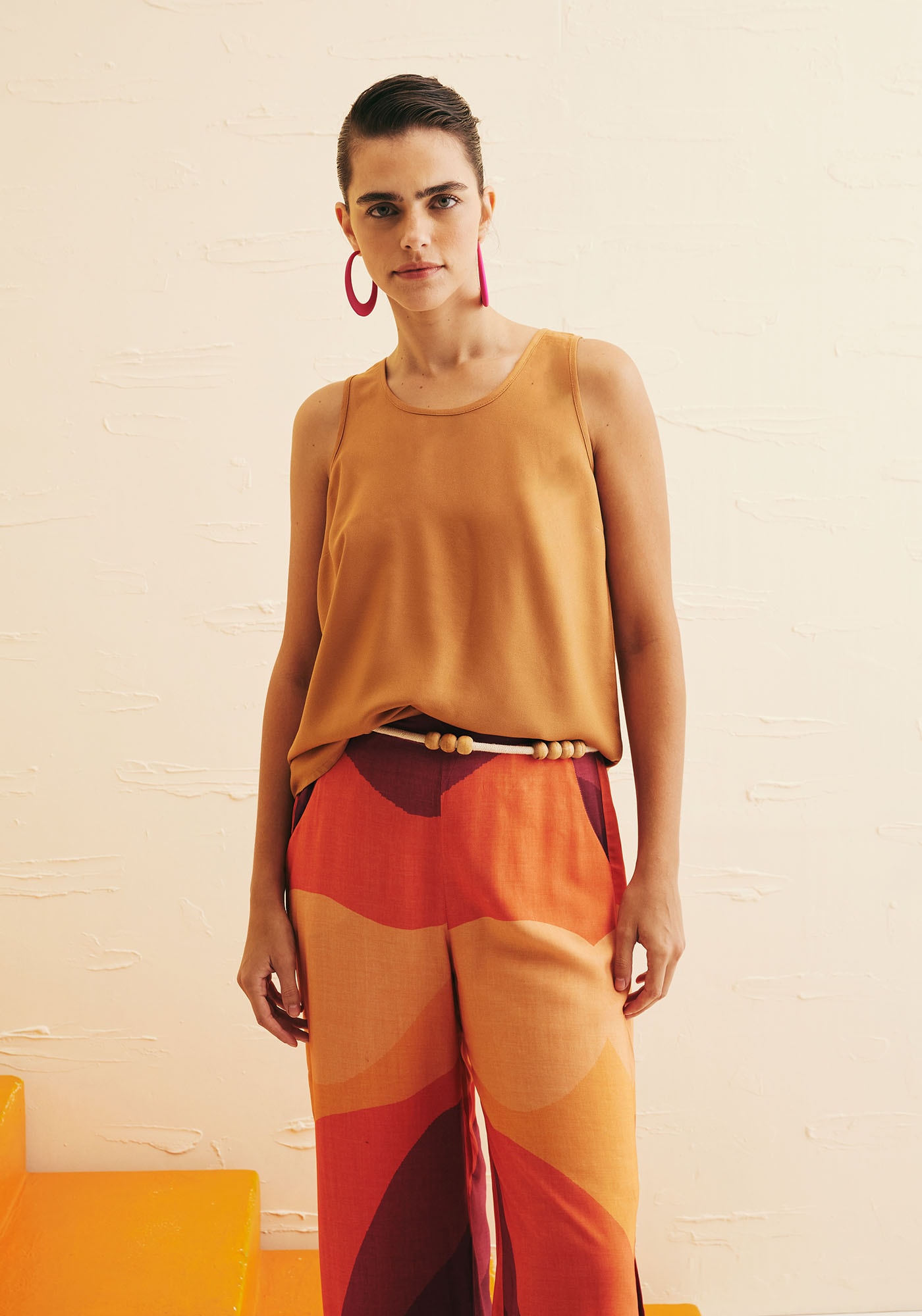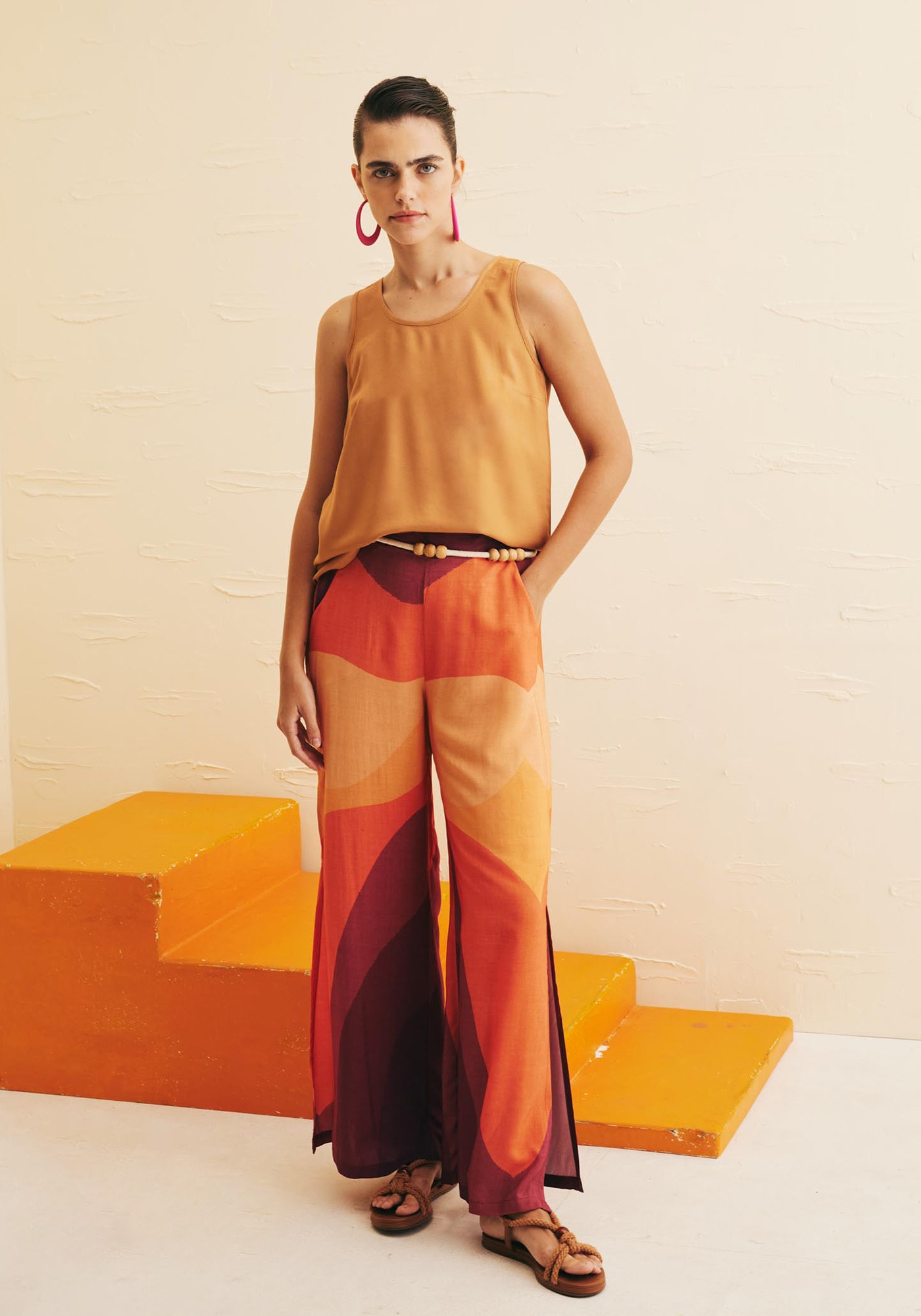 Confeccionado em tecido 100% viscose, a calçapantalona estampada é um modelo que deixa o look sofisticado e moderno. A peçapossui bolsos em faca, adicionando praticidade à calça. O modelo possui pala elastex na parte trás, se adequando a diferentes corpos.