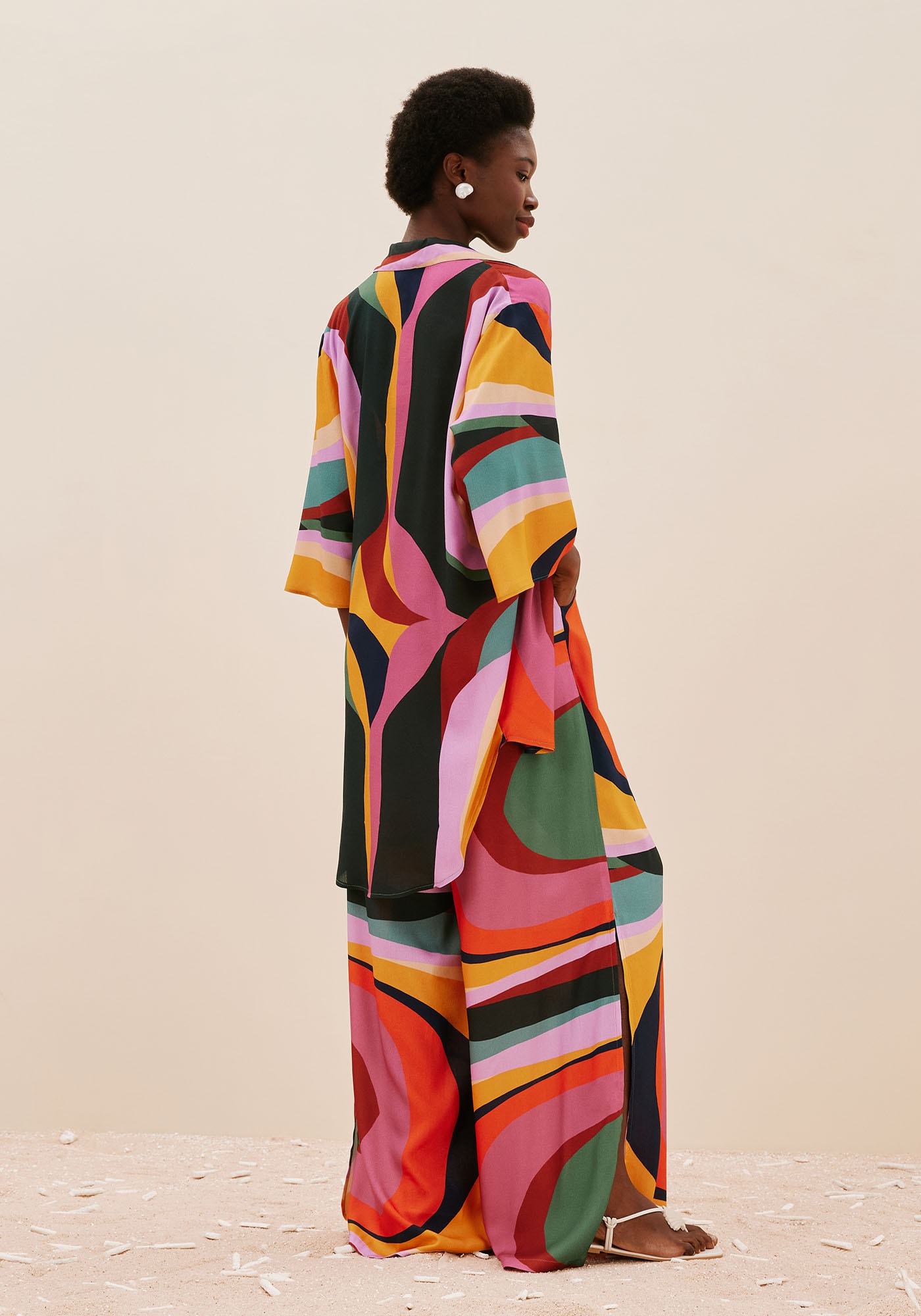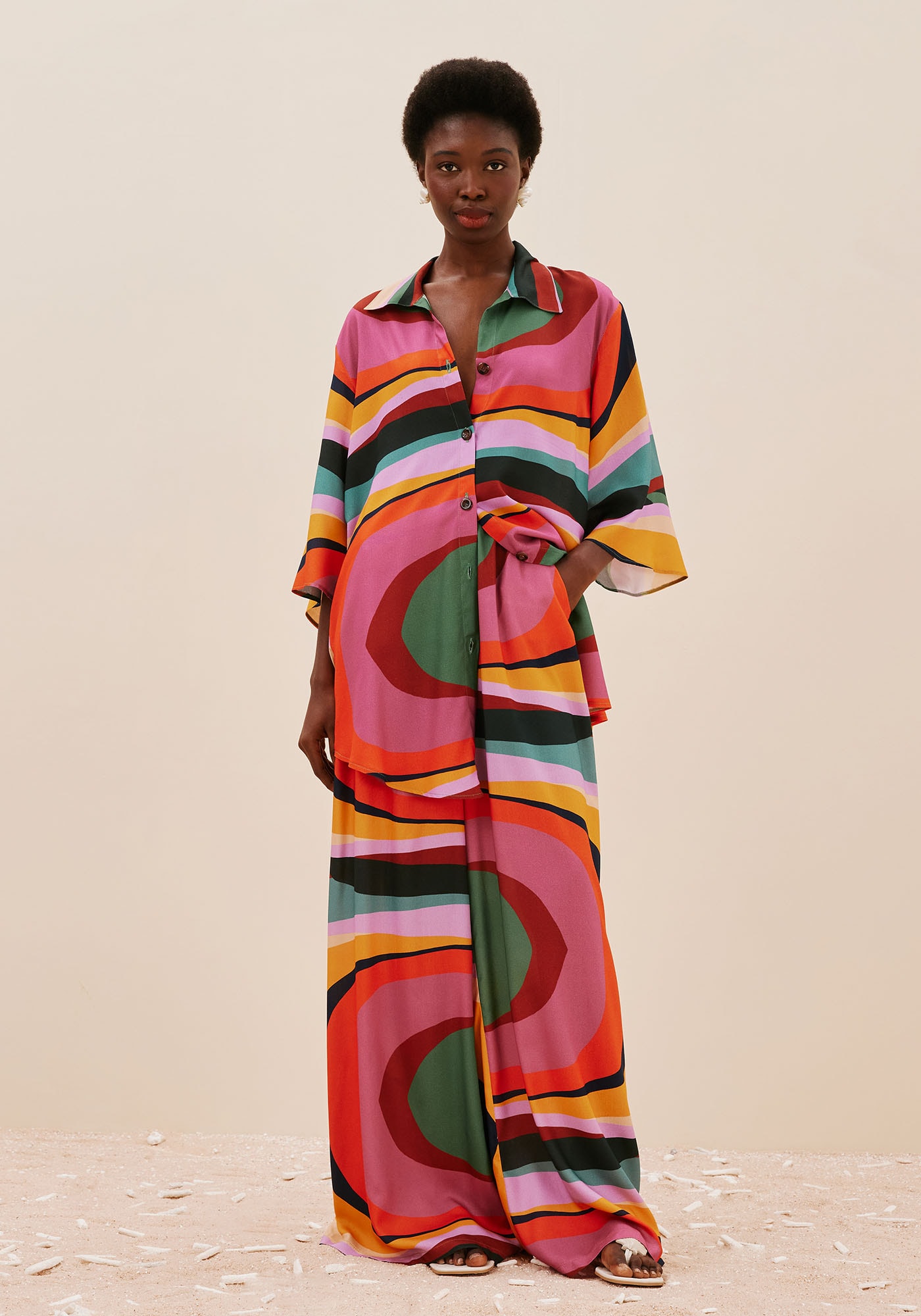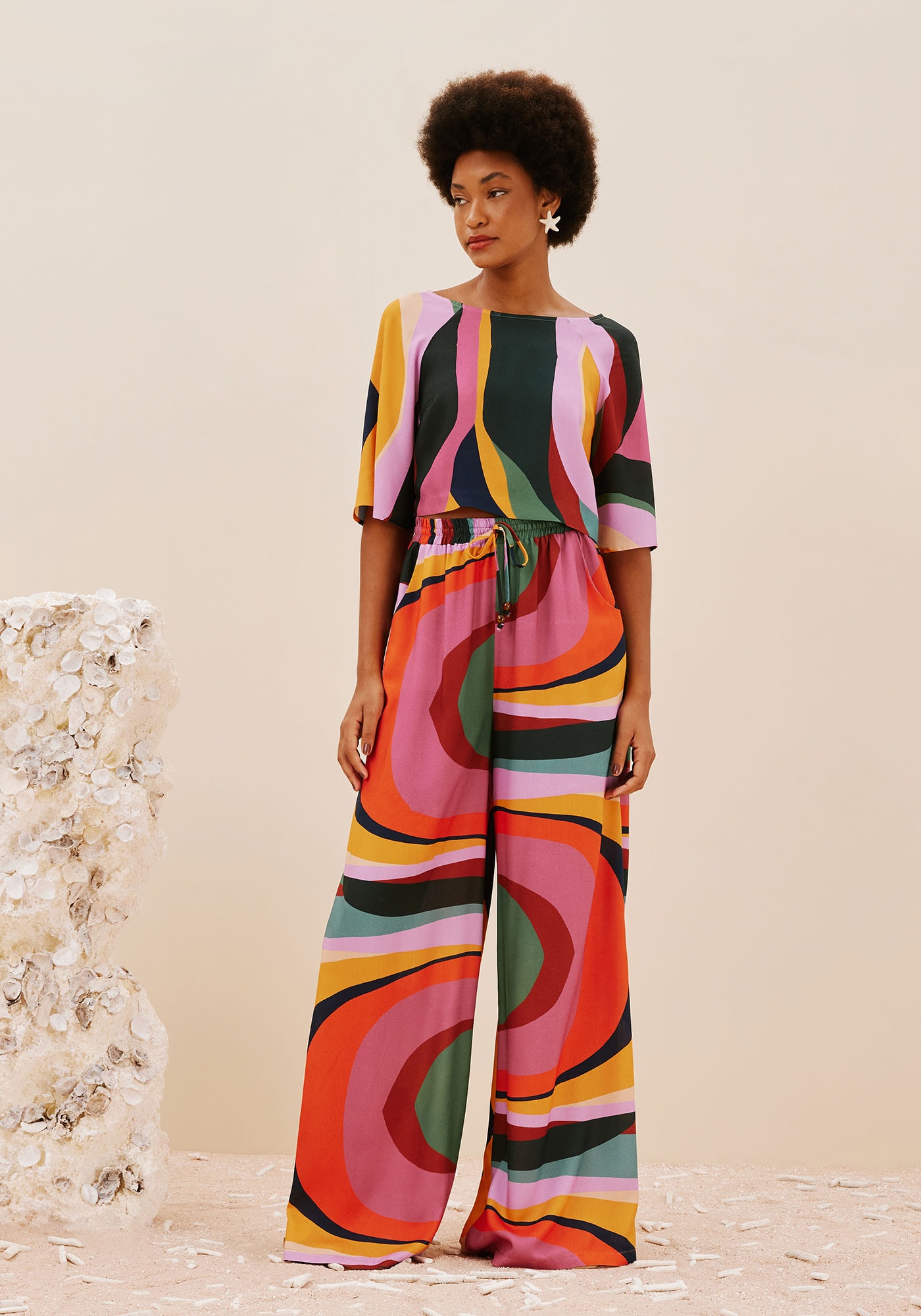 Esta Calça Pantalona se destacapor nossa estampa exclusiva Marés e é uma peça que proporciona leveza efluidez, ideal para o verão. O modelo conta com elástico na cintura e amarraçãofrontal que permitem um ajuste personalizado ao corpo, além das fendas lateraisque proporcionam liberdade de movimento. É confeccionada em 100% viscose.