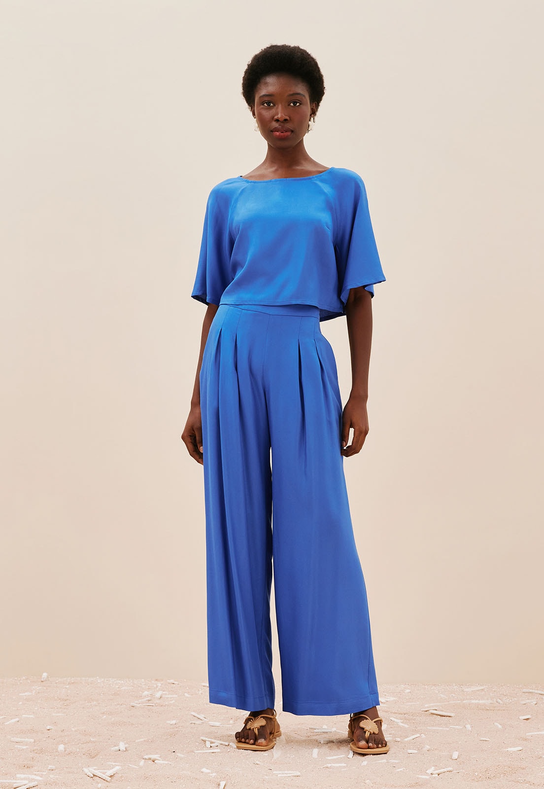 A calça pantalona é confeccionada em tecido 100% viscose. O modelo cintura alta é elegante e possui pala na cintura com fechamento em zíper nas costas. As pregas na parte da frente deixam o modelo mais sofisticado.