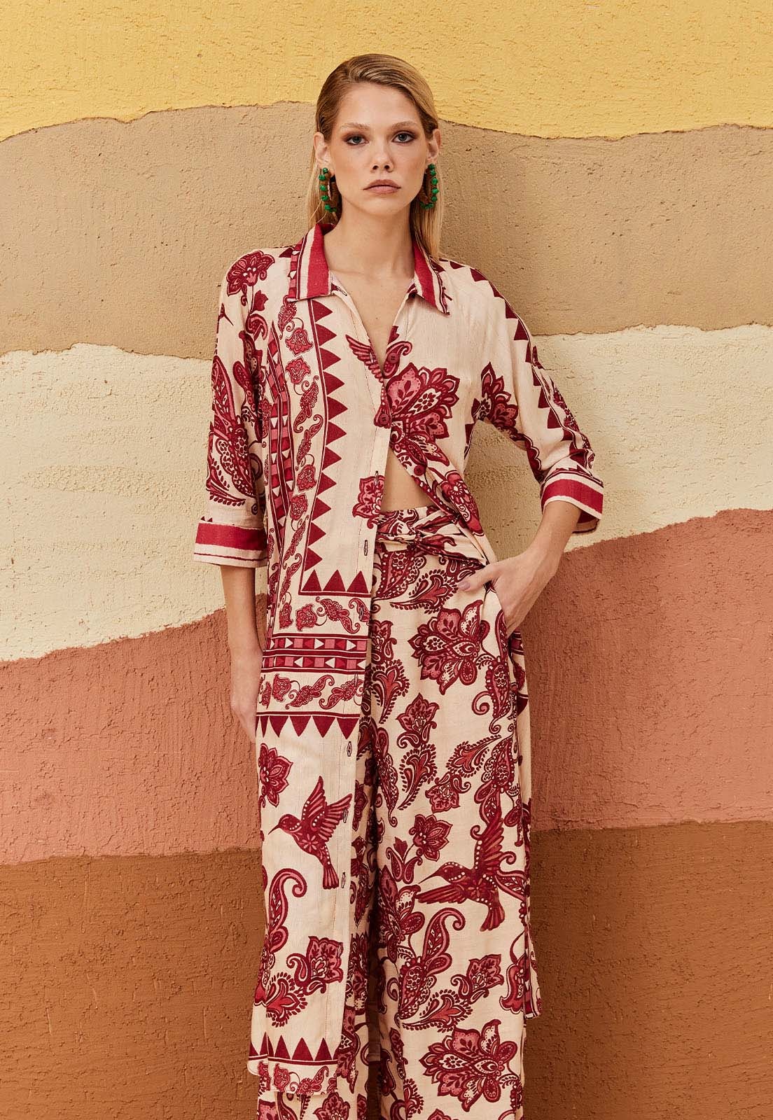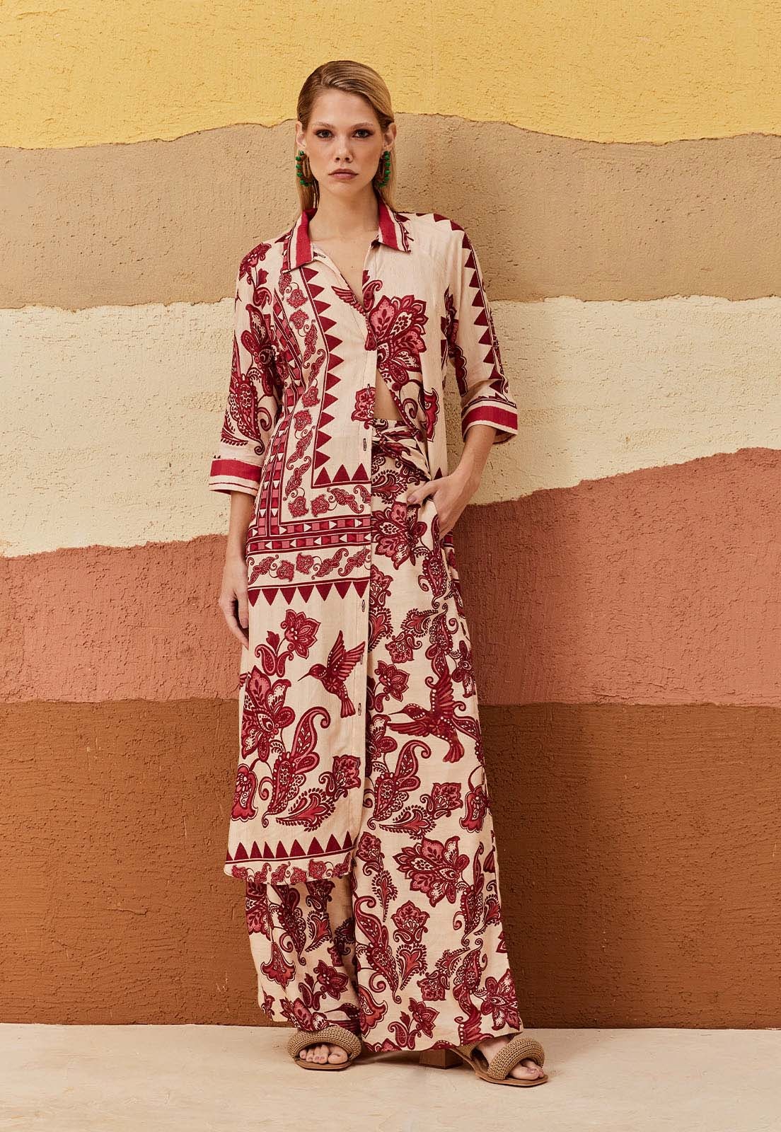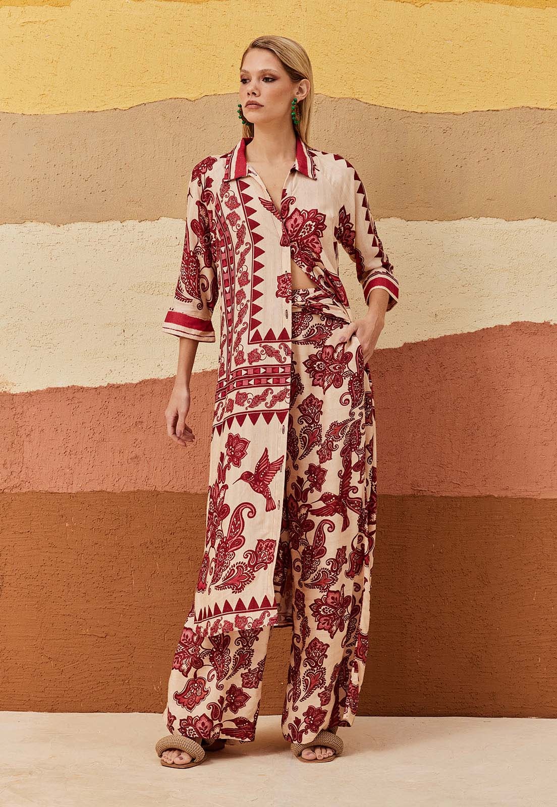 A Calça Pantalona Cós Transpassado Estampada Cuyo é a união perfeita entre conforto e sofisticação. Confeccionada em 97% viscose e 3% linho, seu tecido leve e respirável garante fluidez e liberdade de movimento, ideal para quem valoriza peças versáteis e estilosas. O cós transpassado proporciona ajuste confortável e valoriza a cintura com um toque moderno, enquanto a modelagem ampla alonga a silhueta e confere elegância ao caminhar. A estampa artística com elementos florais adiciona personalidade à peça, tornando-a ideal para composições que vão do casual ao sofisticado.