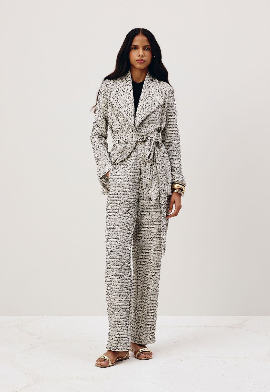 A calça pantalona é confeccionada tweed 55% algodão 44% poliester e 1% elastano. É um modelo cintura alta aconchegante e confortável, perfeito para o inverno.Possuipala com elástico na parte de trás e bolsos laterais.