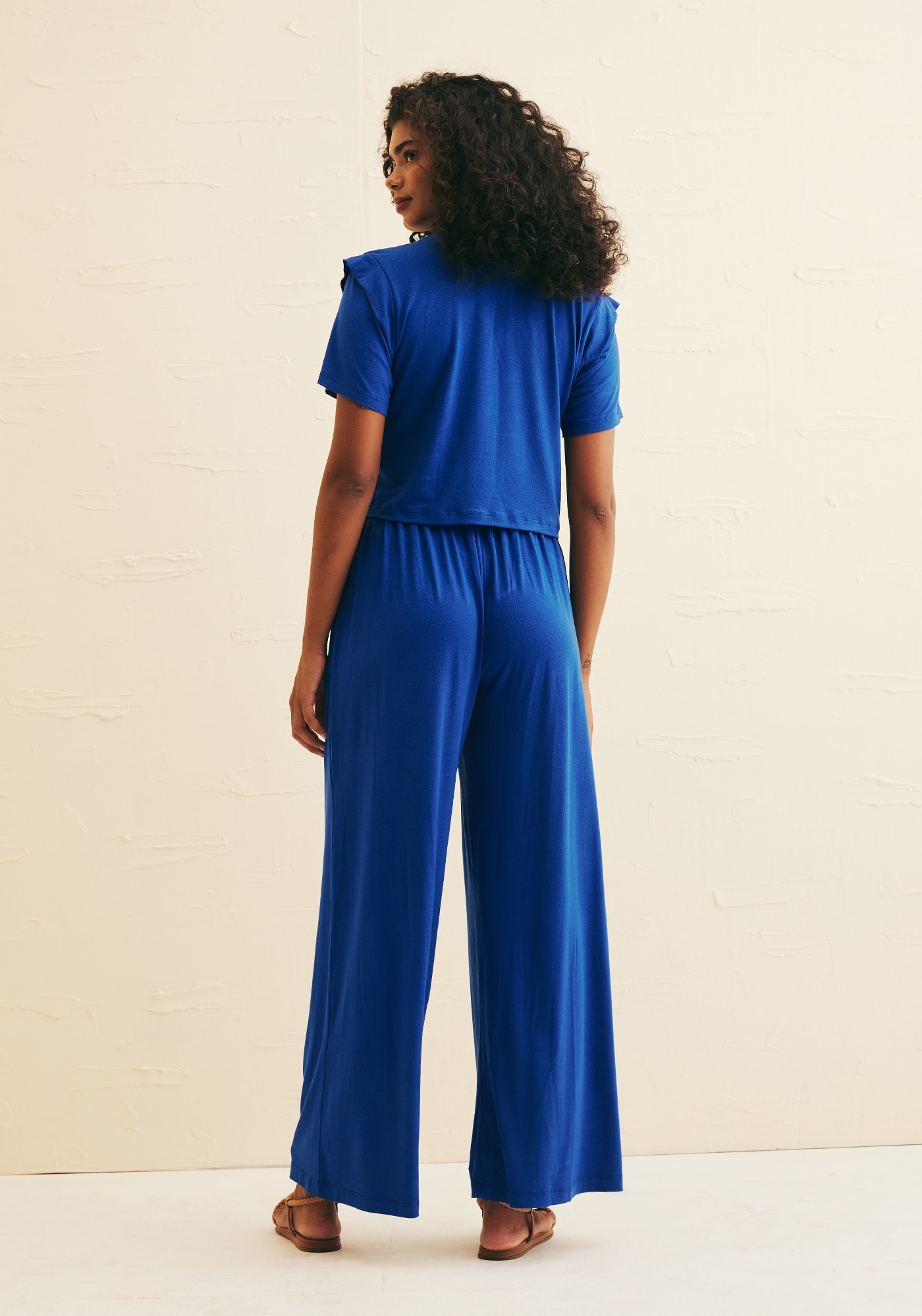 Confeccionada em tecido 96% viscose 4%elastano, a calça pantalona é super confortável. O modelo conta com elástico eamarração na cintura e bolsos laterais, adicionando praticidade e favorecendo avestibilidade da peça.
