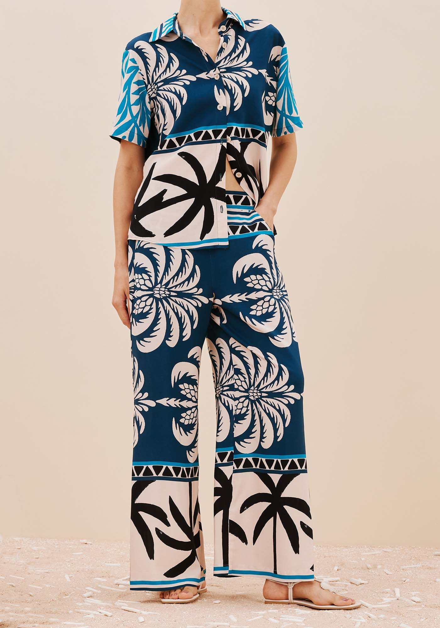 Para os dias em que o estilo encontra o conforto, a calça pantalona elástico Estampada Blue Bay é a escolha certa. Com pala na cintura e lastex nas costas, ela garante um ajuste perfeito e um caimento impecável. Os bolsos frontais e as fendas laterais adicionam praticidade enquanto as fendas na lateral conferem liberdade de movimento à peça. Feita em 100% Viscose, ela é leve, fluida e estampada, ideal para quem busca um visual moderno e cheio de personalidade. Perfeita para compor looks sofisticados e cheios de atitude.