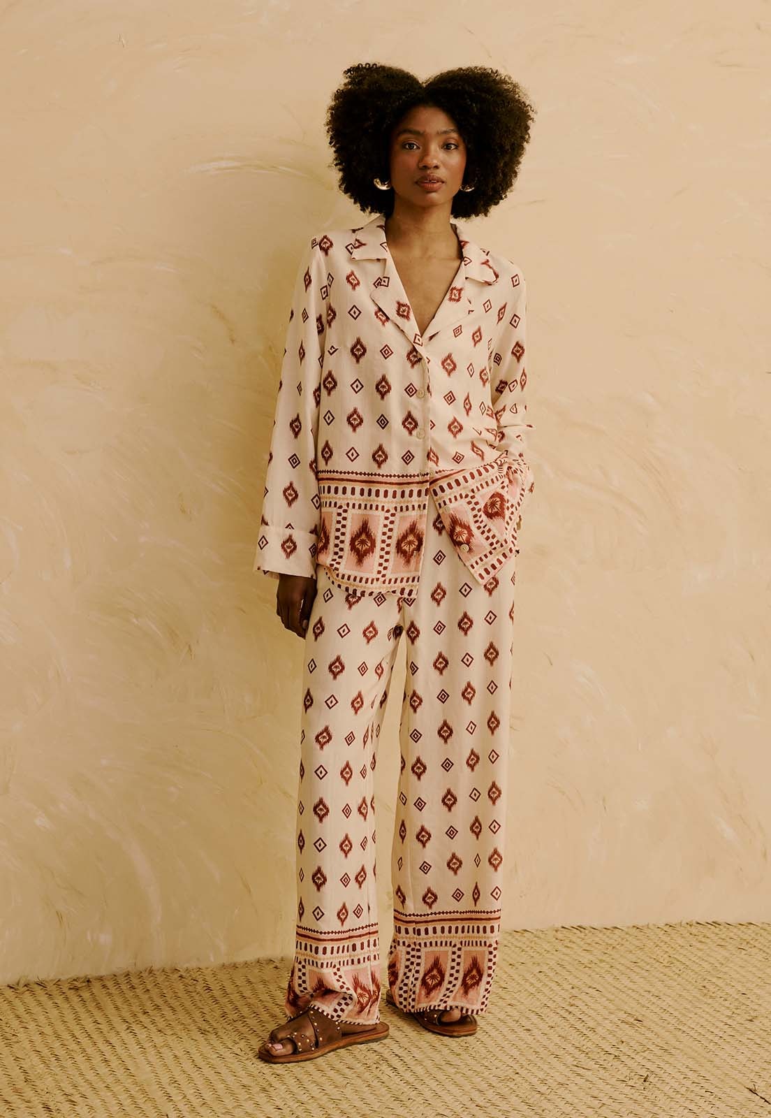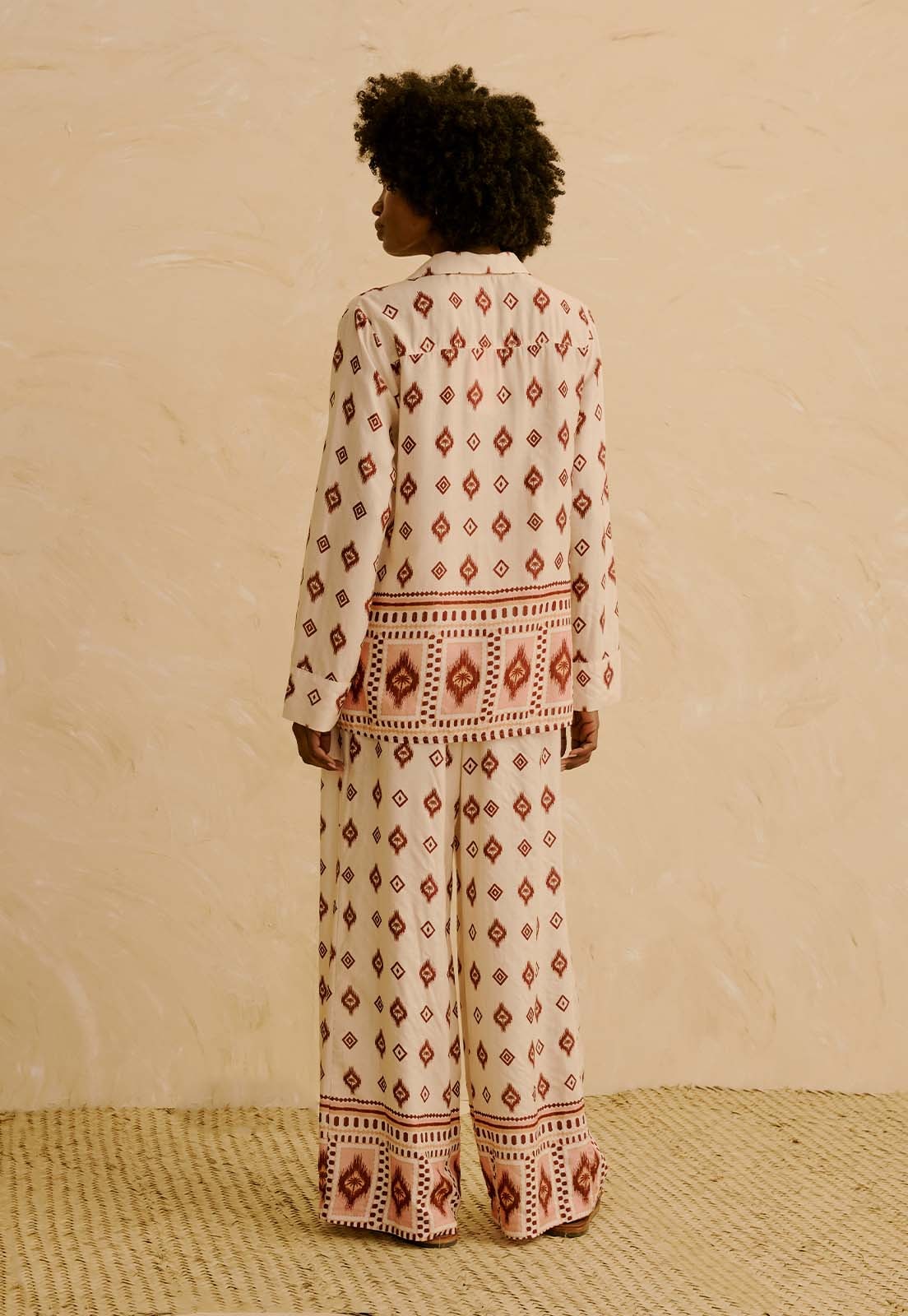 A Calça Pantalona Estampada Coité da CaCay tem modelagem ampla e fluida, com caimento solto desde a cintura até a barra, valorizando o quadril sem marcar e oferecendo conforto prolongado. O comprimento é longo, ideal para usar com rasteiras ou salto baixo. A forma é grande. Se estiver em dúvida entre dois tamanhos, recomendamos escolher o menor, sempre conferindo a tabela de medidas. A modelo da foto tem 1,75m, veste manequim 36 e está usando o tamanho P.