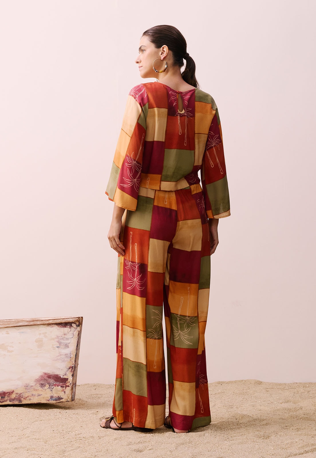 A modelo veste tamanho P e mede 1,77m, evidenciando o caimento impecável da pantalona. A composição do look nas imagens mostra como a peça pode ser combinada com blusas coordenadas ou tops neutros, criando produções versáteis do casual ao elegante. Ideal para quem busca autenticidade, movimento e arte no vestir, essa calça é um convite para se expressar com liberdade.