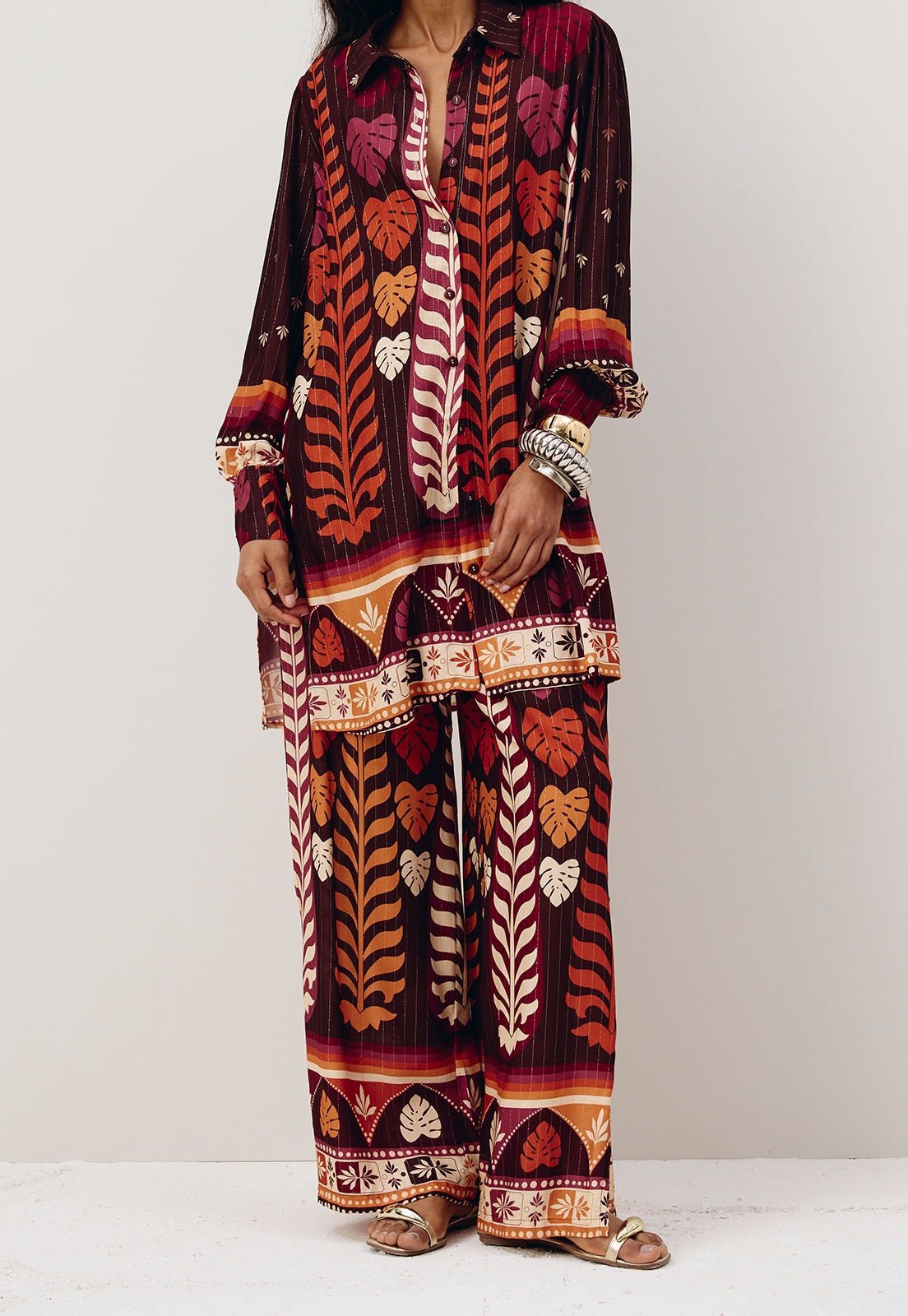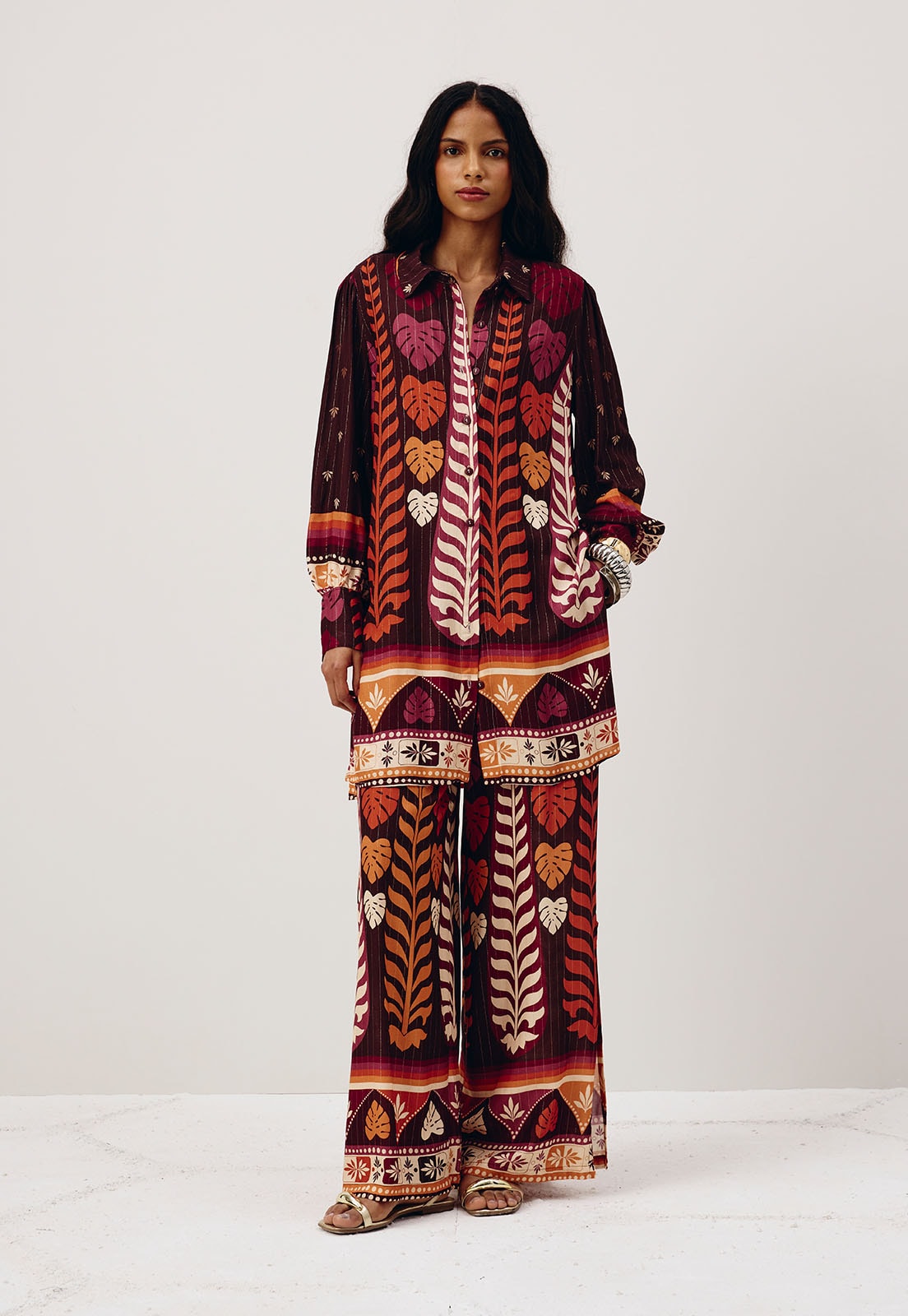 A calçaestampada Hera é confeccionada em tecido 99% viscose 1% poliéster.É um modelo pantalona cintura alta, que possui pala na parte da frente e elástico nas costas, além dos bolsos laterais.