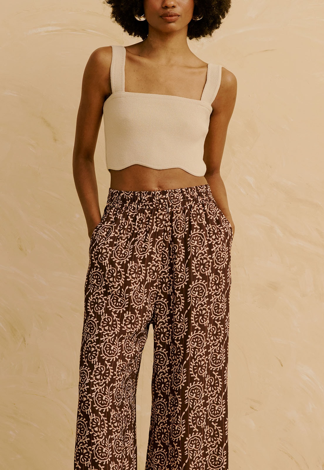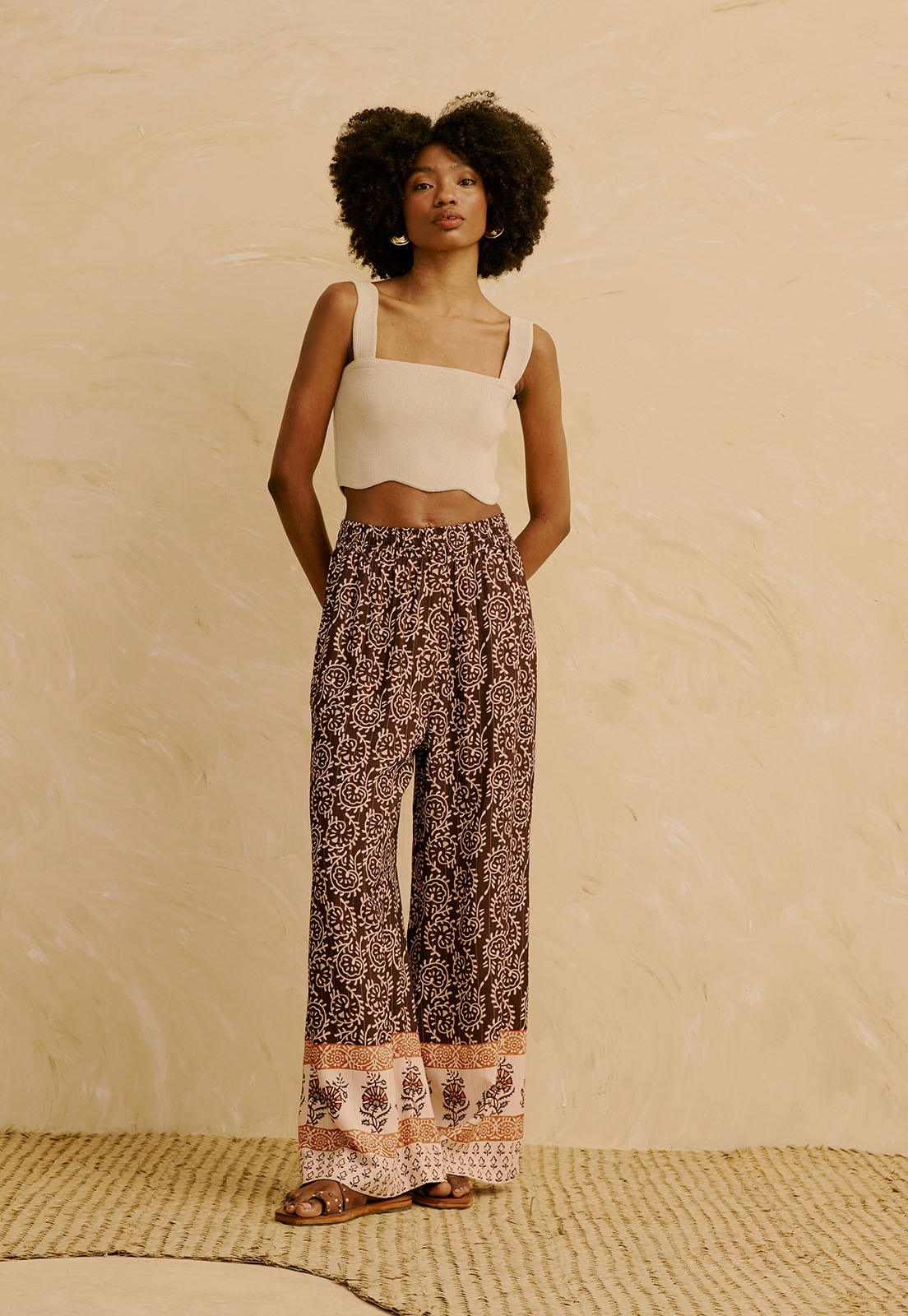 A Calça Pantalona Estampada Kala da CaCay tem modelagem ampla e elegante, com caimento solto no quadril e cintura confortável, valorizando o movimento natural do corpo. A forma é grande, então se estiver em dúvida entre dois tamanhos, opte pelo menor e consulte a tabela de medidas para precisão. Na foto, a modelo tem 1,75m de altura, veste manequim 36 e usa o tamanho P.
