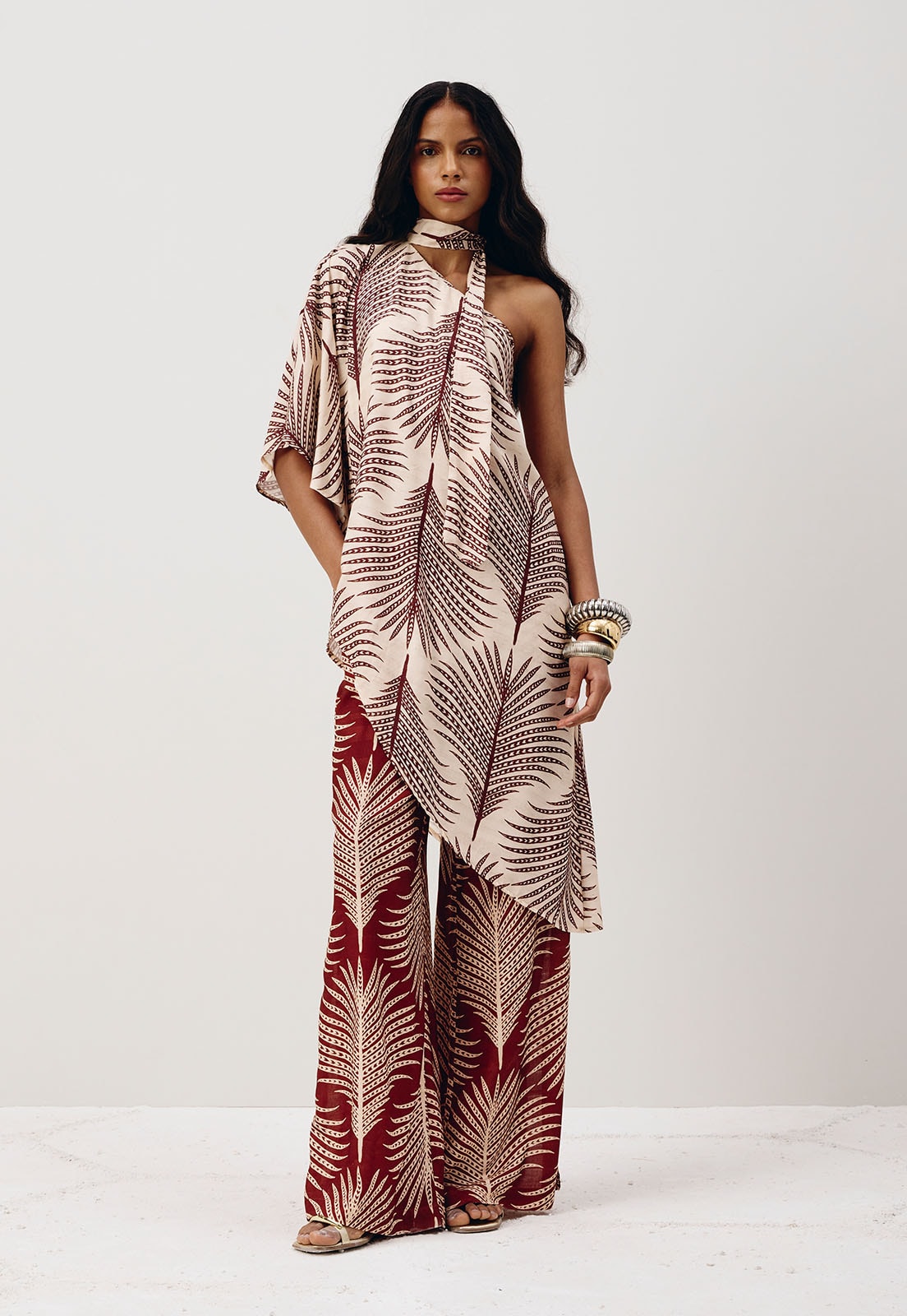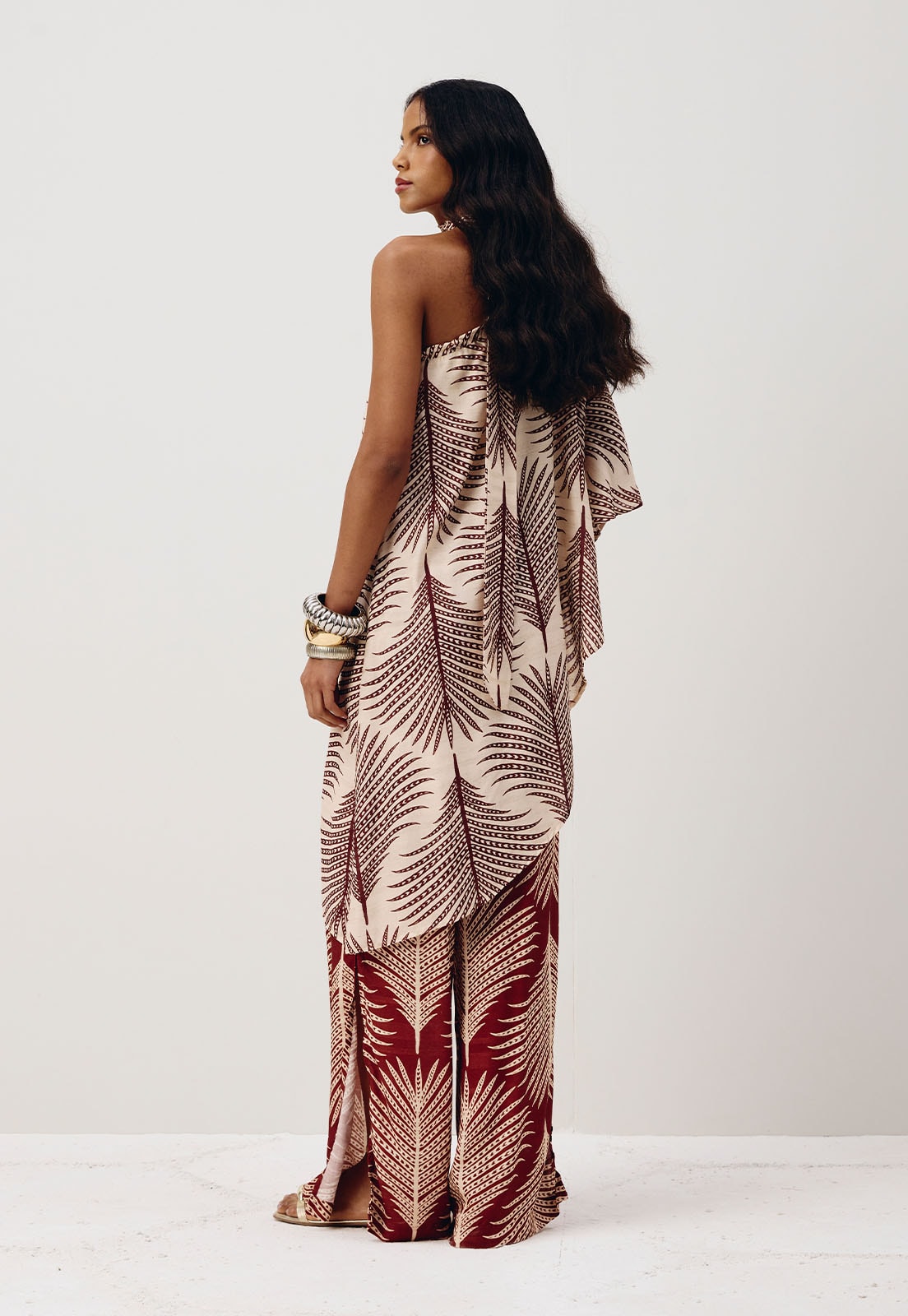 Com shape amplo e tecido leve, essa pantalona traz fluidez a cada passo. A pala com elástico na cintura garante conforto e caimento ajustado, enquanto a fenda lateral cria um movimento elegante e sutil. A estampa exclusiva Palmas imprime identidade à peça, perfeita para composições que misturam sofisticação e frescor. Feita em 97% Viscose e 3% Linho.