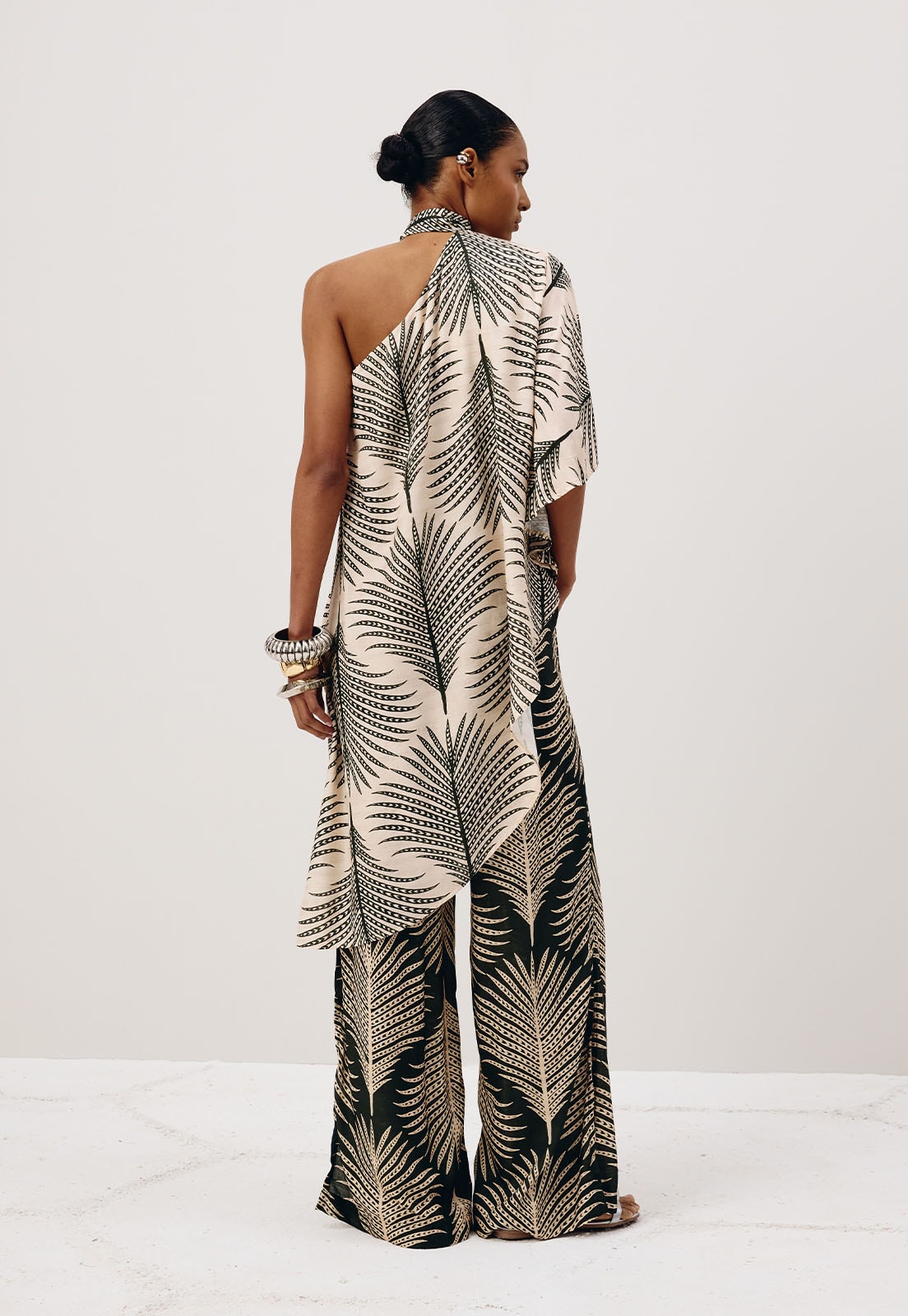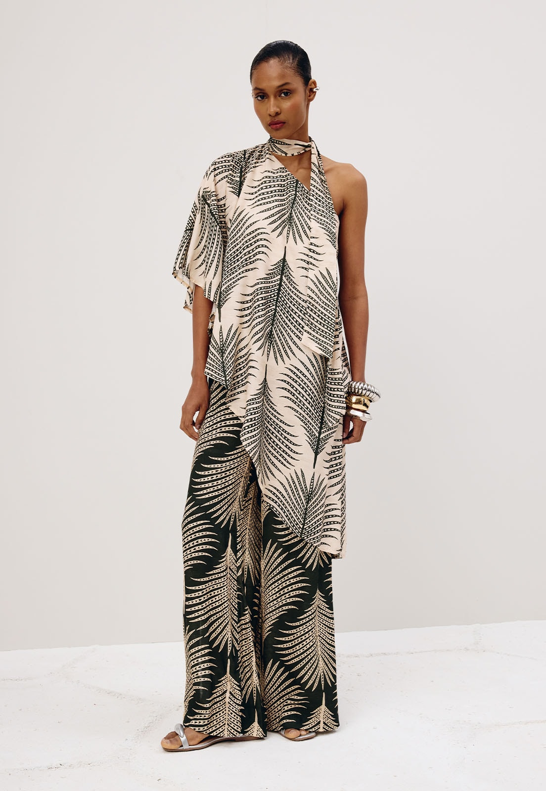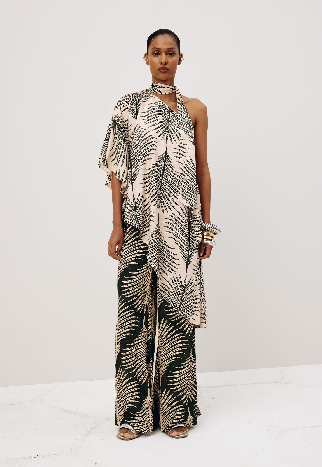 Com shape amplo e tecido leve, essa pantalona traz fluidez a cada passo. A pala com elástico na cintura garante conforto e caimento ajustado, enquanto a fenda lateral cria um movimento elegante e sutil. A estampa exclusiva Palmas imprime identidade à peça, perfeita para composições que misturam sofisticação e frescor. Feita em 97% Viscose e 3% Linho.
