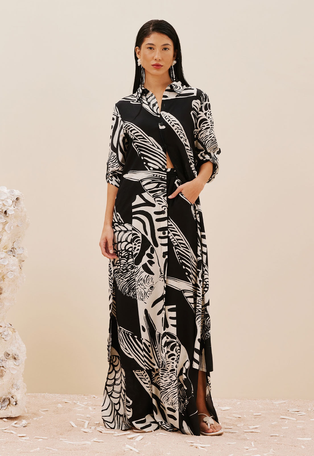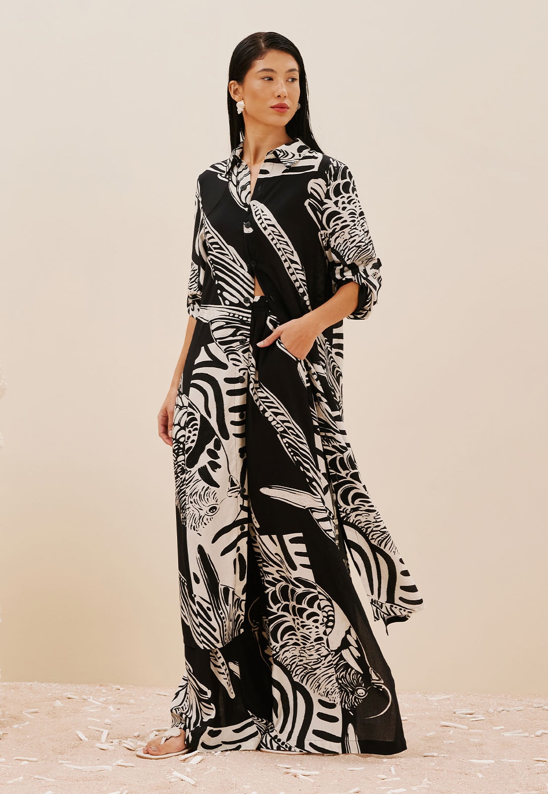 A calça pantalona ganha um novo significado com seu corteamplo e fluido, que se adapta ao movimento. Com pala em elástico na cintura,ela proporciona conforto durante todo o dia e um ajuste perfeito ao corpo. Asfendas laterais trazem um detalhe moderno, enquanto a estampa Plume em preto ebranco dá um toque sofisticado. Perfeita para quem busca um visualdescomplicado e estiloso ao mesmo tempo. É confeccionada em 100% Viscose.