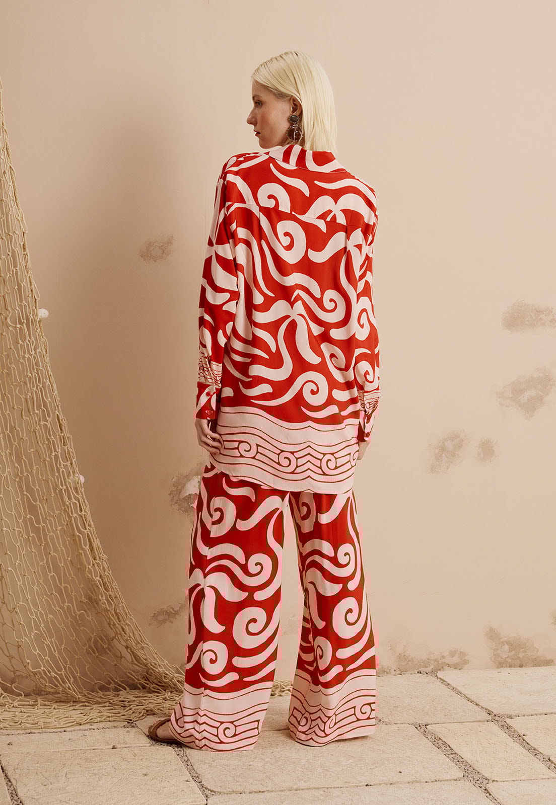 Versátil e atemporal, essa pantalona combina perfeitamente com blusas neutras, camisas fluidas ou até mesmo peças estampadas coordenadas, além de acessórios como sandálias de tiras, bolsas estruturadas e brincos orgânicos. A modelo veste tamanho P e tem 1,77m de altura, evidenciando o caimento solto e elegante da peça.