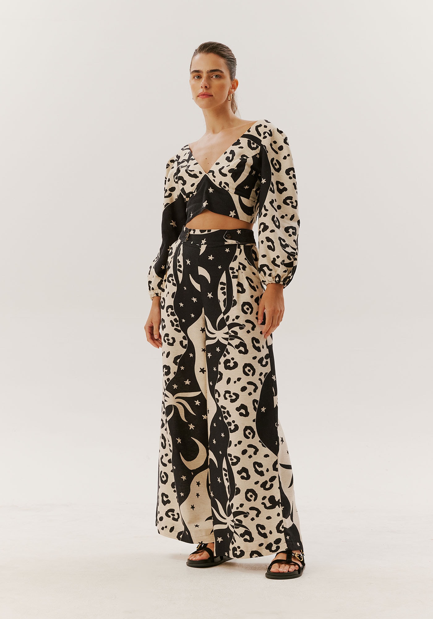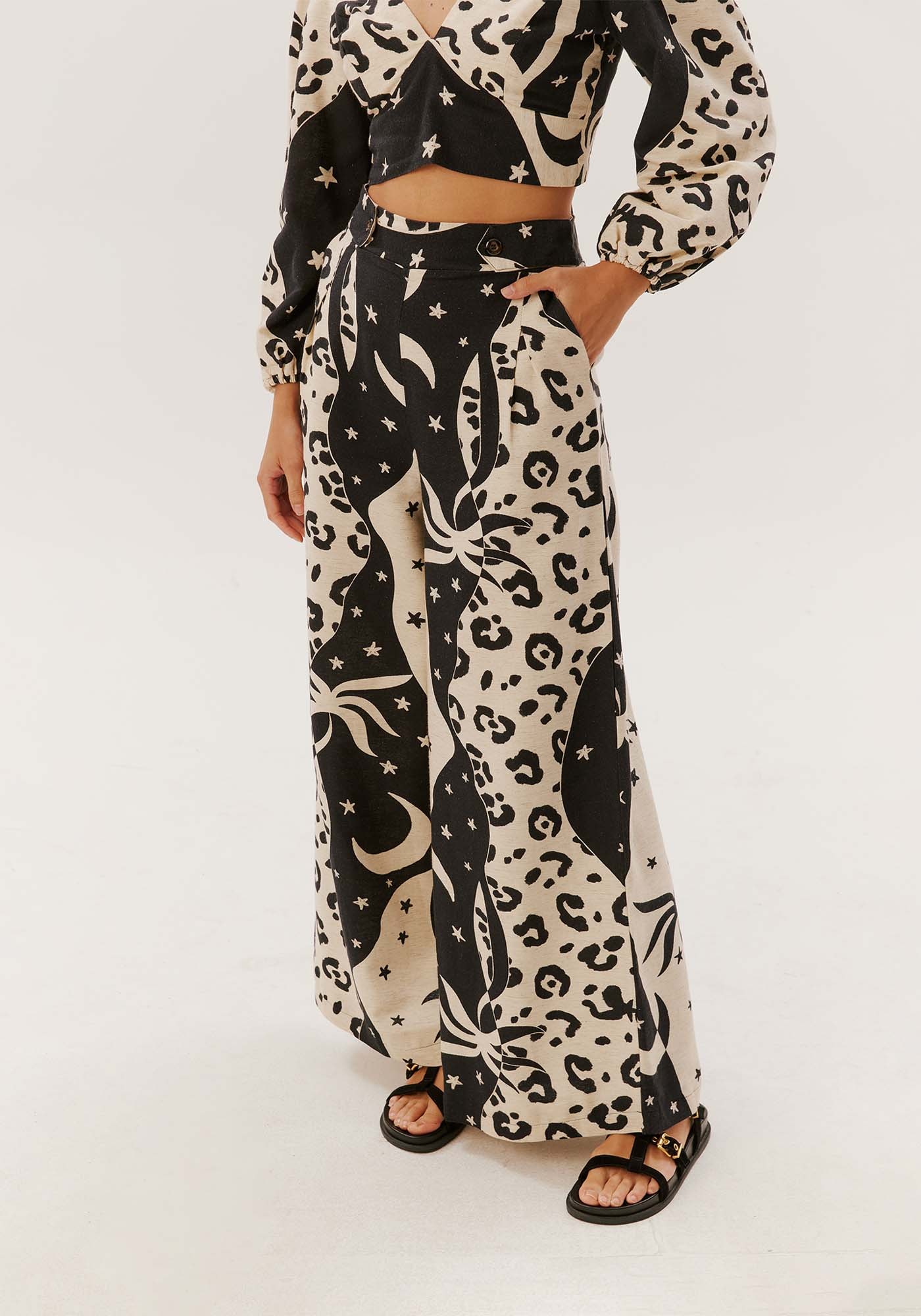 Elaborada com tecido 42% algodão 38%viscose 14% modal 6% linho, esta elegante calça pantalona combina modernidade,conforto e sofisticação, tornando-se uma escolha sublime para uma variedade deocasiões. Seu corte amplo proporciona não apenas estilo, mas também conforto eliberdade de movimento, enquanto os dois bolsos acrescentam um toque prático efuncional à peça.