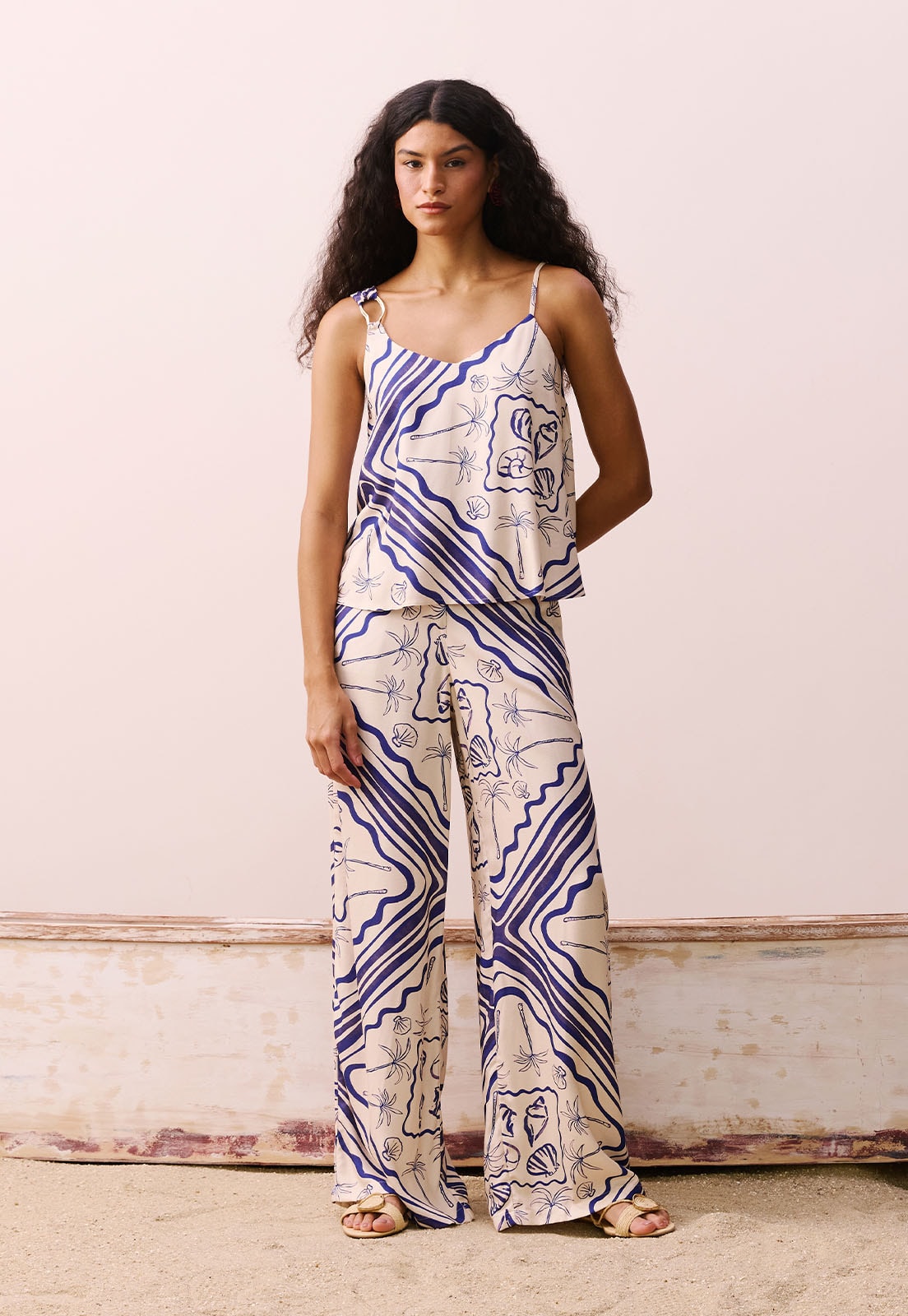 A calça pantalona estampada Tupé da CaCay é a tradução da leveza com presença. Com modelagem ampla e cintura alta, ela valoriza a silhueta e proporciona liberdade de movimento. O comprimento longo até os pés e o caimento fluido criam um visual elegante e confortável, ideal para quem busca estilo com naturalidade. Confeccionada em 100% viscose, o tecido tem toque suave, excelente respirabilidade e caimento sofisticado. A modelo veste tamanho P e tem 1,77m de altura, evidenciando o ajuste impecável da peça.