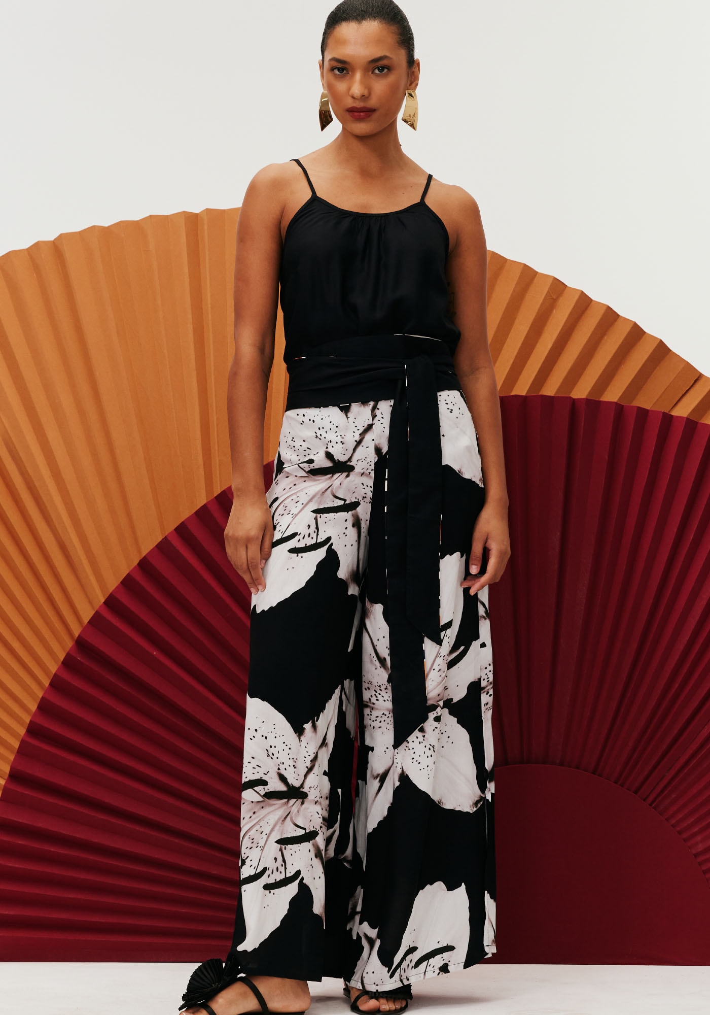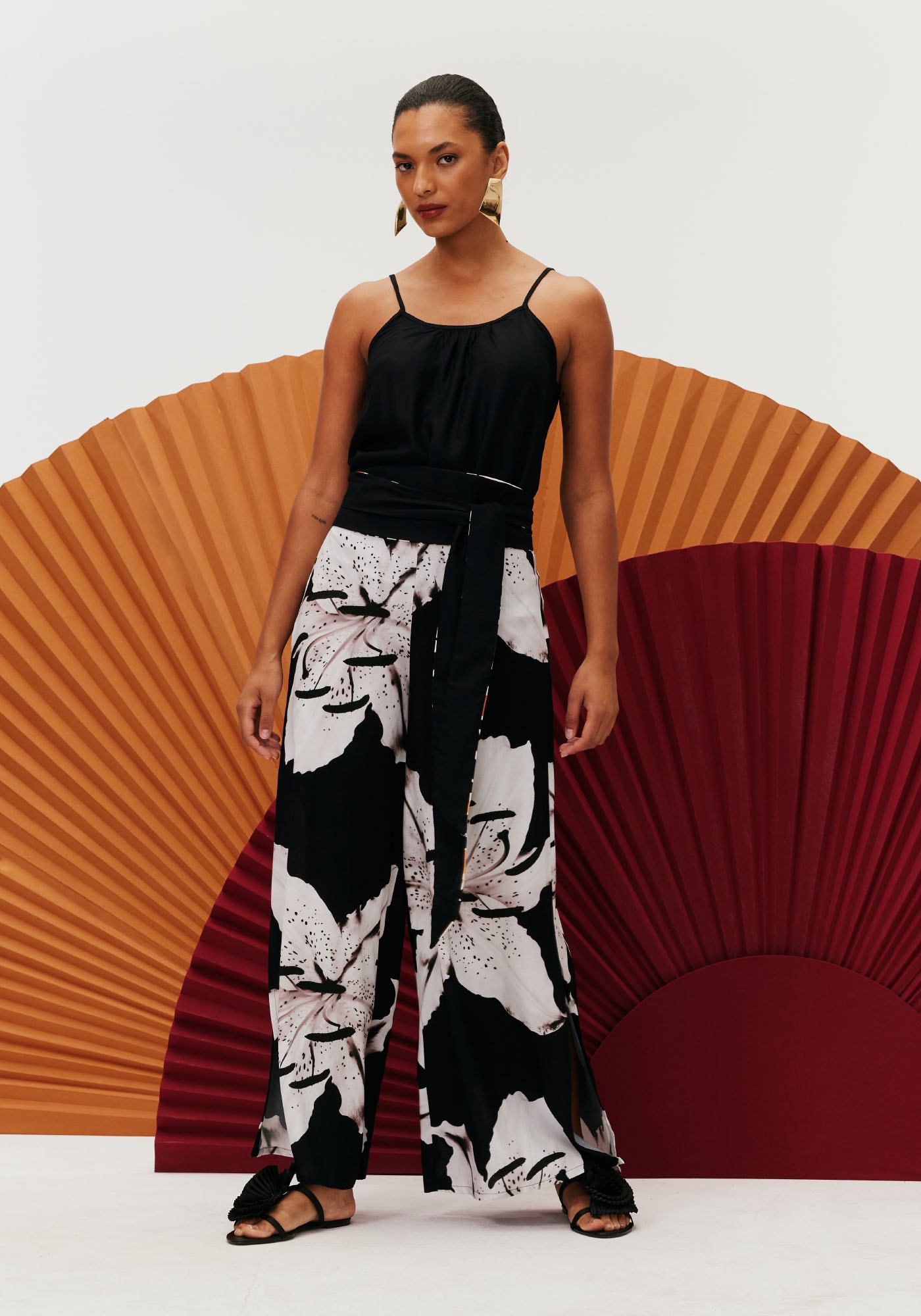 Confeccionado em tecido 100%viscose, a calça pantalona já virou uma peça básica no guarda-roupa. O modelopantalona com fendas laterais traz leveza e fluidez aos movimentos. A calçaainda conta com fechamento em zíper na parte de trás. Pode ser combina comoutras peças da mesma estampa.