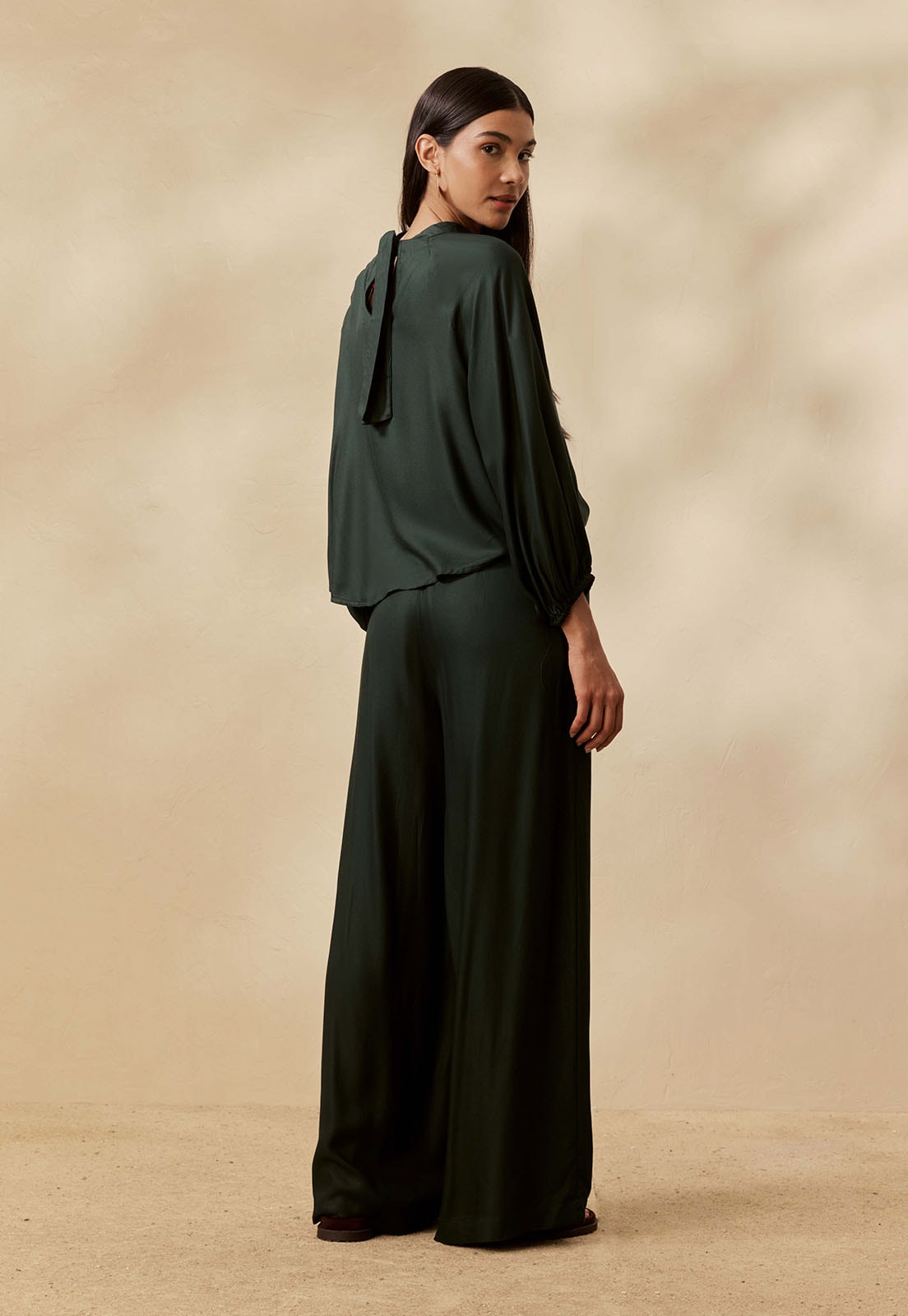 A Calça Pantalona Lisa da CaCay tem modelagem ampla e elegante, com caimento fluido que valoriza a silhueta sem marcar. A cintura se ajusta suavemente com fecho em zíper, enquanto o quadril e as pernas recebem amplitude sofisticada. A forma é grande, então se estiver em dúvida entre dois tamanhos, opte pelo menor e consulte a tabela de medidas para precisão. Na foto, a modelo tem 1,75m de altura, veste manequim 36 e está usando o tamanho P.