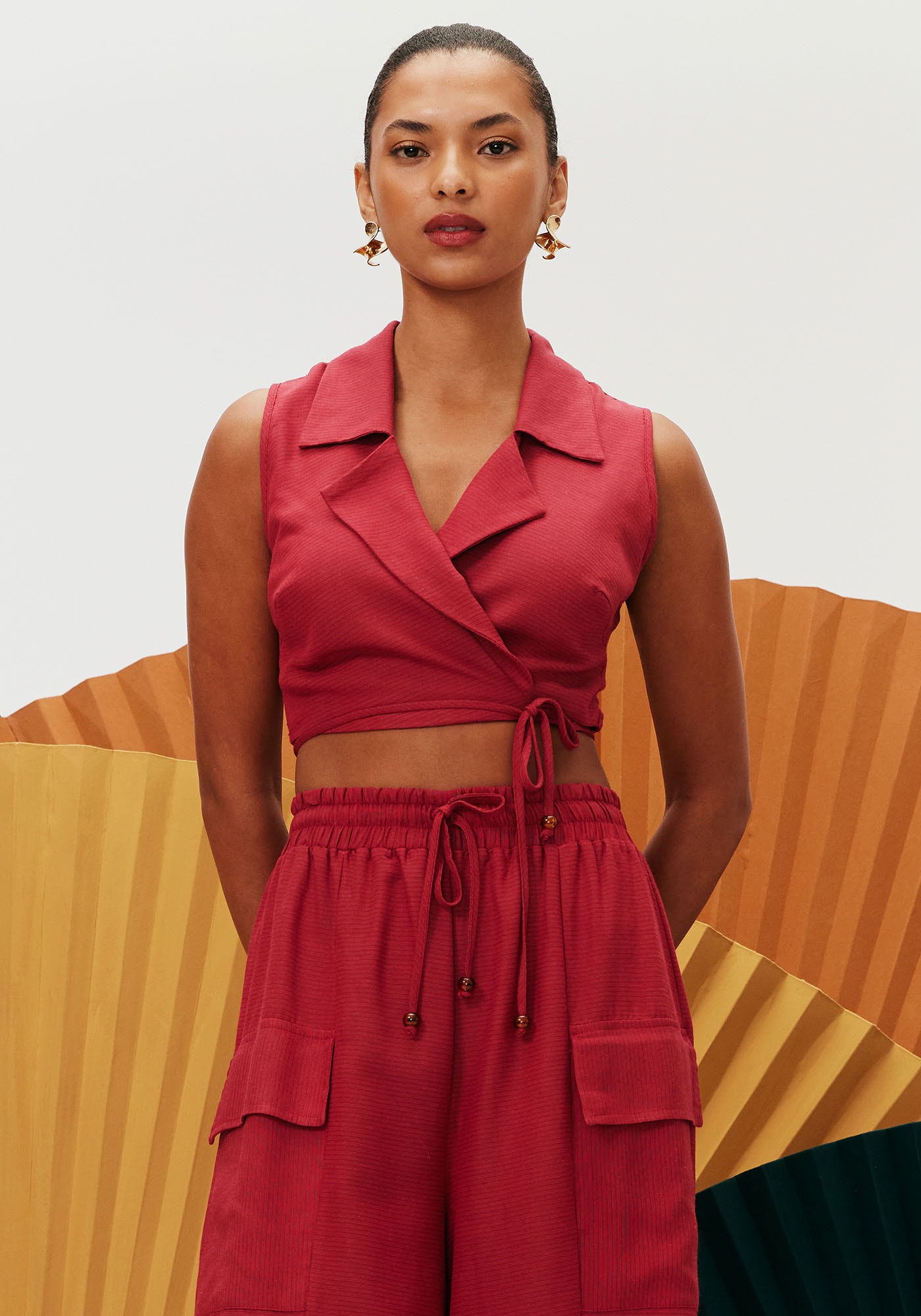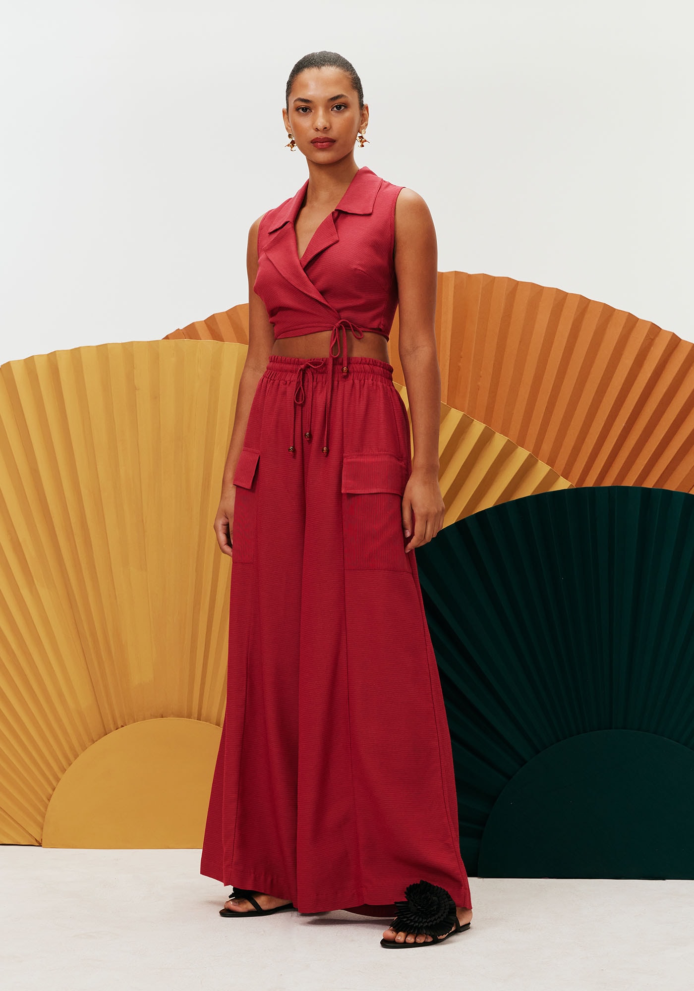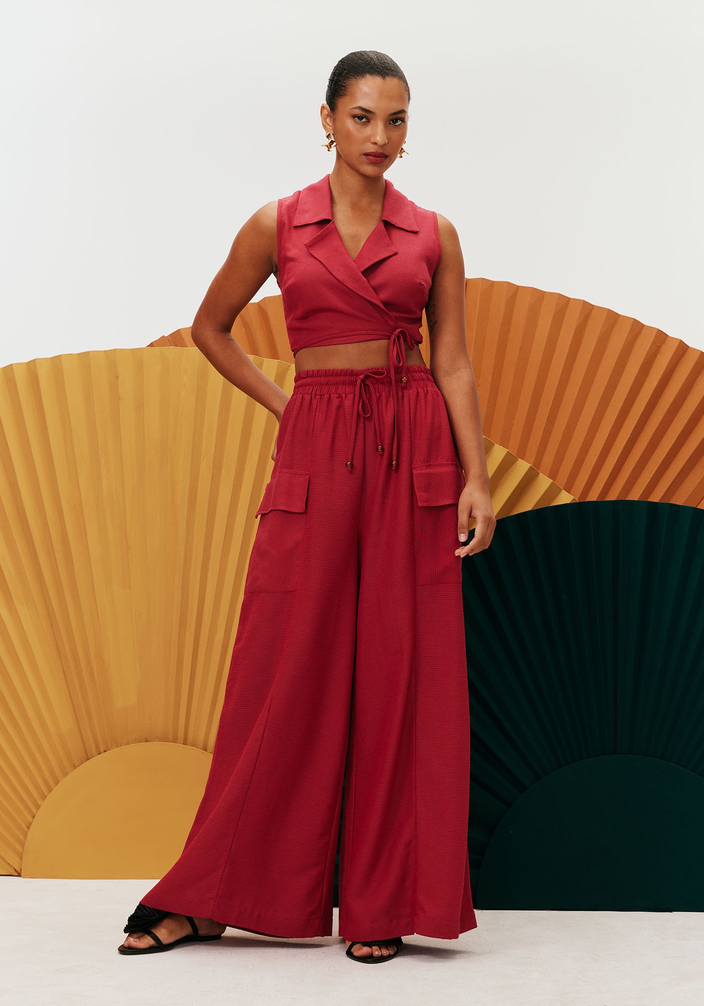 A Calça Pantalona Recortes apresenta uma modelagem ampla que oferece conforto e liberdade de movimento, além de transmitir um visual moderno. Possui bolsos laterais utilitários que proporcionam praticidade enquanto sua pala na cintura em lastex com amarração permite um ajuste ideal e personalizado ao corpo. A composição do tecido é de 61% Viscose e 39% Algodão.