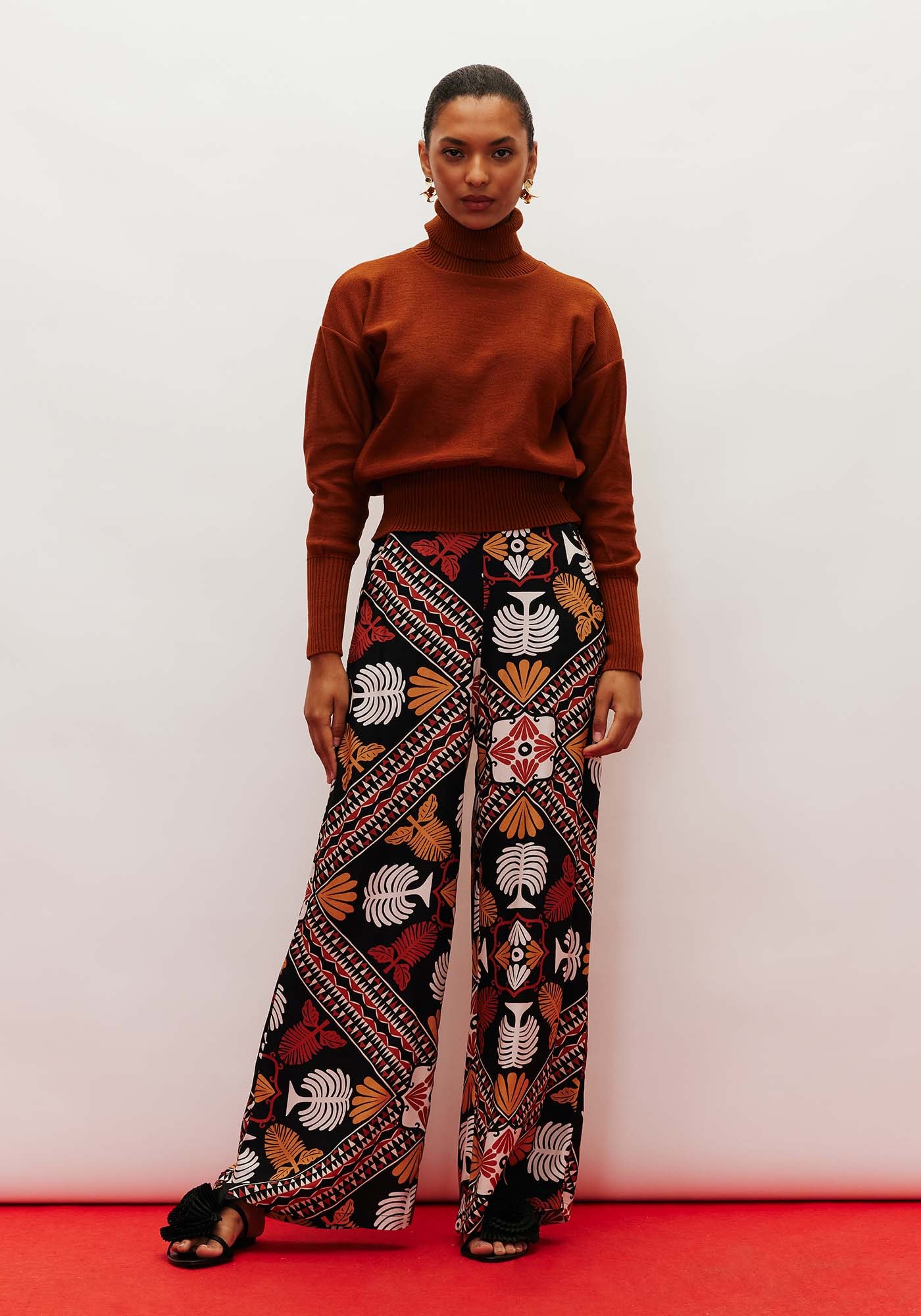 Confeccionadaem tecido 100% viscose, a calça estampada Baião é um modelo versátil, que podeser usada em diferentes ocasiões. A peça possui cintura alta com pala eelástico nas costas, favorecendo a vestibilidade em diferentes corpos. Osbolsos laterais em faca são bem práticos.