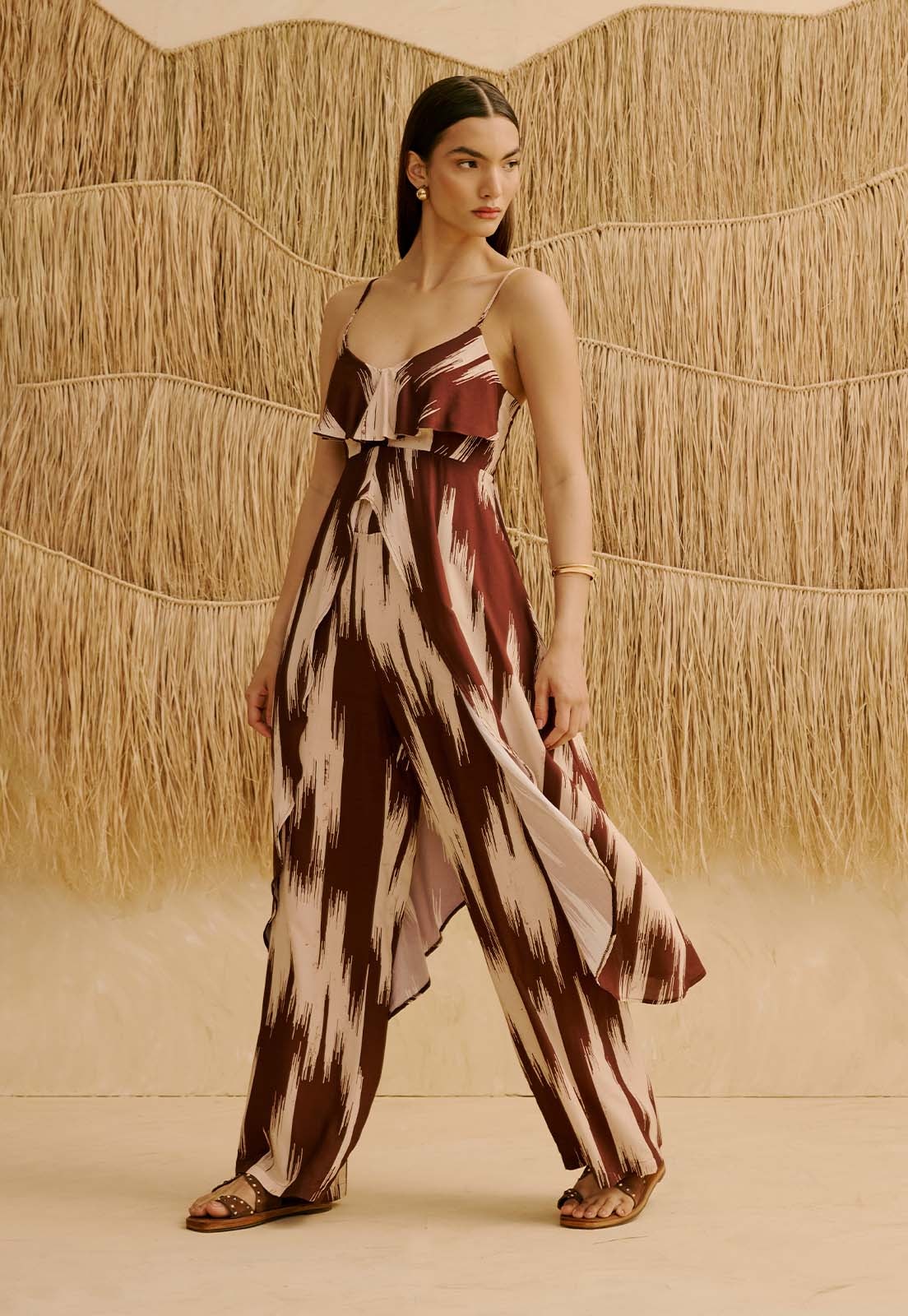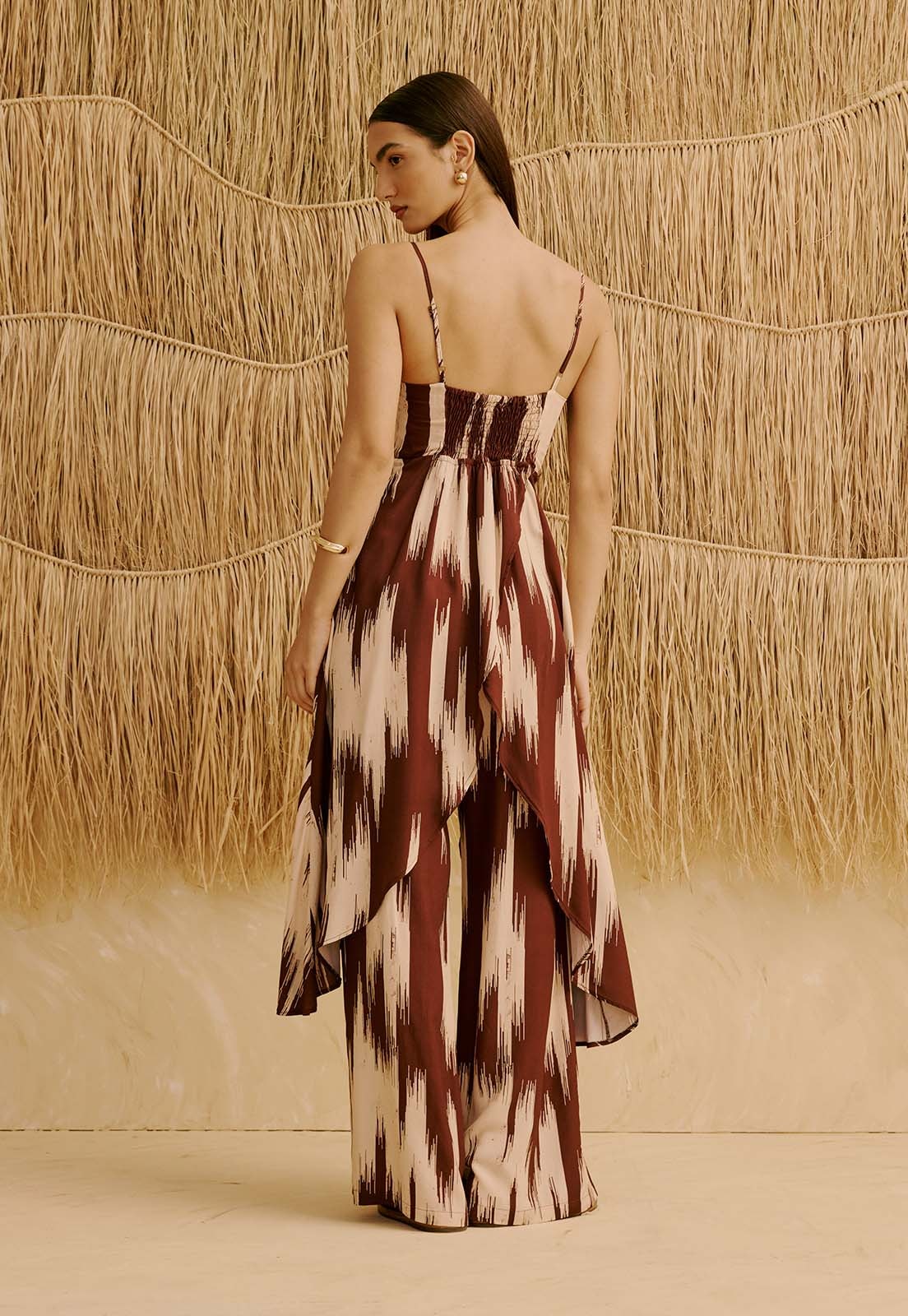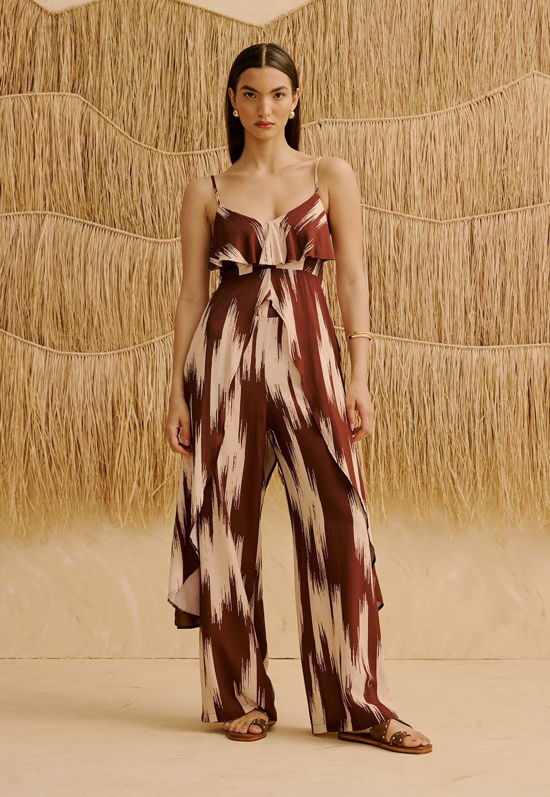 A Calça Reta Estampada Amantani da CaCay tem modelagem reta e solta, com caimento fluido que acompanha o corpo sem marcar. O ajuste na cintura é confortável, favorecendo diferentes silhuetas com elegância. O comprimento alongado valoriza a postura e traz sofisticação ao visual. A forma é grande, então se estiver em dúvida entre dois tamanhos, sugerimos escolher o menor. A modelo da foto tem 1,75m, veste manequim 36 e está usando o tamanho P.