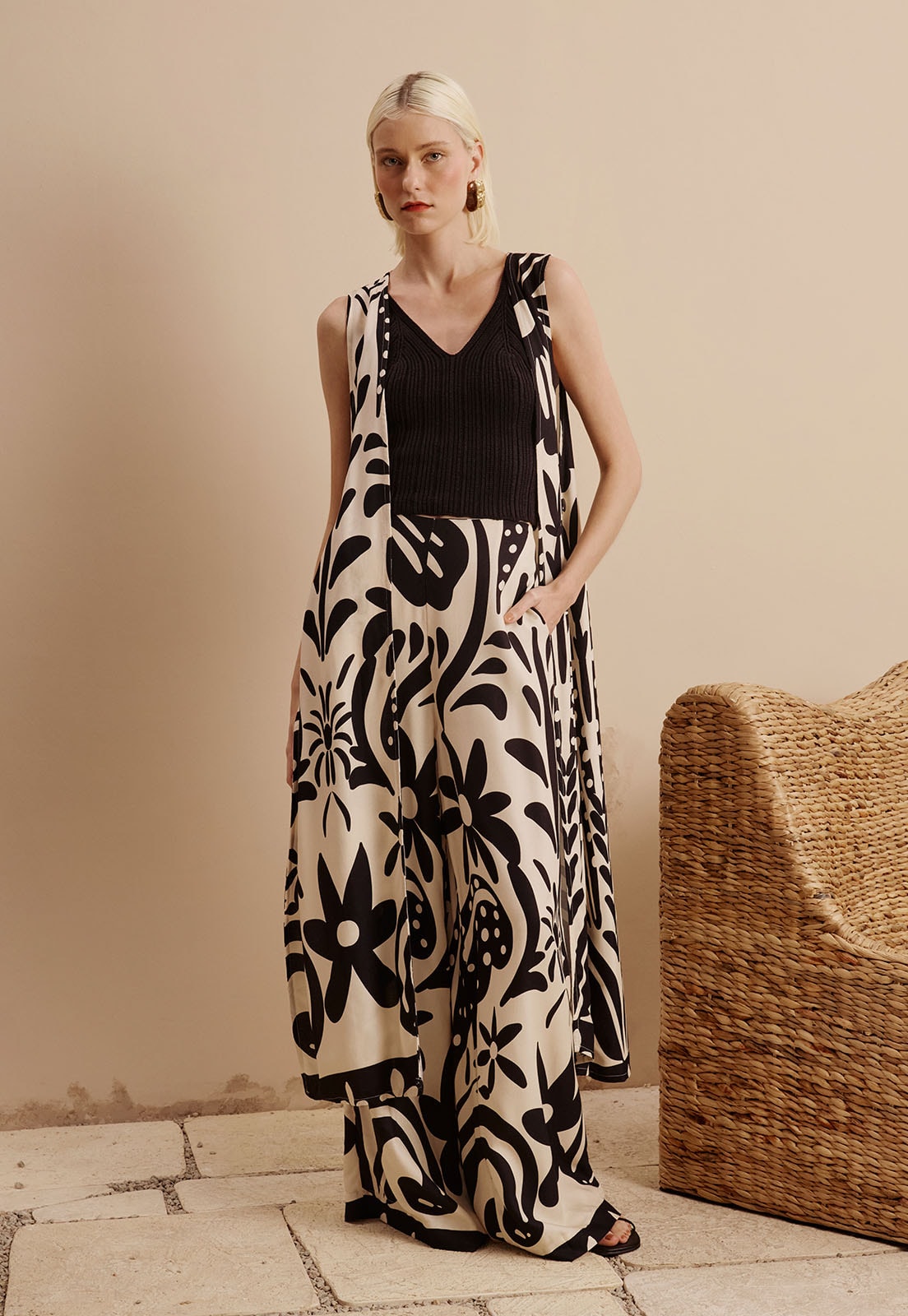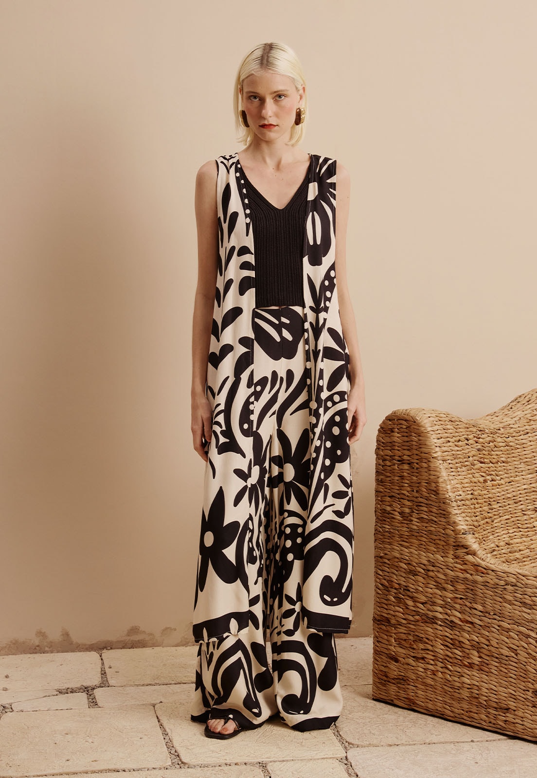 Sua estampa exclusiva traz formas orgânicas e elementos artísticos que adicionam sofisticação ao visual, tornando a peça versátil para ocasiões que vão do trabalho ao lazer. Combine com camisas de linho, regatas de alças finas ou blusas de alfaiataria, e finalize com sandálias de tiras ou mules para um look contemporâneo e cheio de personalidade.