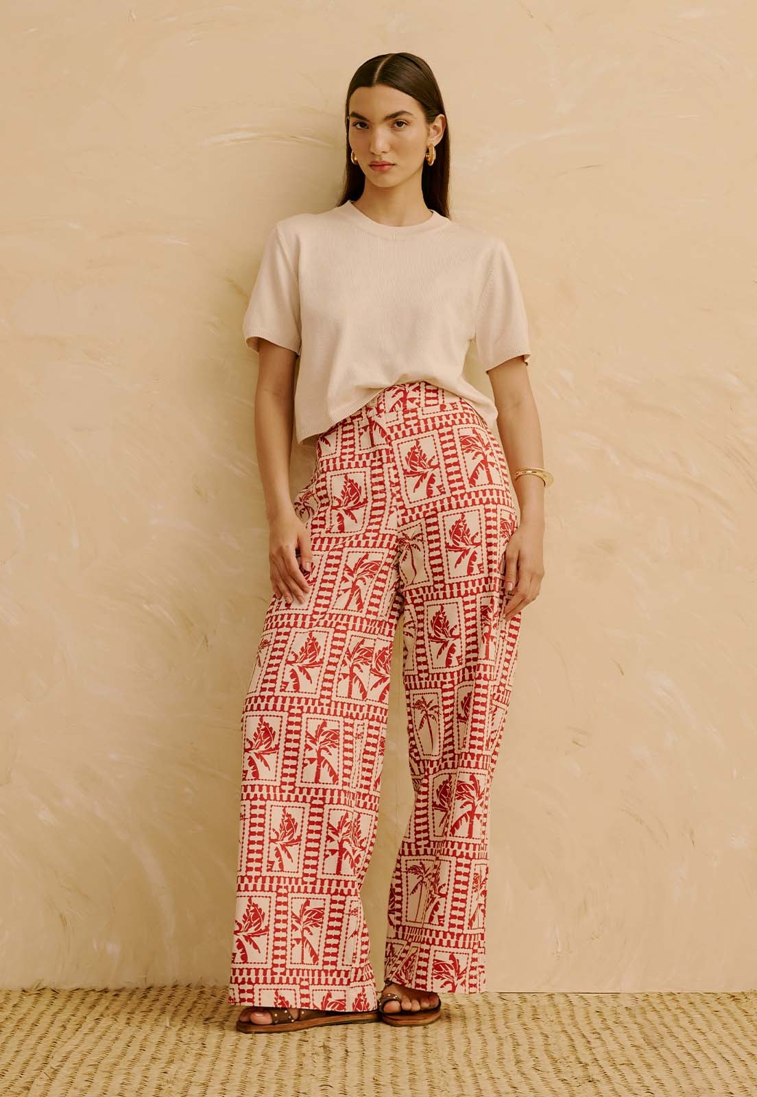 A Calça Reta Estampada Yura da CaCay apresenta modelagem reta, cintura alta e caimento estruturado, define suavemente a cintura e acompanha o quadril sem marcar, garantindo elegância e conforto. O comprimento alonga a silhueta com sofisticação, ideal para diferentes ocasiões. A forma é grande, então se estiver em dúvida entre dois tamanhos, recomendamos optar pelo menor. Consulte a tabela de medidas para precisão. A modelo da foto tem 1,75m, veste manequim 36 e está usando o tamanho P.