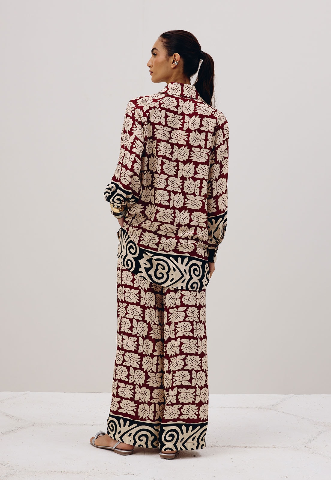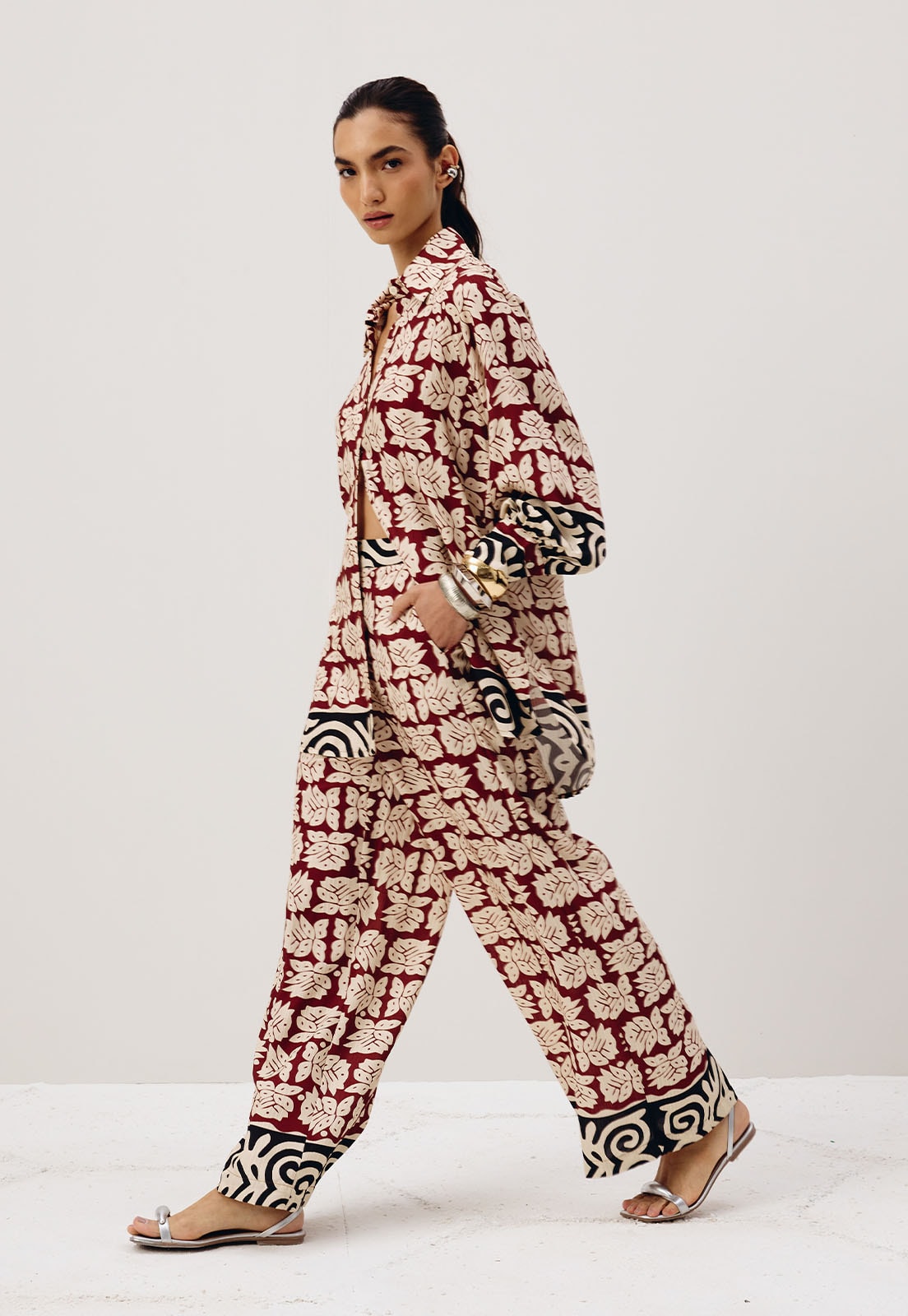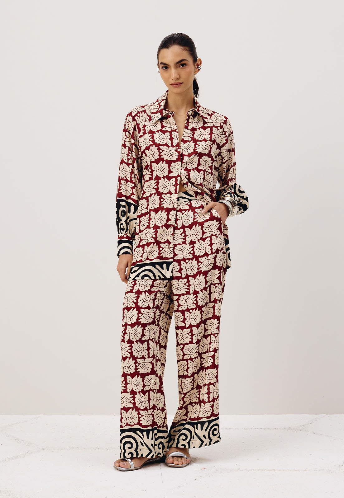 A calça estampada Asteca é um modelo confeccionado em tecido 100% viscose. O modelo cintura alta socialpossui abotoamento e fechamento em zíper na parte da frente, além dos bolsos laterais.