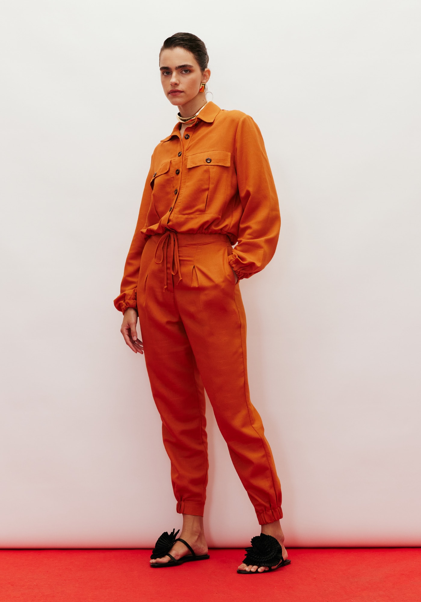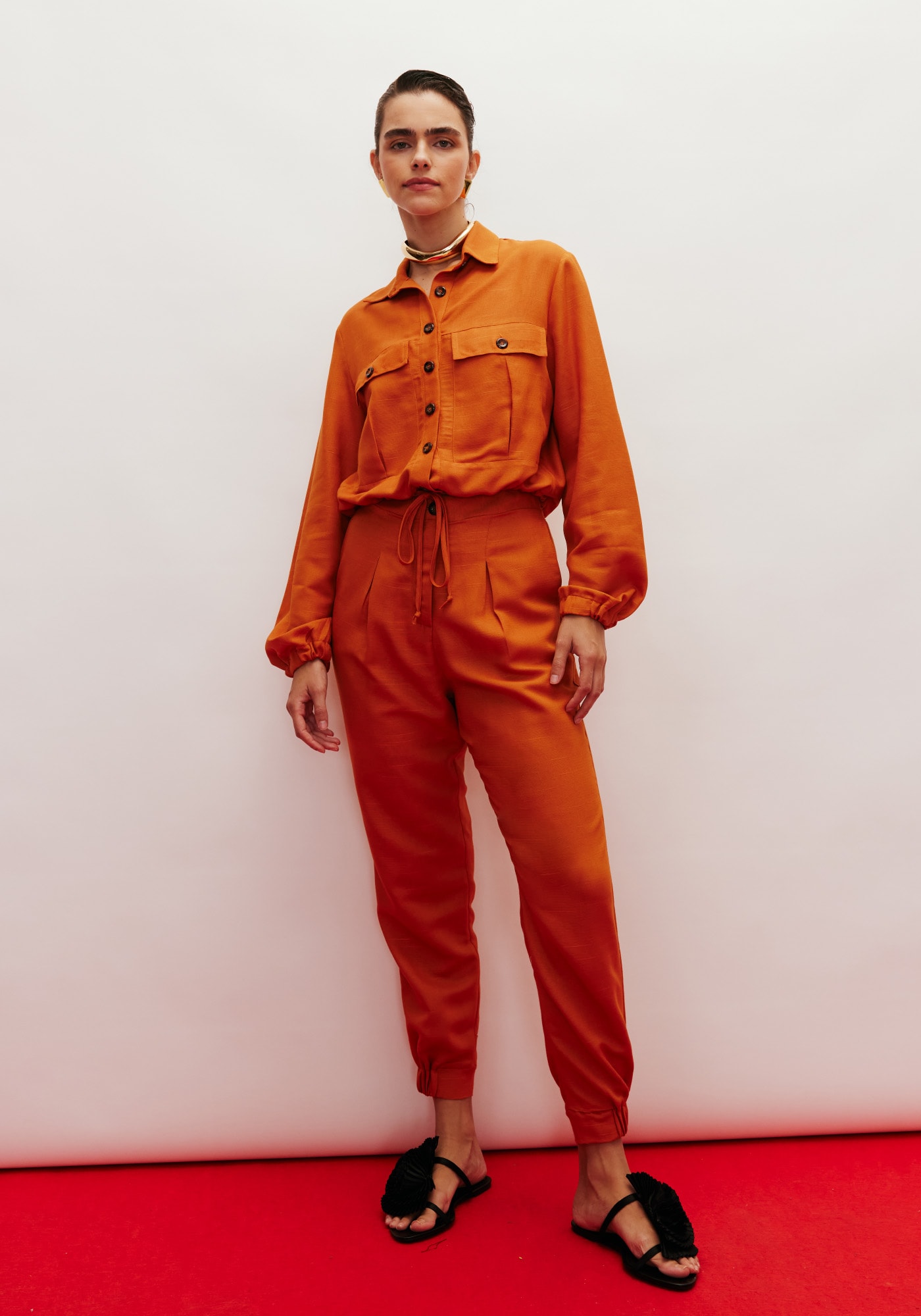 Confeccionada com umtecido 61% viscose e 39% algodão, a calça um modelo clássico, que cai super bemem qualquer look. A peça possui fechamento com botão e pregas que dão um toquediferenciado para a peça. A barra possui elástico, se ajustando perfeitamenteao corpo.