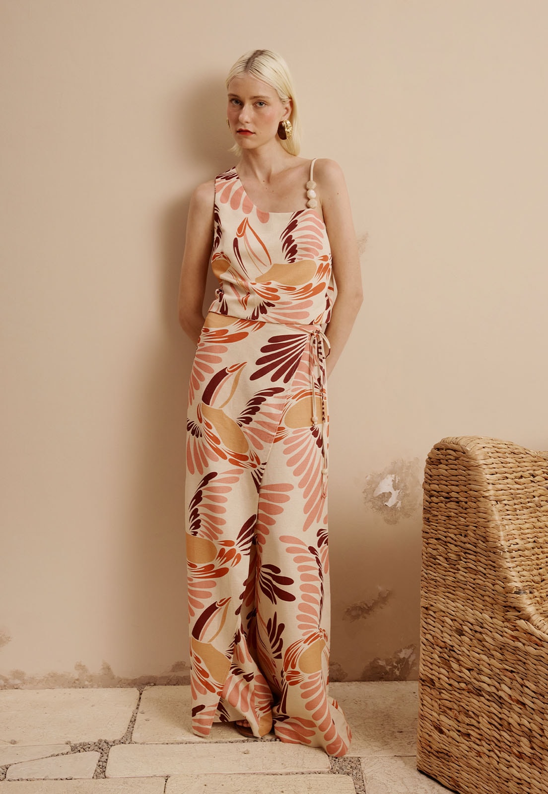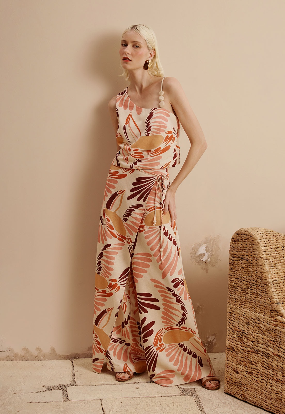 A Calça Transpassada Reta Estampada Tucano Toco da CaCay é a união perfeita entre design contemporâneo e conforto natural. Com corte reto e pernas amplas, ela proporciona um caimento leve e fluido, ideal para quem valoriza liberdade de movimento sem abrir mão da elegância. O cós alto com detalhe transpassado na lateral valoriza a silhueta com sofisticação, enquanto a estampa de folhas grandes adiciona um toque artístico e moderno. Sua composição 50% algodão, 29% viscose, 15% modal e 6% linho garante frescor, maciez e durabilidade, tornando-a uma peça versátil para o ano todo.