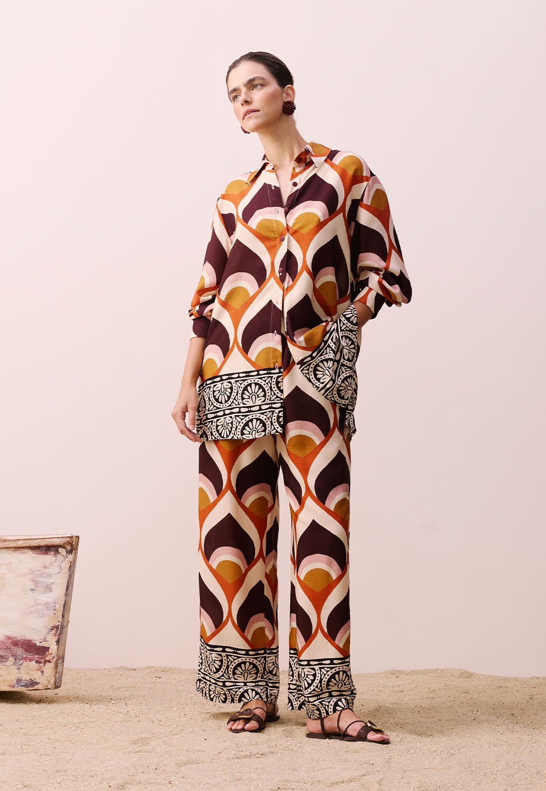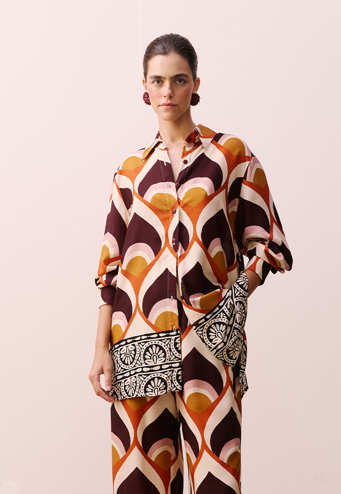 A Camisa Alongada Estampada Ponta do Muretá da CaCay é uma peça que une fluidez e sofisticação em um design marcante. Confeccionada em 100% viscose, oferece toque leve e caimento solto, ideal para quem valoriza conforto sem abrir mão da elegância. Seu visual é enriquecido por uma estampa de formas geométricas e curvas orgânicas, com detalhes contrastantes na barra que evocam elementos florais e artísticos, criando uma composição visual única e atemporal.