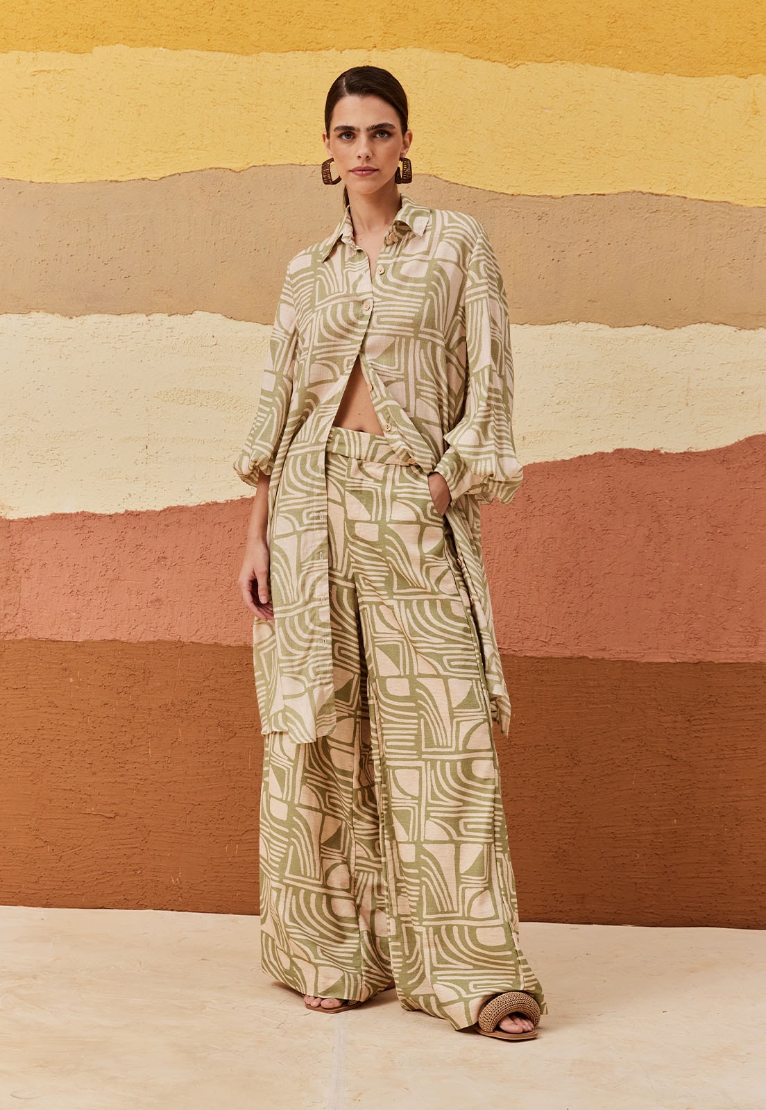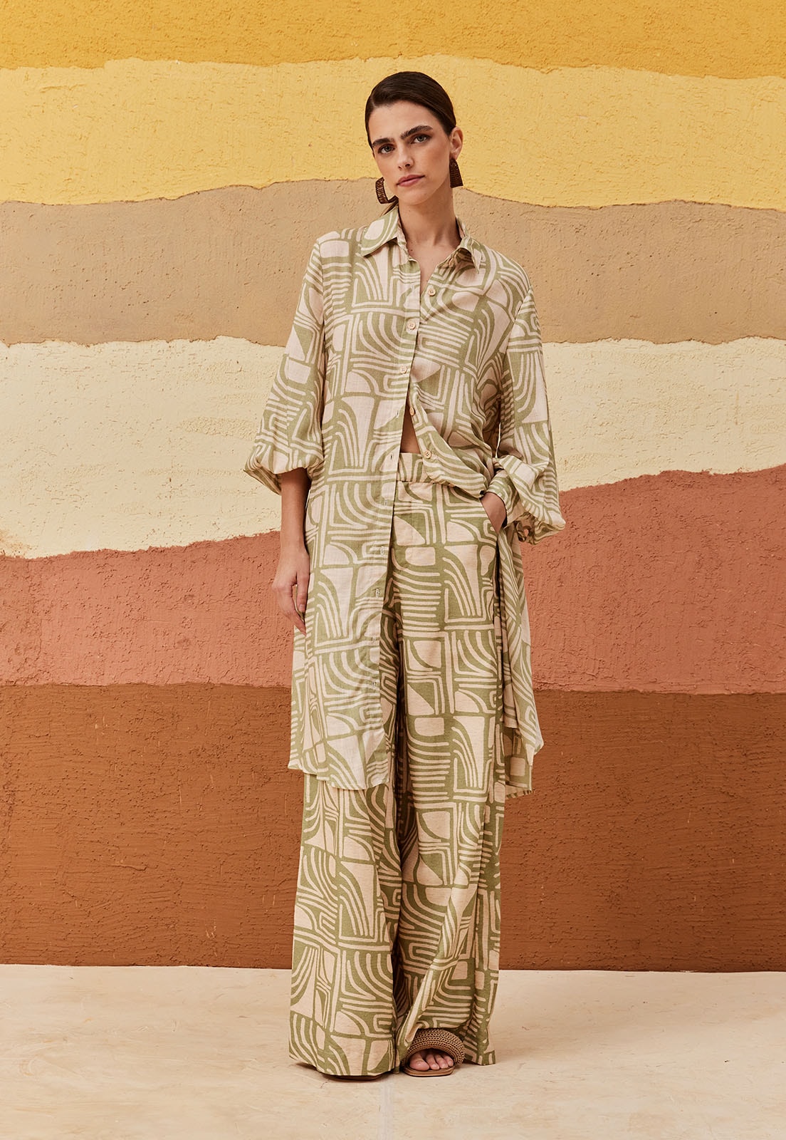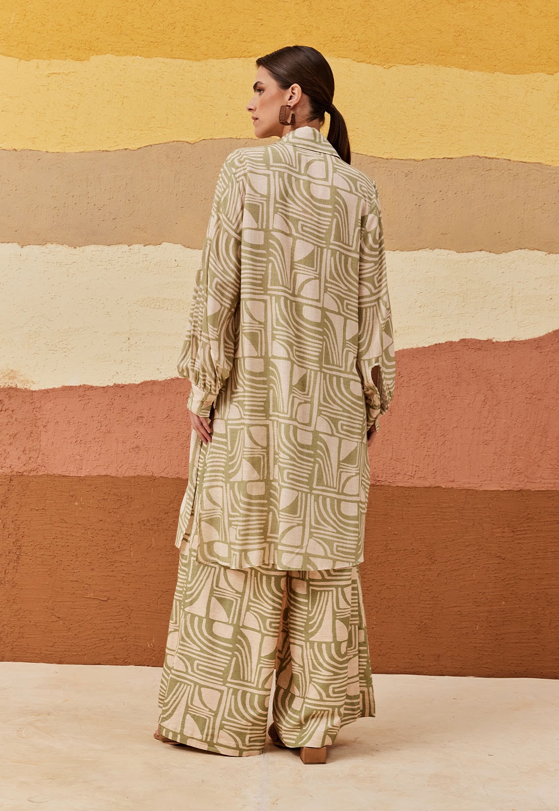A camisa estampada Tierras Altas é confeccionada em tecido 96% viscose e 4% algodão. O modelo alongado possui fendas laterais e abotoamento na parte da frente. É versátil e pode ser usada como terceira peça ou parte de cima para completar o look.