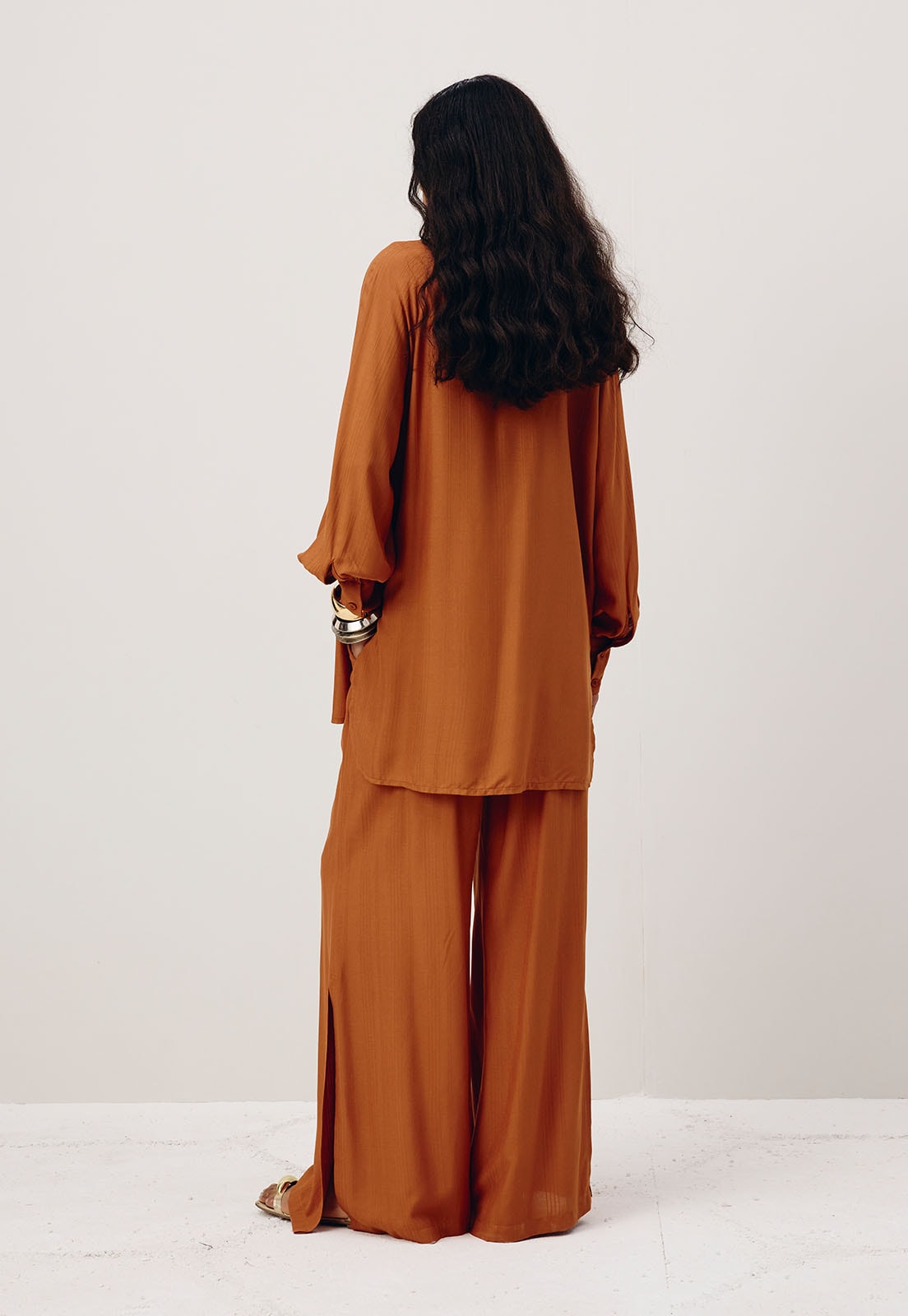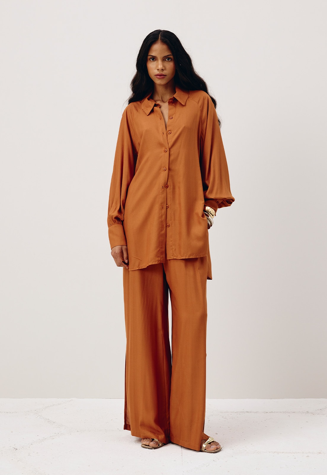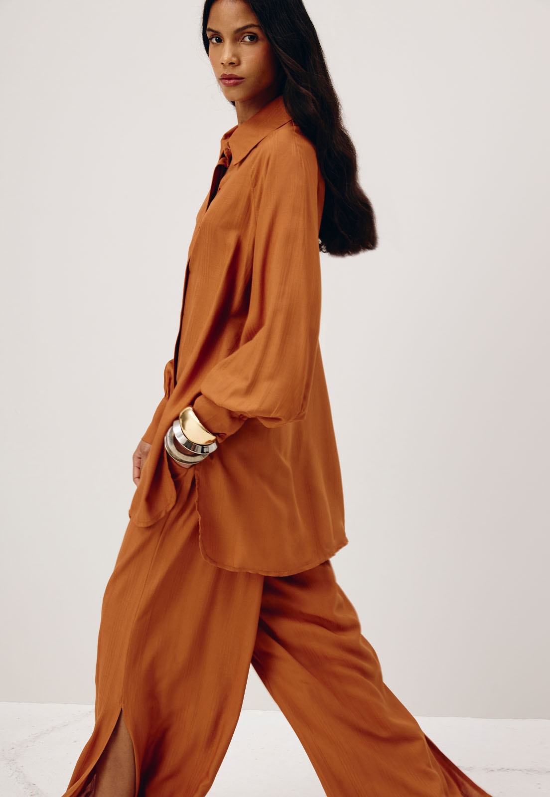 A camisa lisa é confeccionada em tecido 100% viscose e possui uma modelagem alongada com manga estilo ranglan. É sofisticada e versátil, podendo ser usada de diferentes formas no look.