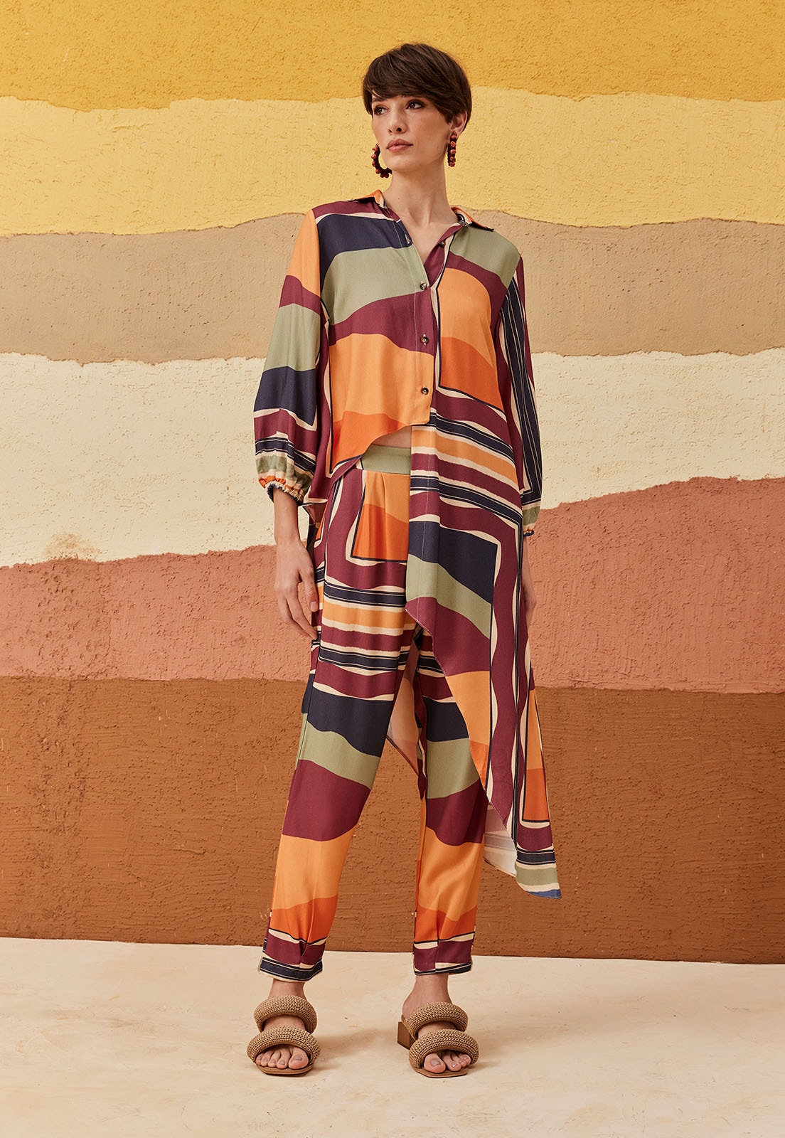 A Camisa Com Pontas Cascata Estampada Hornocal da CaCay é uma peça que une fluidez e sofisticação em um design assimétrico marcante. Com cauda alongada na parte traseira, ela cria um efeito cascata que valoriza o movimento e o caimento leve do tecido 100% viscose. A estampa exclusiva, composta por padrões geométricos e linhas onduladas, adiciona personalidade sem sobrecarregar o visual. As mangas amplas com punhos elásticos garantem conforto e liberdade, enquanto a gola clássica e os botões frontais trazem equilíbrio entre o casual e o elegante.
