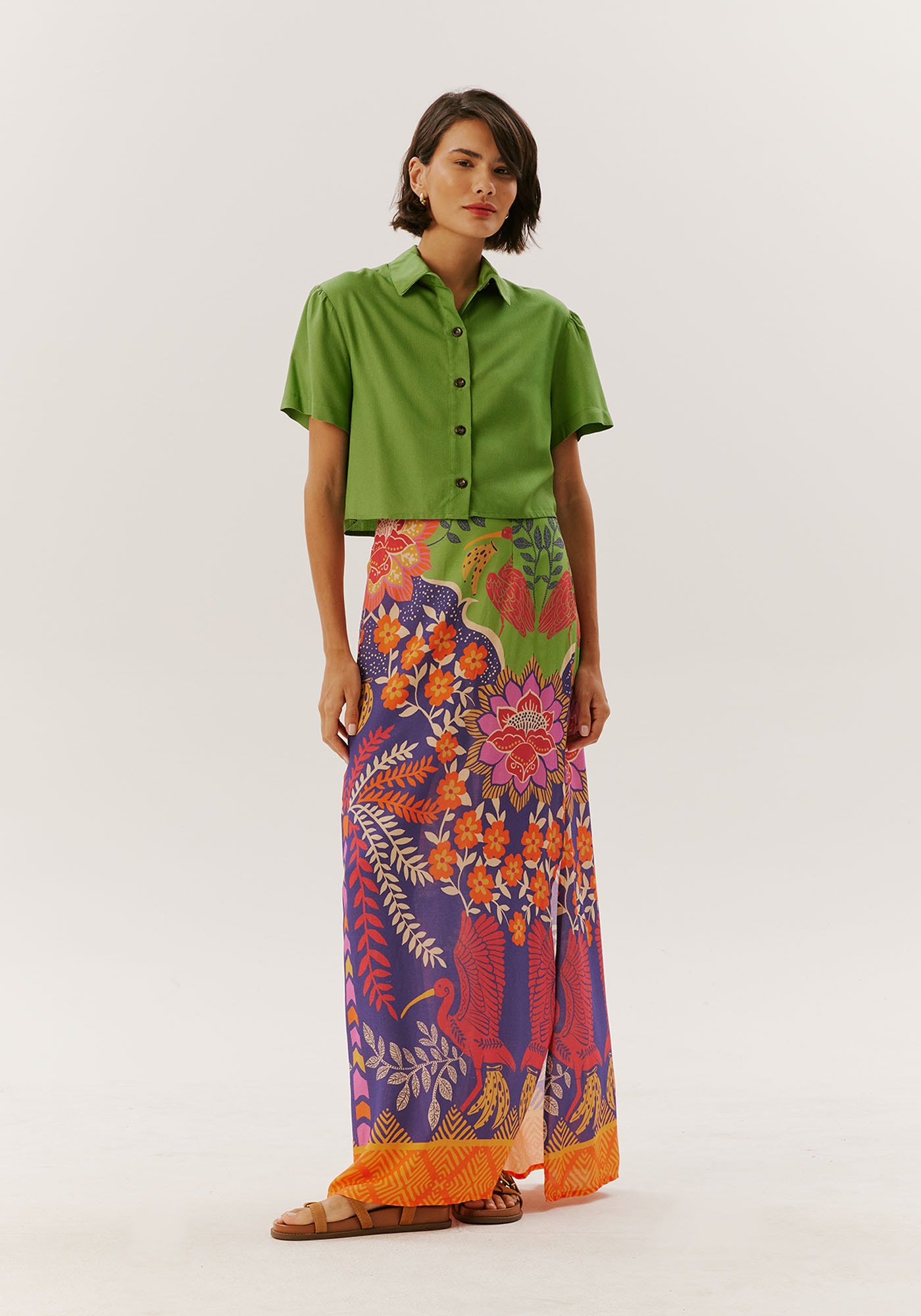 Produzida com tecido deviscose, esta camisa cropped combina conforto e estilo contemporâneo,adequando-se a diversas ocasiões. A presença da gola polo, junto com os botõesfrontais, confere um toque de elegância à peça.
