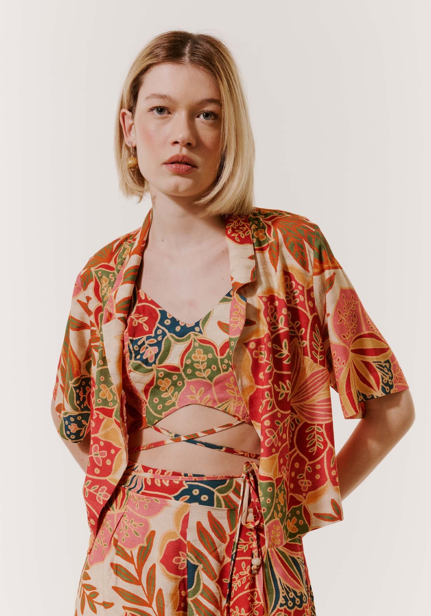 A camisa cropped é um modelo moderno e ousado, que pode serusada como uma terceira peça ou parte de cima. Confeccionada em 97% viscose e3% linho, a possui gola e manga curta e a modelagem mais solta.
