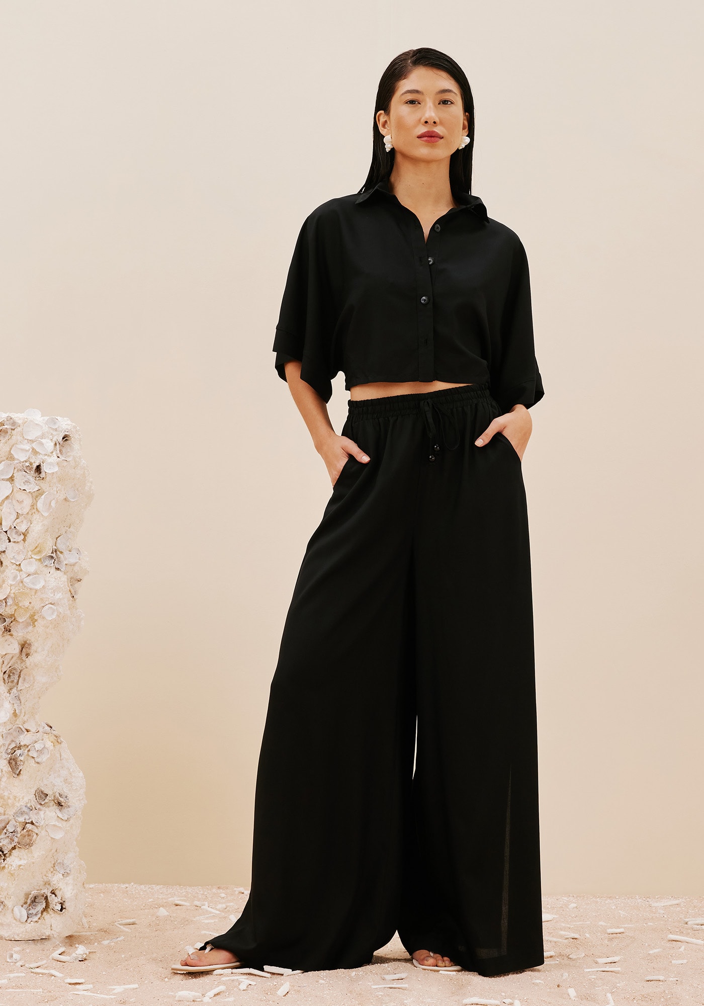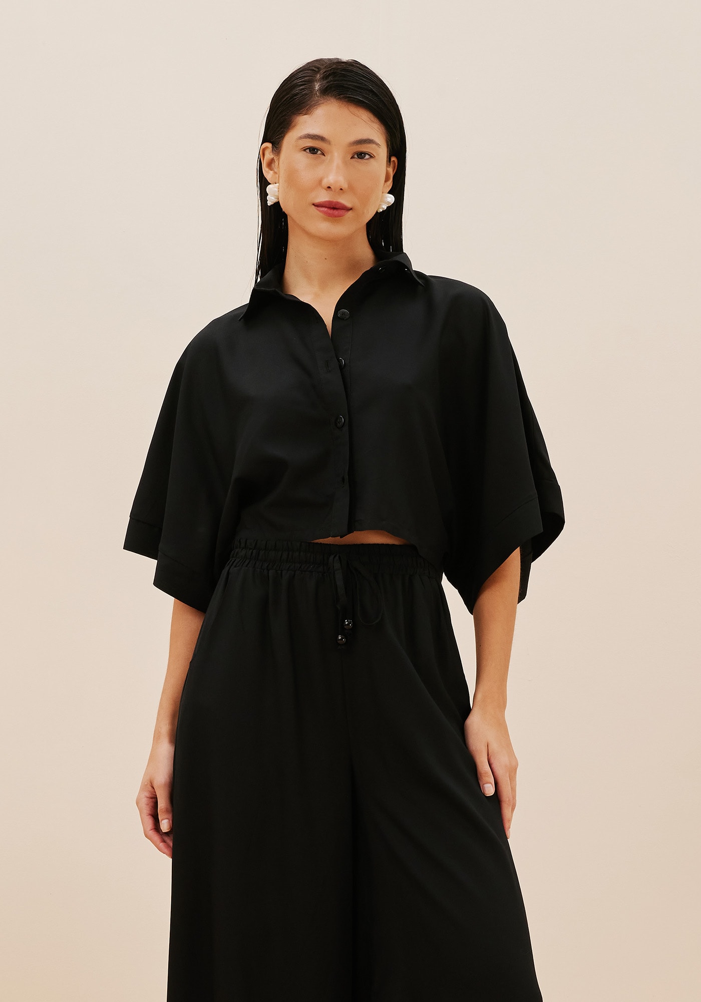 Esta Camisa Cropped combinamodernidade e sofisticação com o seu abotoamento frontal e ag a gola clássica.Apresenta mangas kimono que trazem um detalhe único para o visual e éconfeccionada em 100% Viscose. Confortável e elegante, é uma peça versátil echeia de estilo.