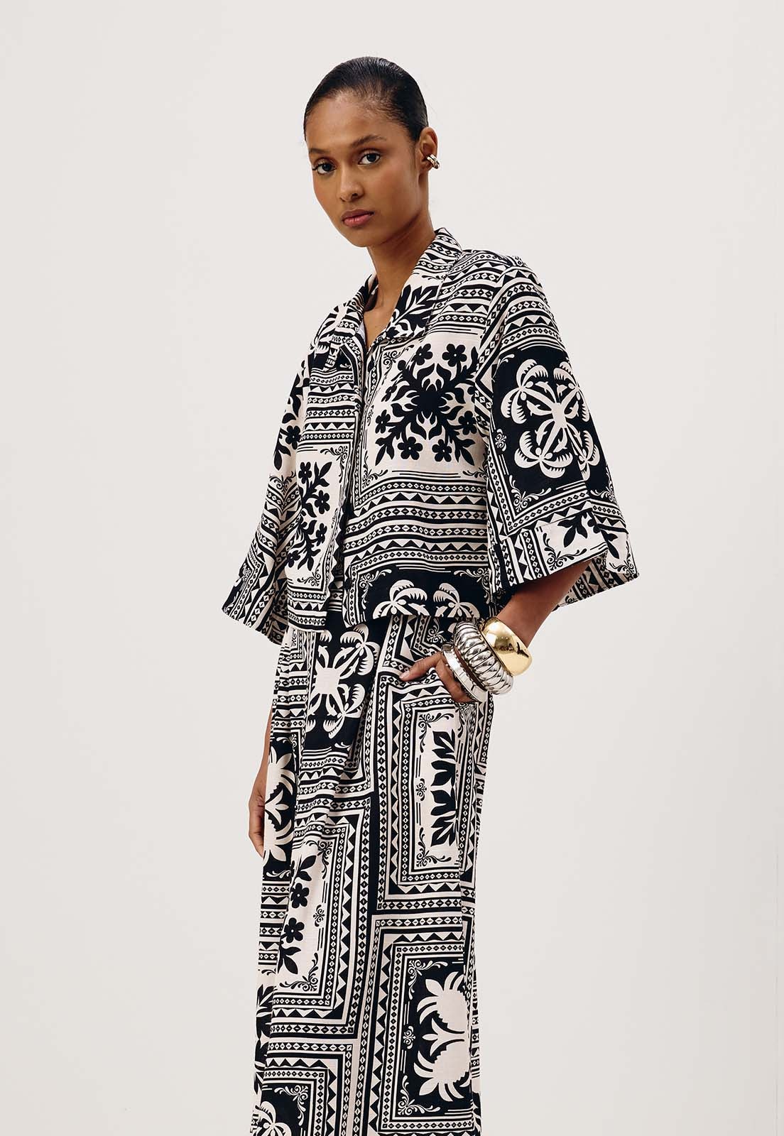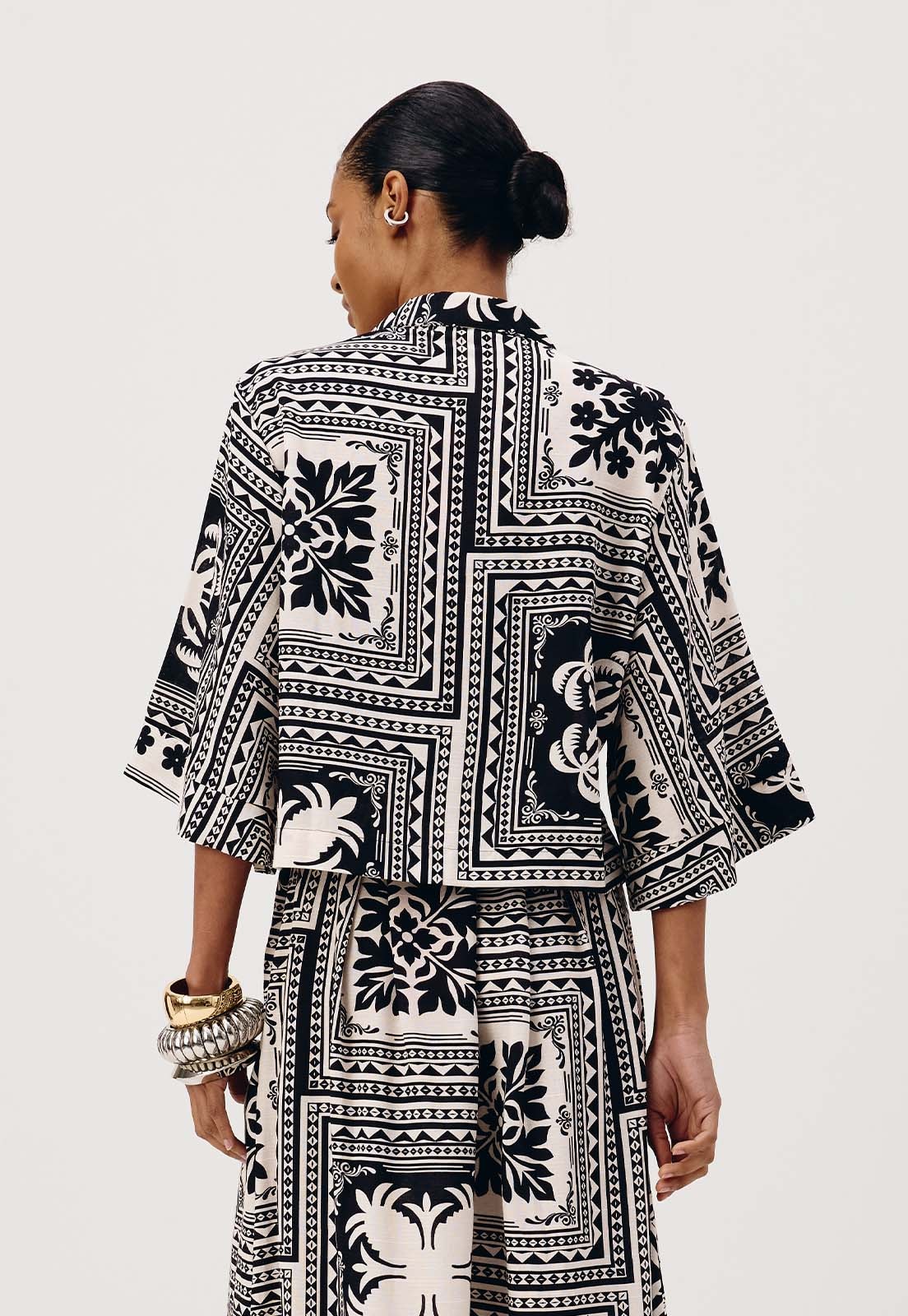 A camisaestampada Maia é confeccionada em tecido 61% viscose 35% algodão. É um modelo cropped, com shape amplo. Conta com abotoamento na parte da frente e manga kimono.