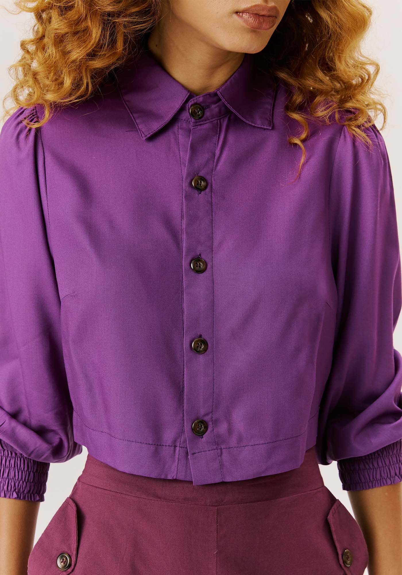 A Camisa Cropped Punho LastexLiso é perfeita para quem deseja um visual sofisticado e também descolado.Possui gola e mangas ¾ bufantes com lastex no punho que conferem um visual maiselegante enquanto seu comprimento cropped o torna mais descontraído. Possuiabotoamento frontal e é confeccionado em 100% viscose.