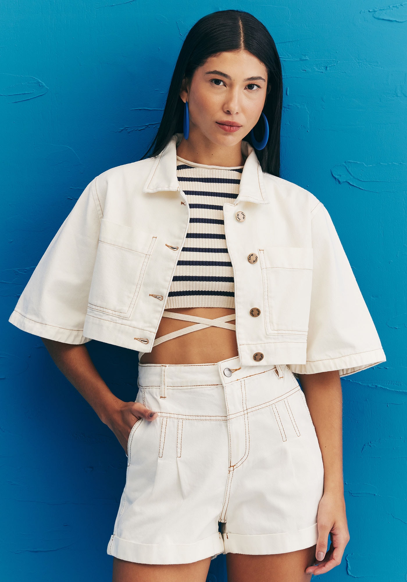 A camisa cropped é versátil e estilosa. Confeccionadaem sarja 100% algodão, o modelo pode ser usado como parte de cima ou sobreposiçãopara completar o look. A modelagem cropped com abotoamento e bolsos na parte dafrente dá um toque especial na peça