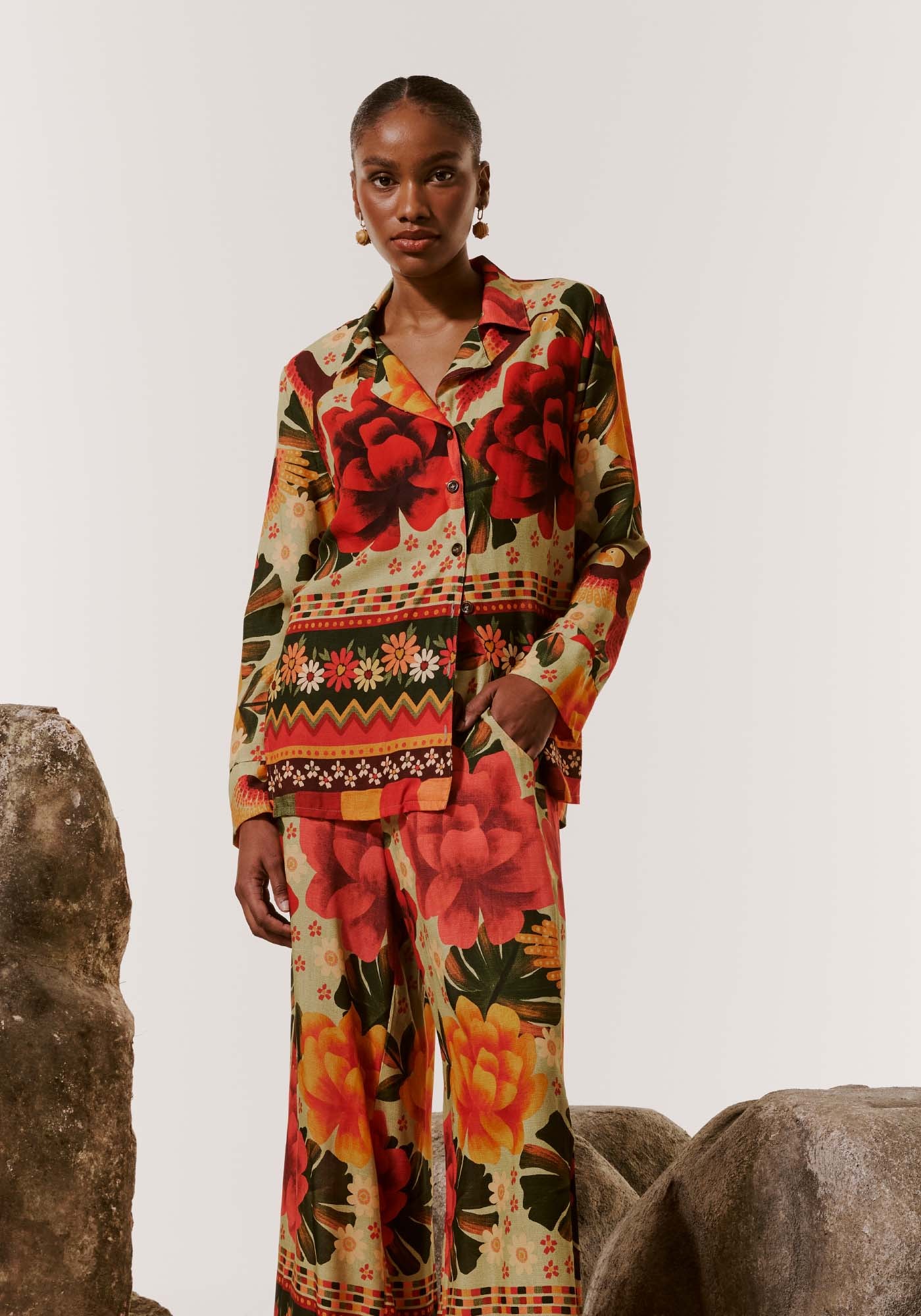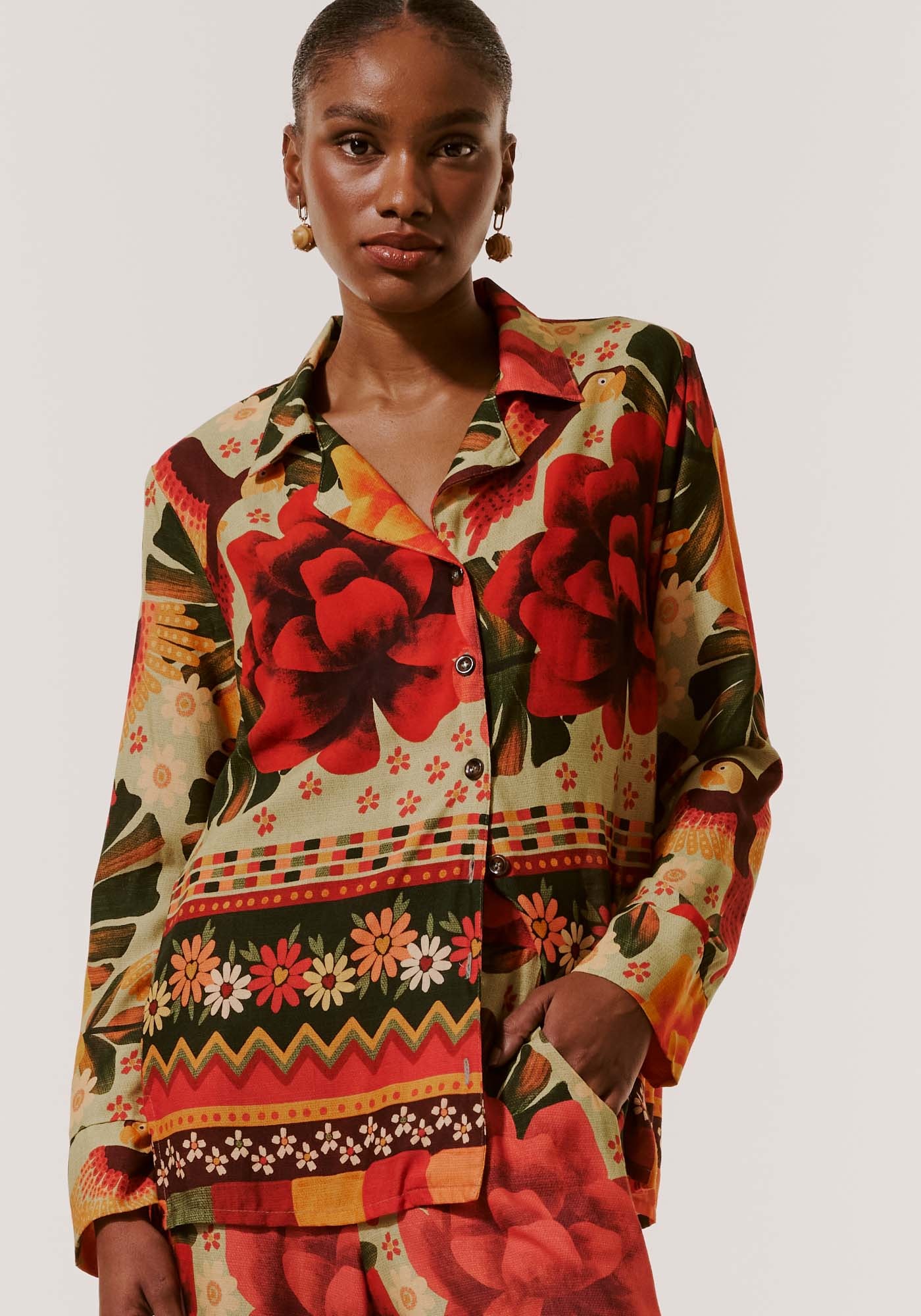 Confeccionado em tecido 100% viscose, acamisa é um modelo sofisticado, que possui abotoamento frontal e manga longa.Pode ser usada em diferentes ocasiões, como terceira peça ou parte de cima.