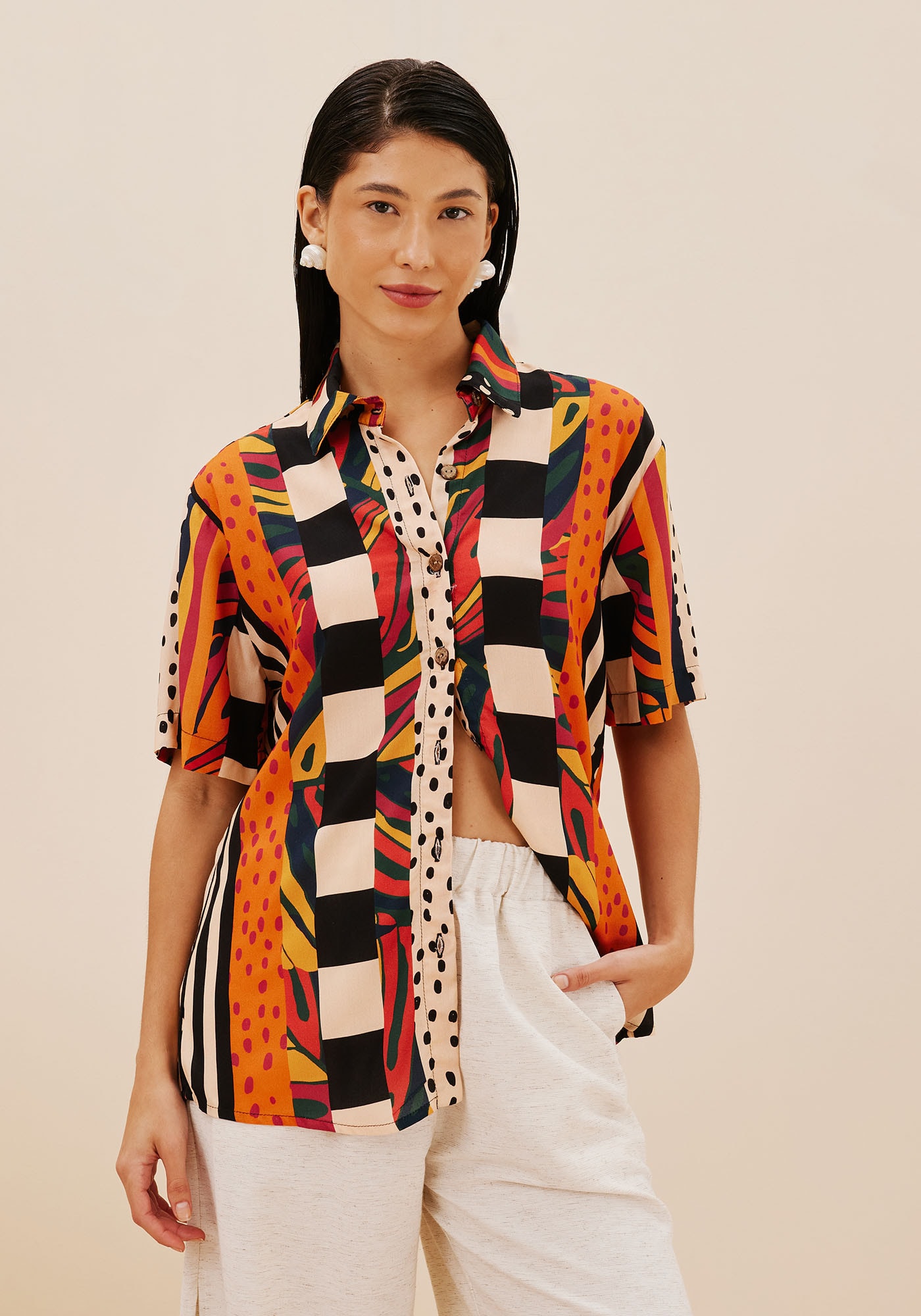 A Camisa Estampada Terra é umapeça atemporal e versátil que combina um estilo e conforto. Apresenta fechamentofrontal em botões, gola clássica e mangas curtas e é confeccionada em tecido decomposição 100% Viscose que garante leveza e suavidade. A estampa vibrante Terraadiciona personalidade e modernidade à esta peça, trazendo um toque único parao seu visual.