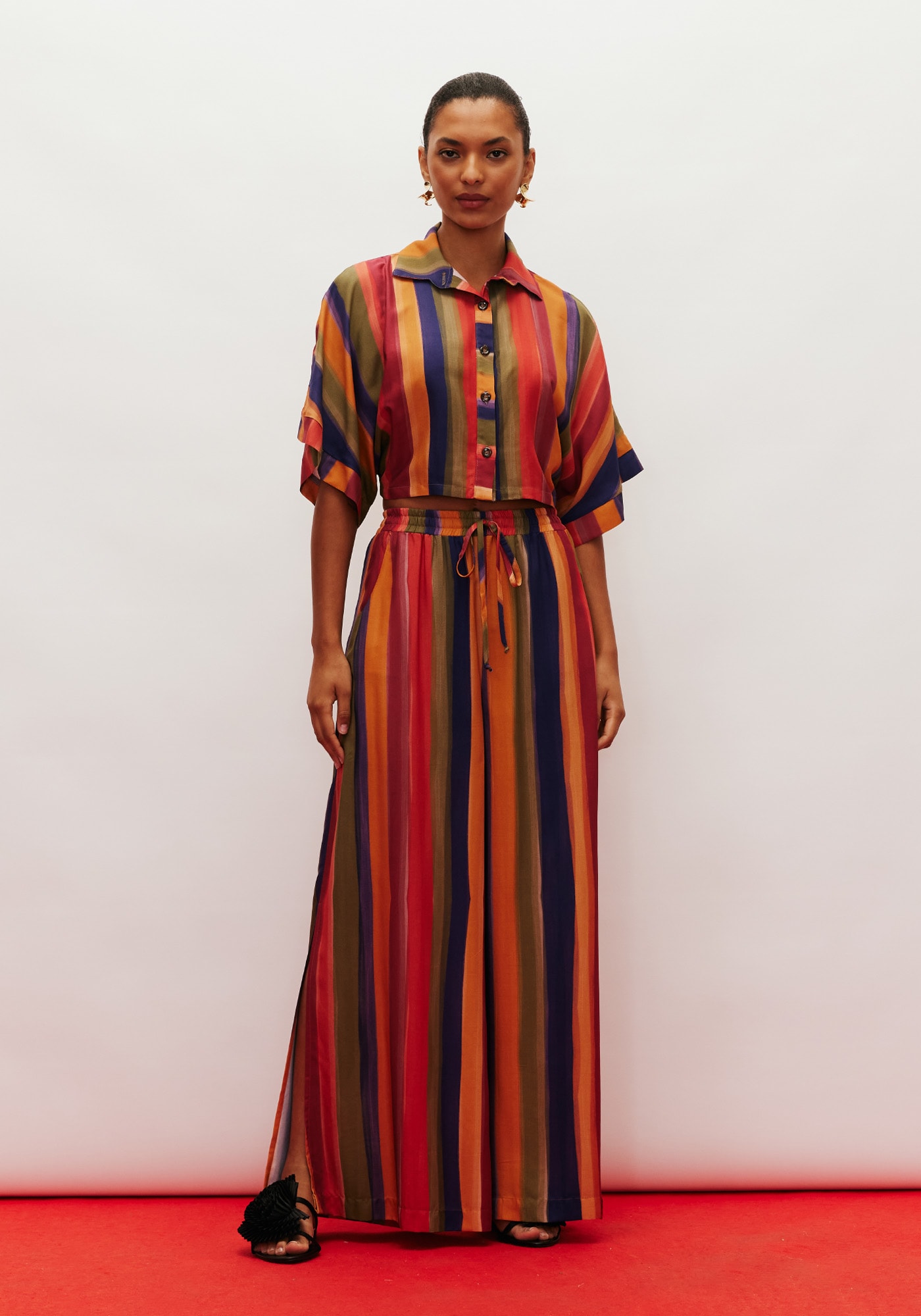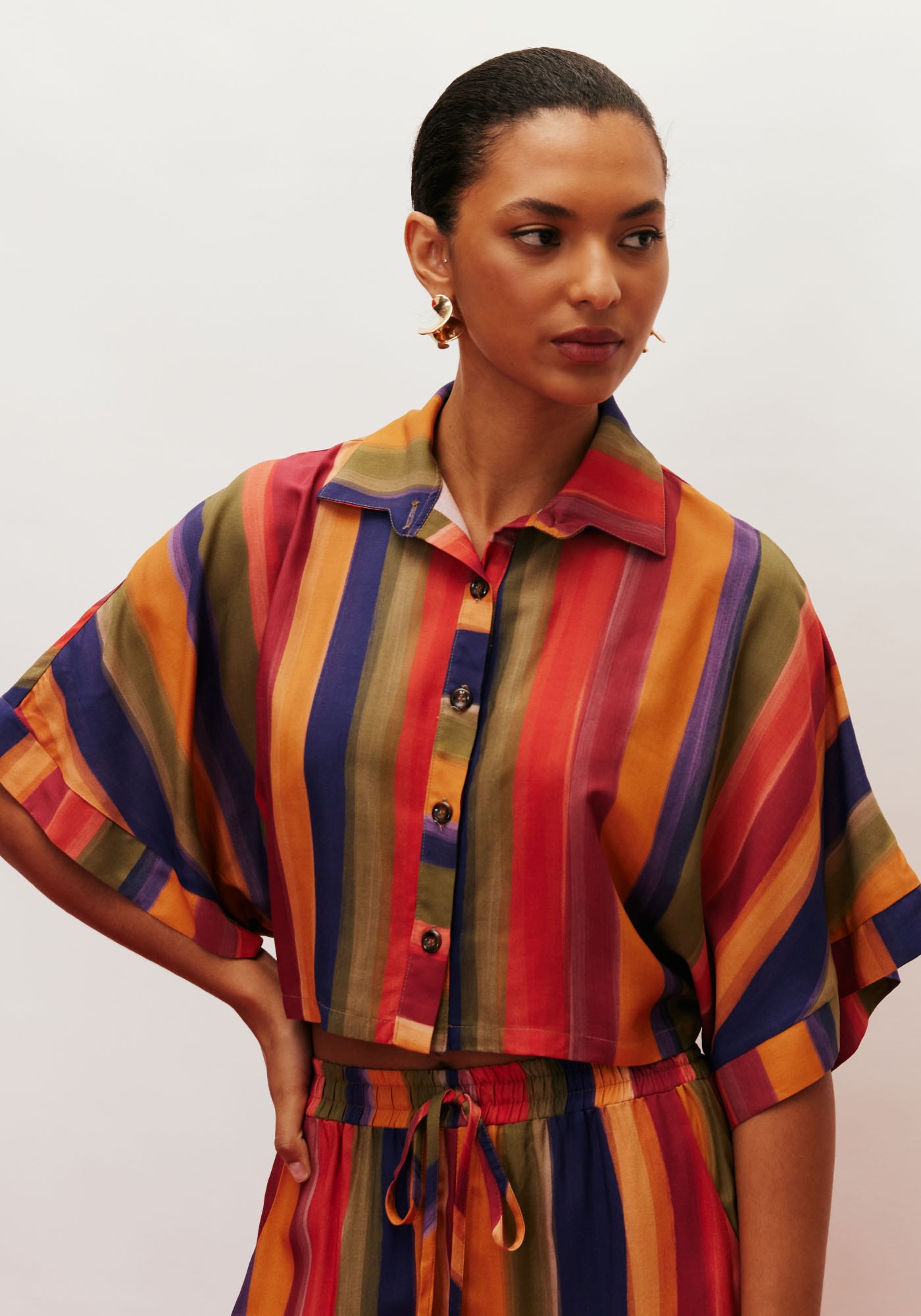 Confeccionada em tecido100% viscose, a camisa é uma peça colorida e sofisticada, perfeita para compor olook. O modelo possui manga estilo kimono, mais ampla abotoamento frontal e golinha.O comprimento cropped é super moderno.