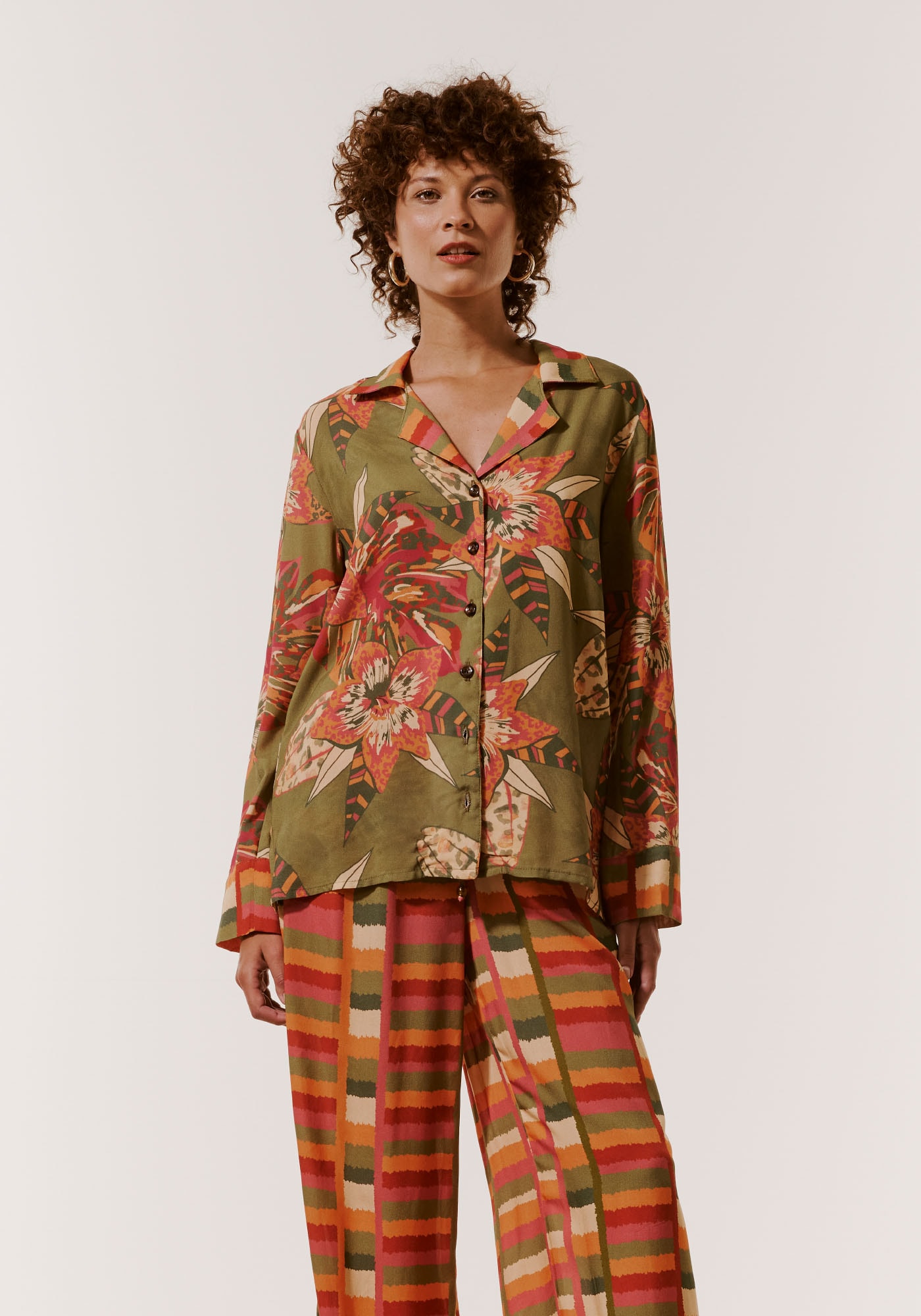A camisa é de botões é um modelo sofisticado e autêntico, quecontém um mix de estampas estiloso entre as estampas Flor do Cerrado e Ciranda,dando um toque moderno à peça. É confeccionada em tecido 100% viscose, comabotoamento frontal, manga longa e golinha.