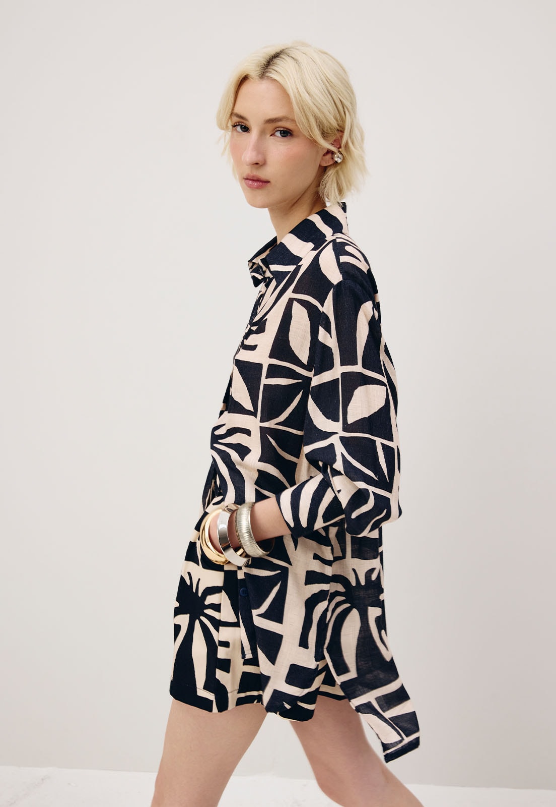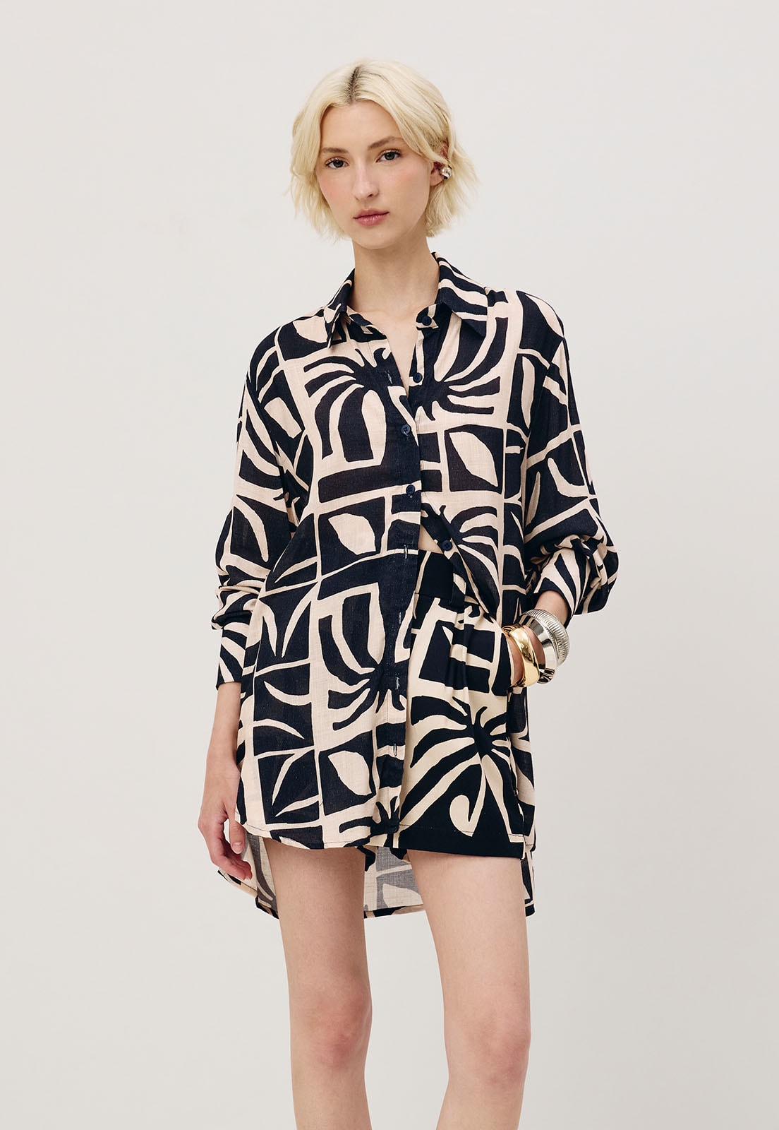 A blusa estampada Reflexo é confeccionada em tecido 96% viscose e 4% algodão. O modelo oversized possui abotoamento na parte da frente, podendo ser usada como terceira peça ou para completar o look como parte de cima.