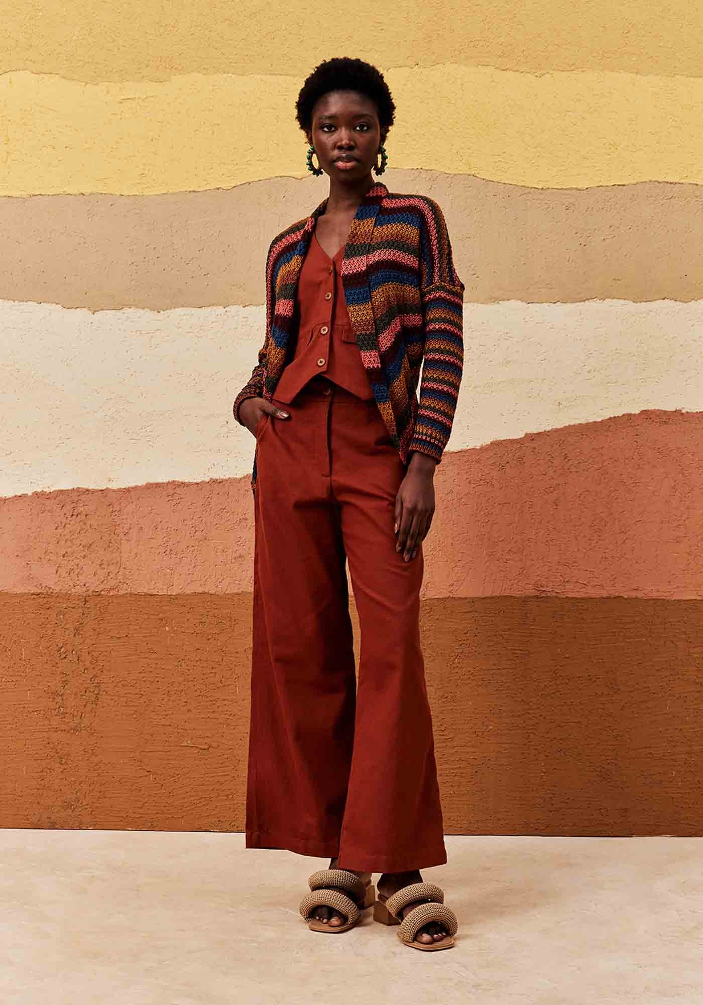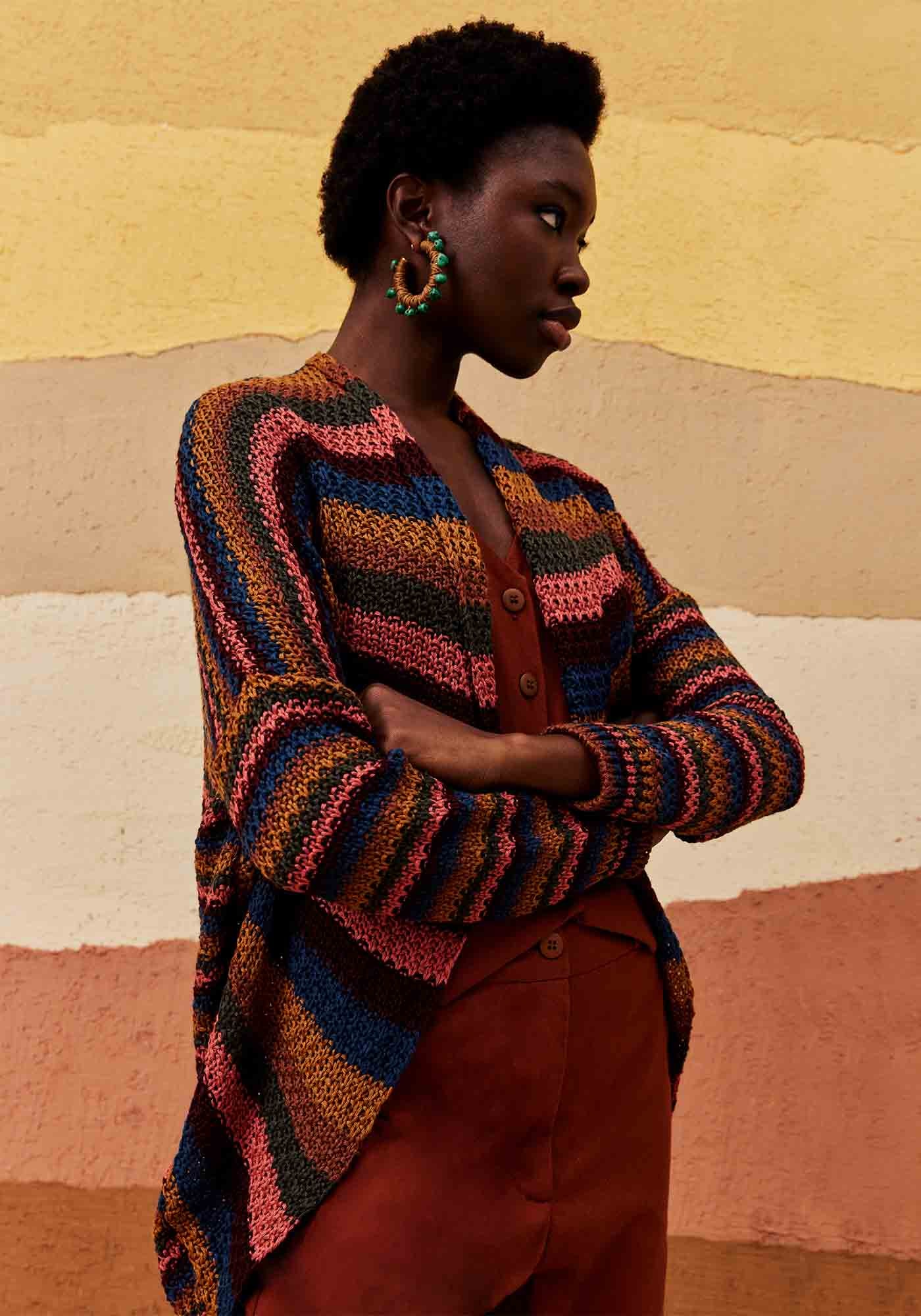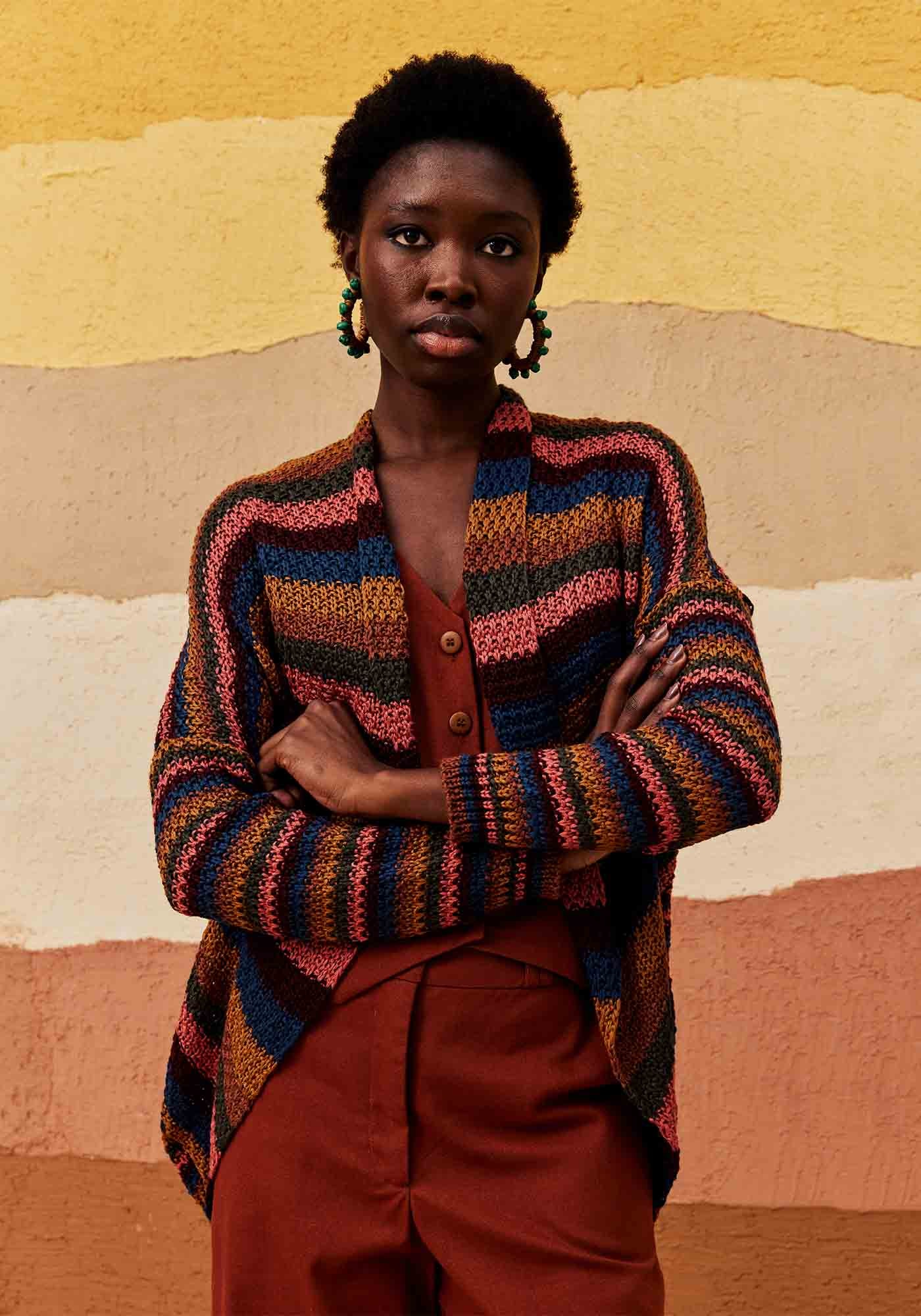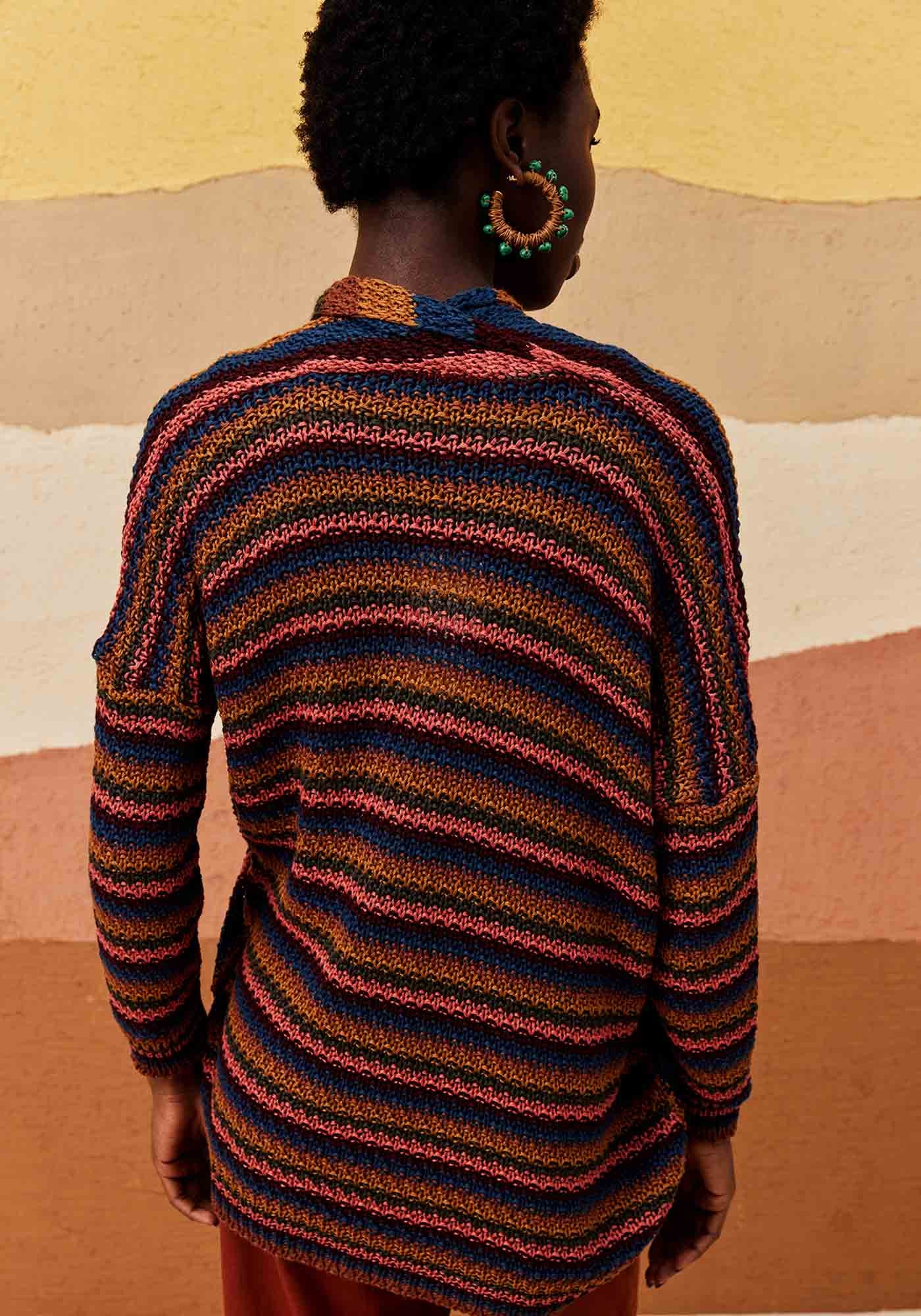 O casaco casulo é um modelo confortável e estiloso. Confeccionado em tricot, possui padronagem listrada colorida, que combina com diferentes estilosos e looks.