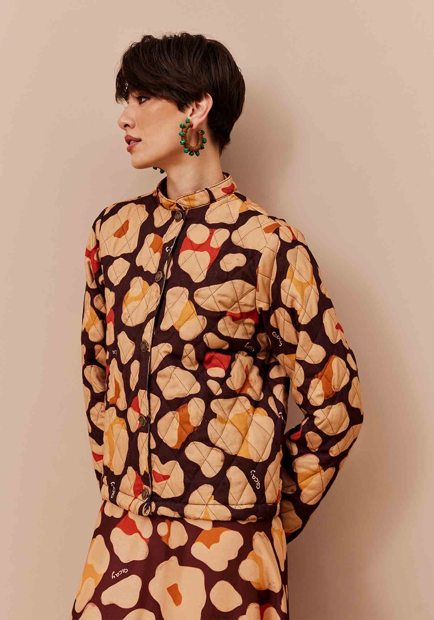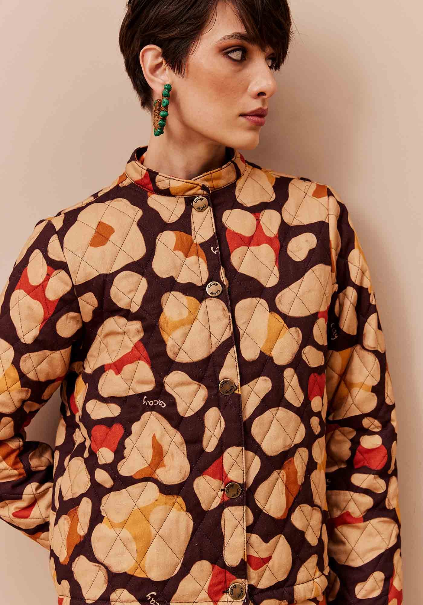 O casaco estampado Sami é confeccionada em tecido 100% algodão. O modelo puffer é macio, fofinho e quentinho e possui fechamento com botões de metal na parte da frente. O detalhe especial está no matelassê em todo o casaco.