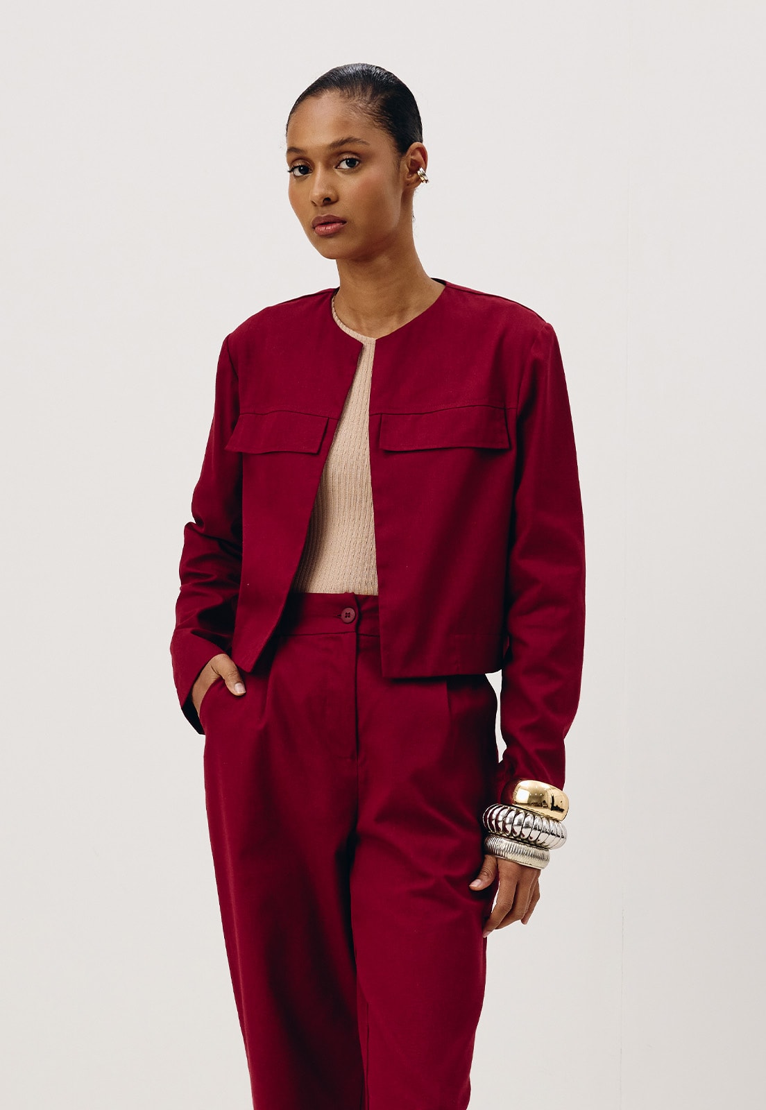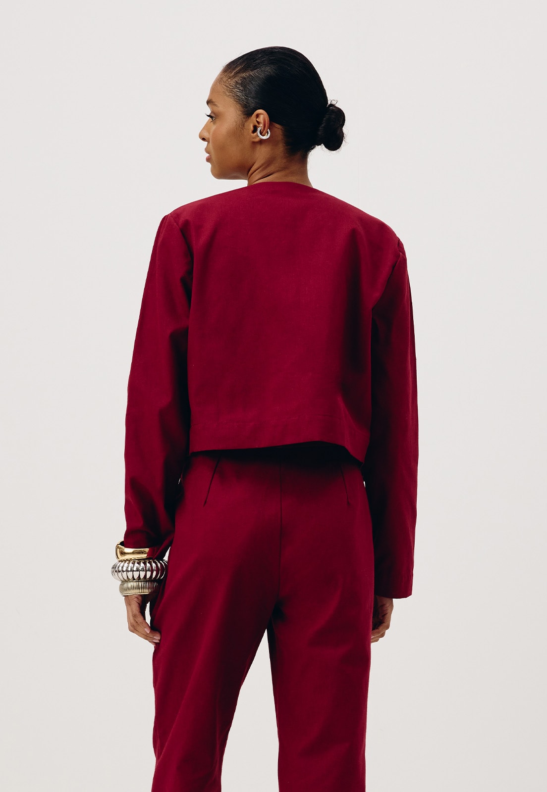 O casaco é confeccionado em tecido 100% algodão.É um modelo cropped aberto com recortes na parte da frente. Básico e elegante, é uma terceira peça versátil que combina com diversos looks.