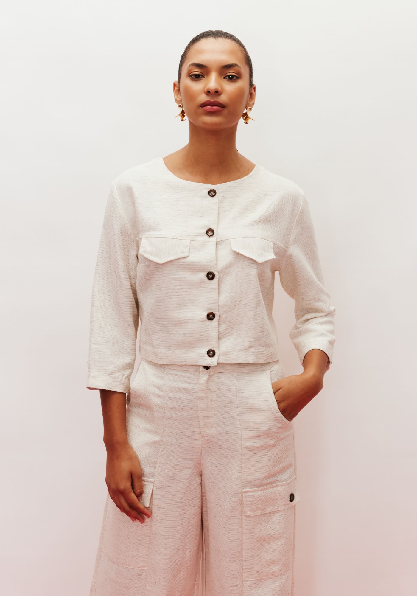 Confeccionado em tecido50% algodão 29% viscose 15% modal e 6% linho, o casaqueto é um modelo supercharmoso. A peça possui abotoamento frontal e manga 3/4, podendo ser usada comoterceira peça ou parte de cima.